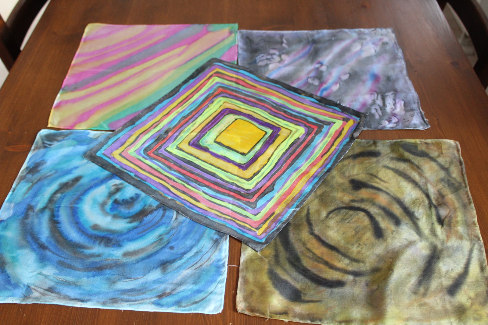 Fünf Tüchlein aus Seide mit verschiedenen linienförmigen Farbverläufen, ein Set Mini Seidentücher zum Spielen, Fühlen und Lernen.