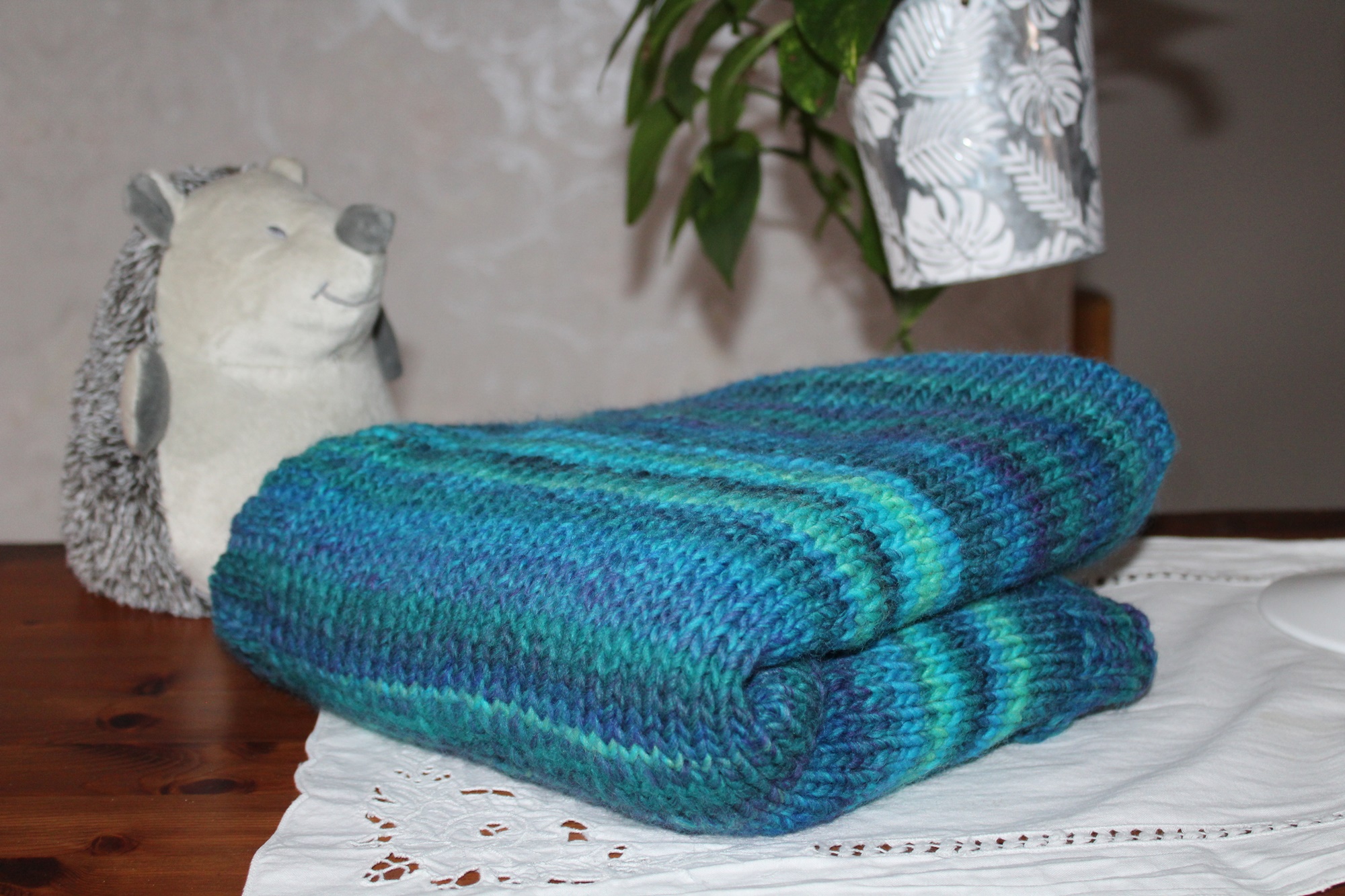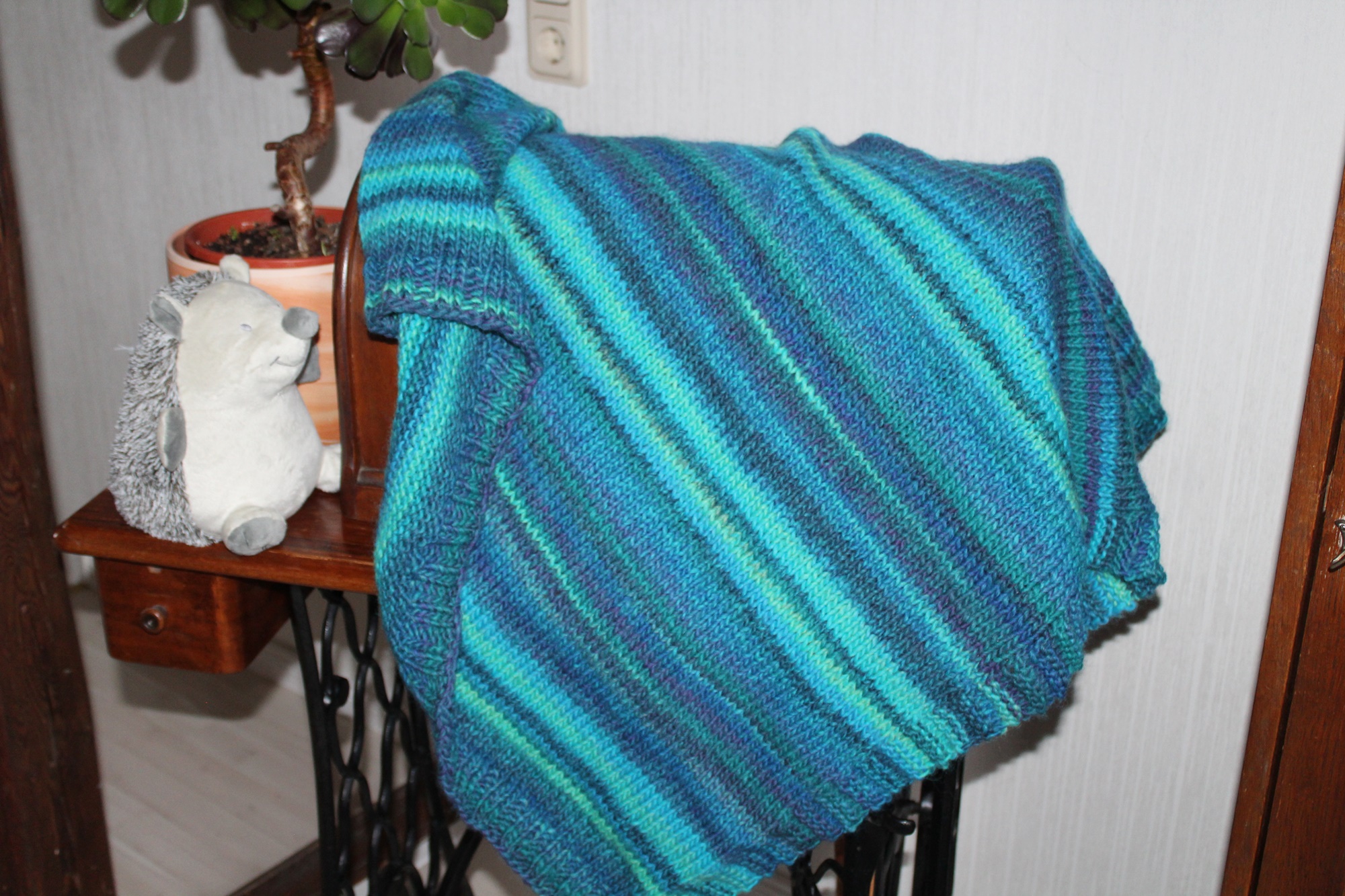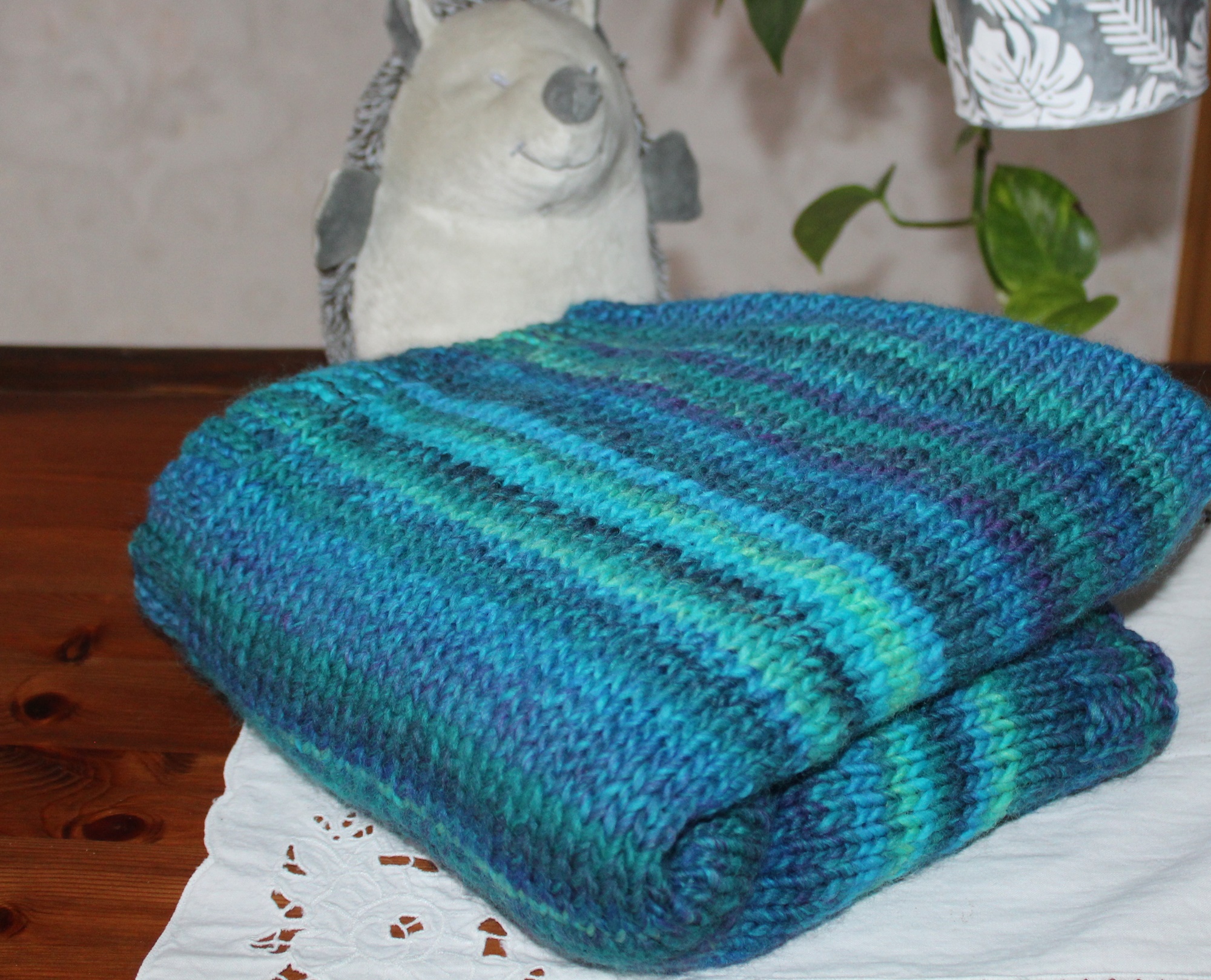 Blaue Decke, eine Babydecke oder kleine Sofadecke von Hand gestrickt. Die Farben dieser Wolldecke sind grüne und blaue Töne. Da durch das Farbspiel der Wolle ein Streifenmuster entstanden ist, wurde die Decke nur rechts gestrickt. Die Wolle ist relativ dick, so eine Art Grobstrick.