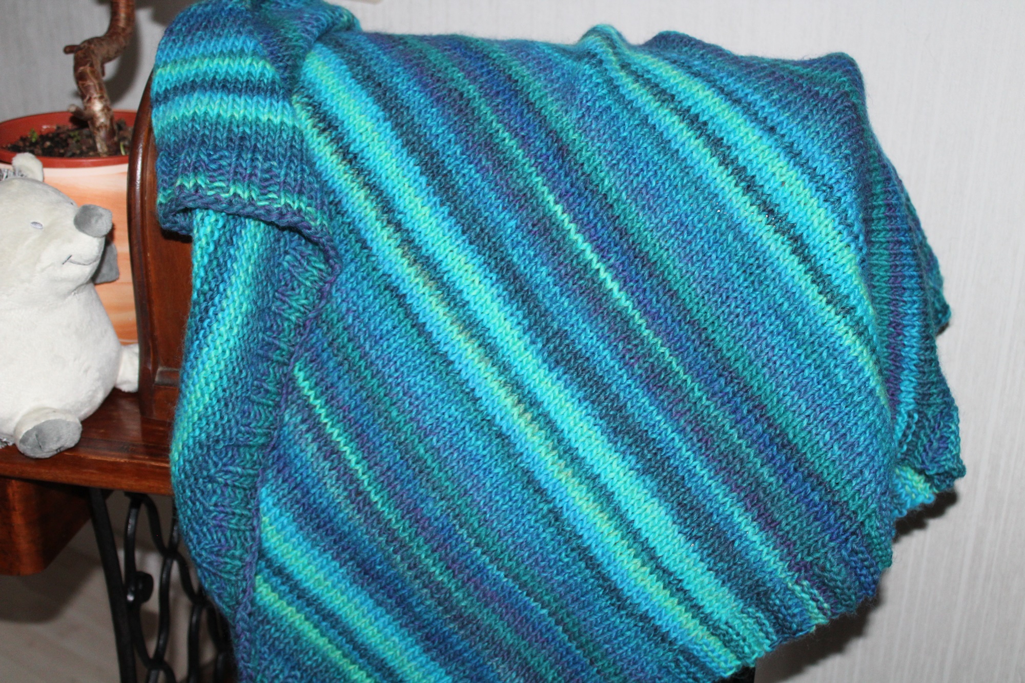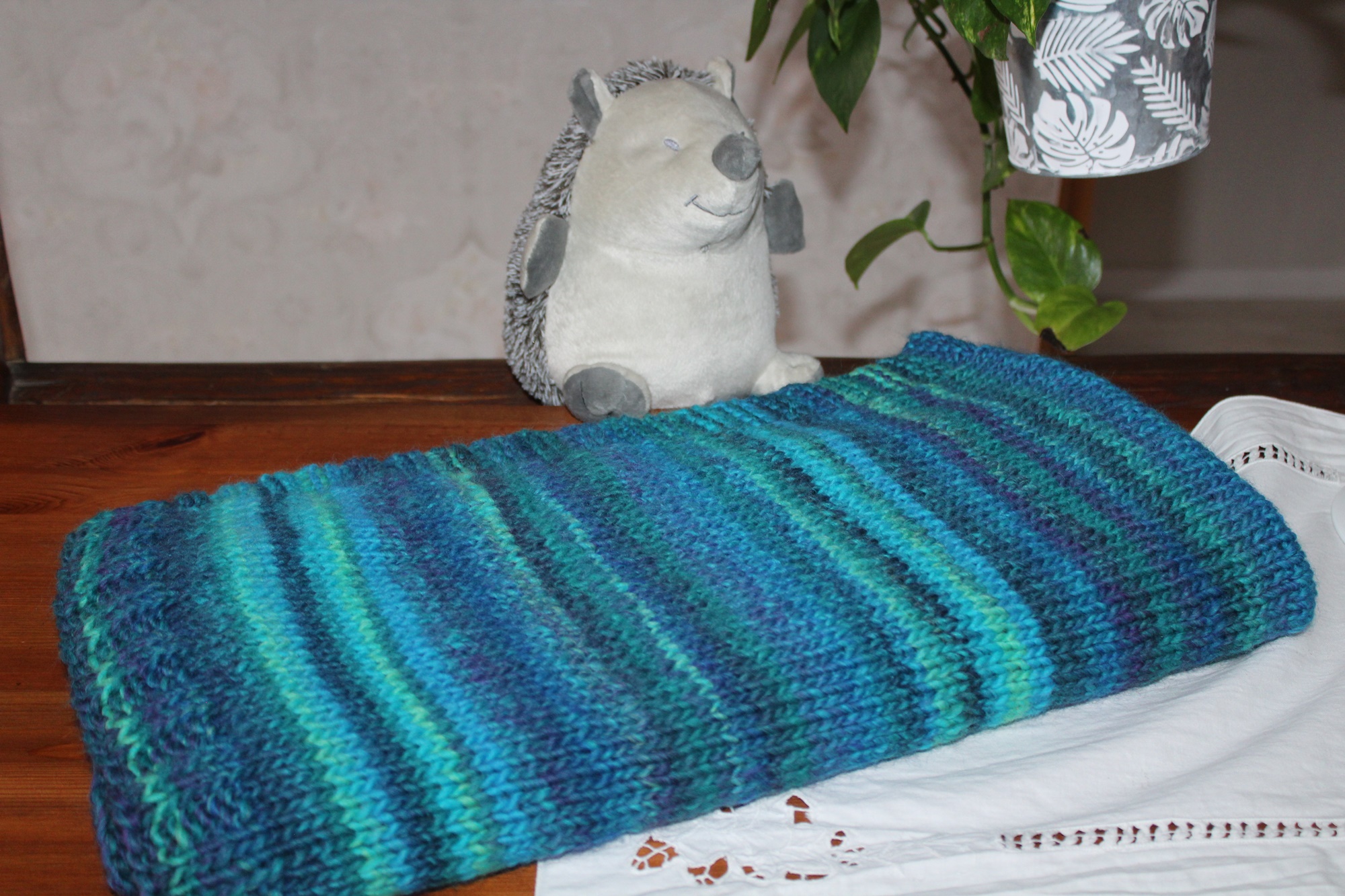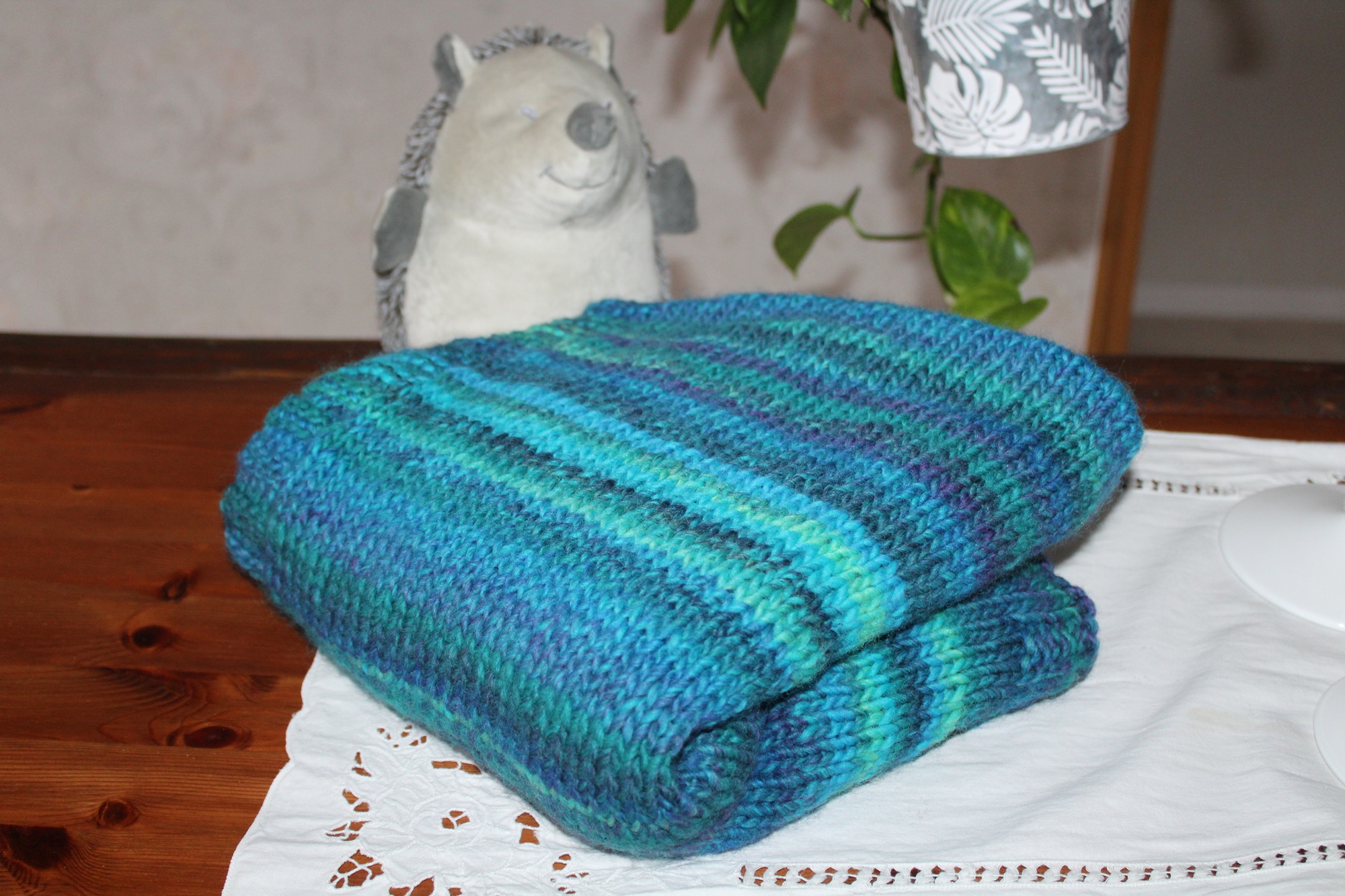 Blaue Decke, eine Babydecke oder kleine Sofadecke von Hand gestrickt. Die Farben dieser Wolldecke sind grüne und blaue Töne. Da durch das Farbspiel der Wolle ein Streifenmuster entstanden ist, wurde die Decke nur rechts gestrickt. Die Wolle ist relativ dick, so eine Art Grobstrick.