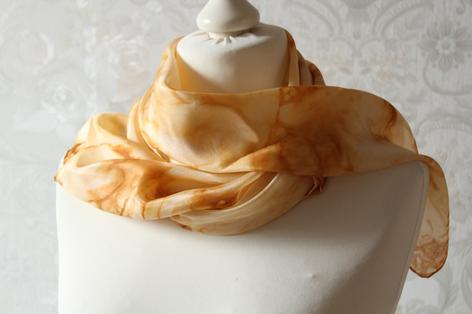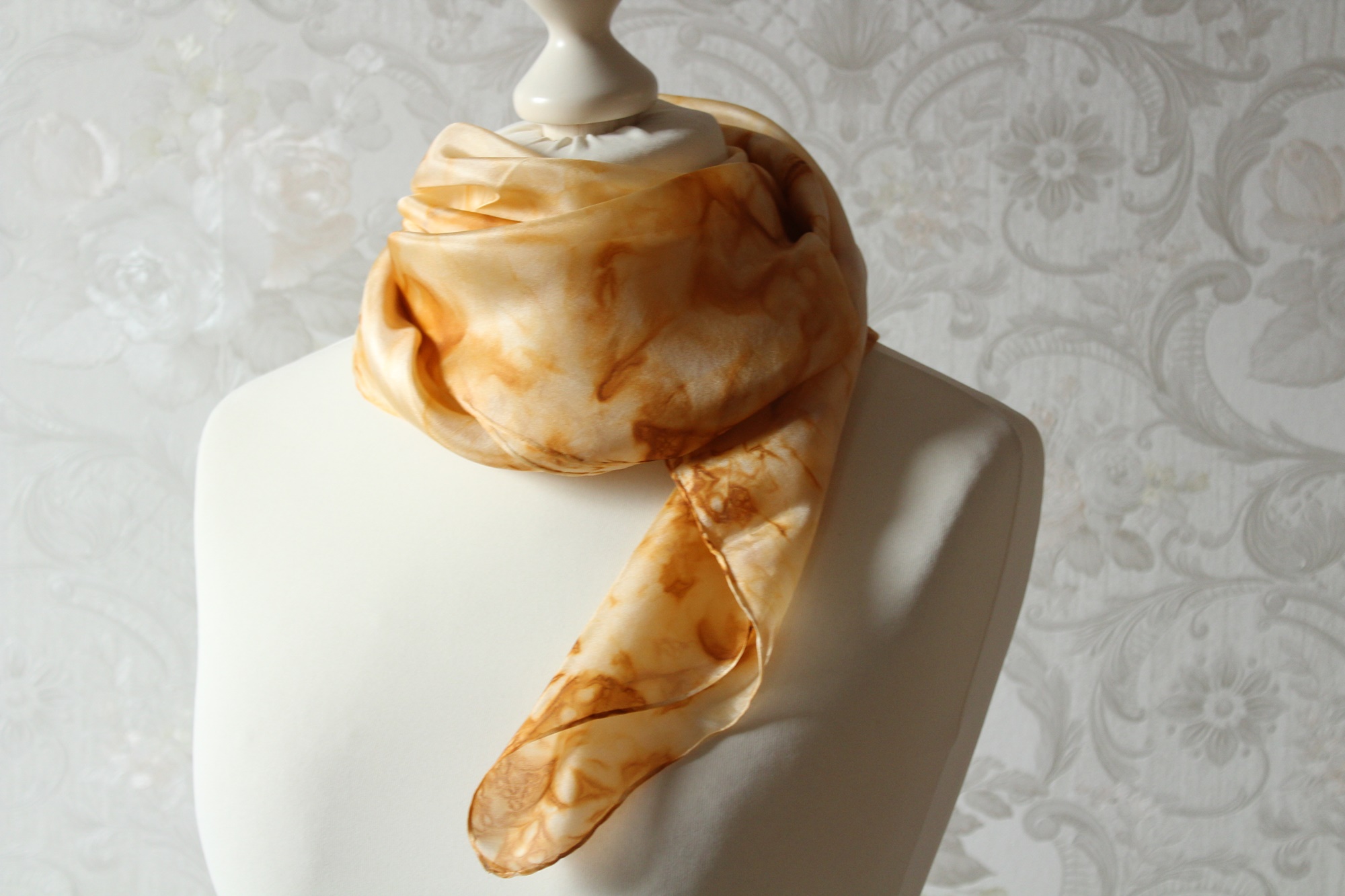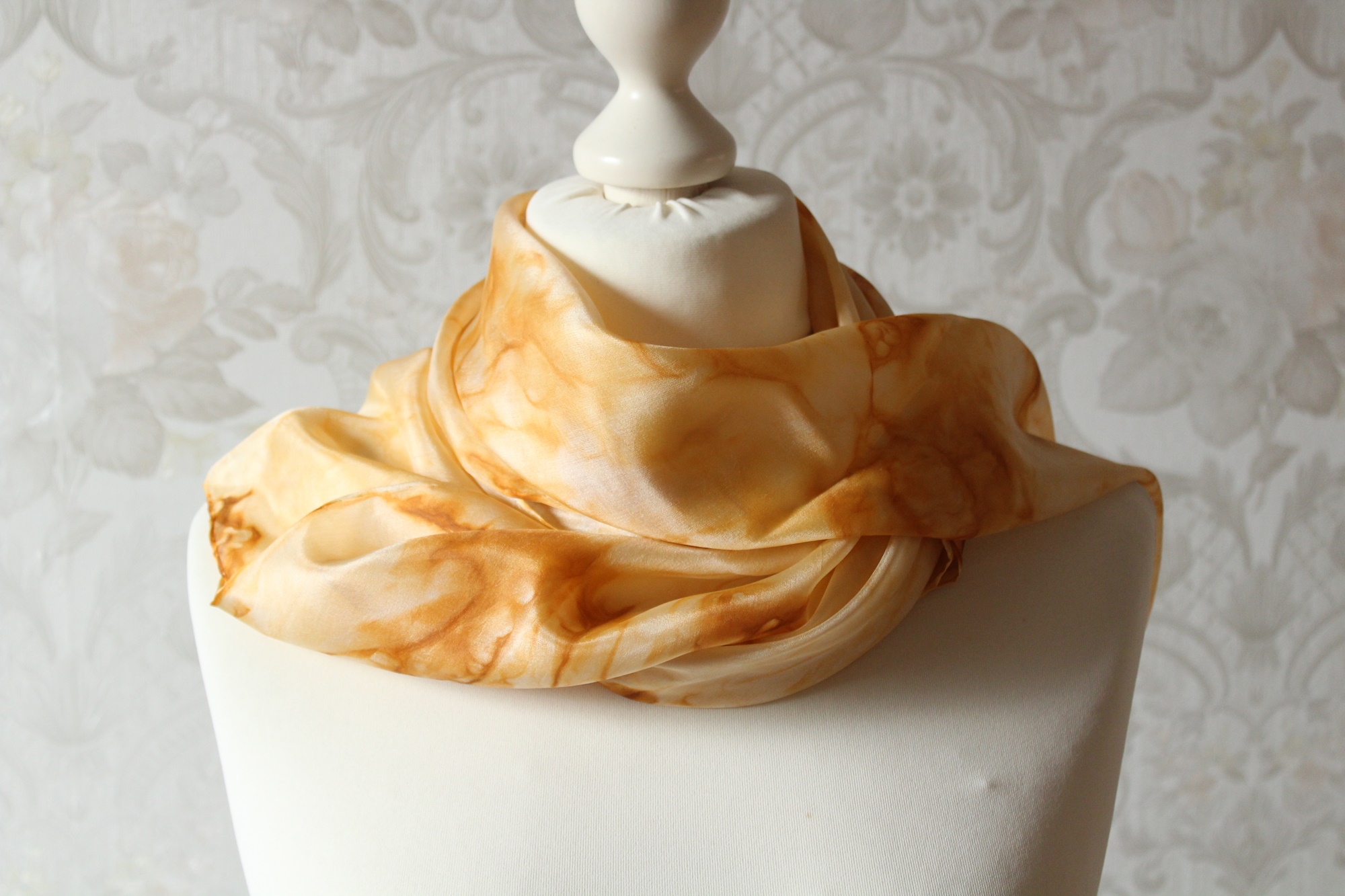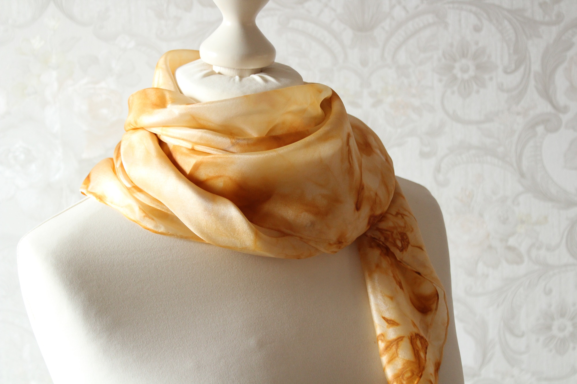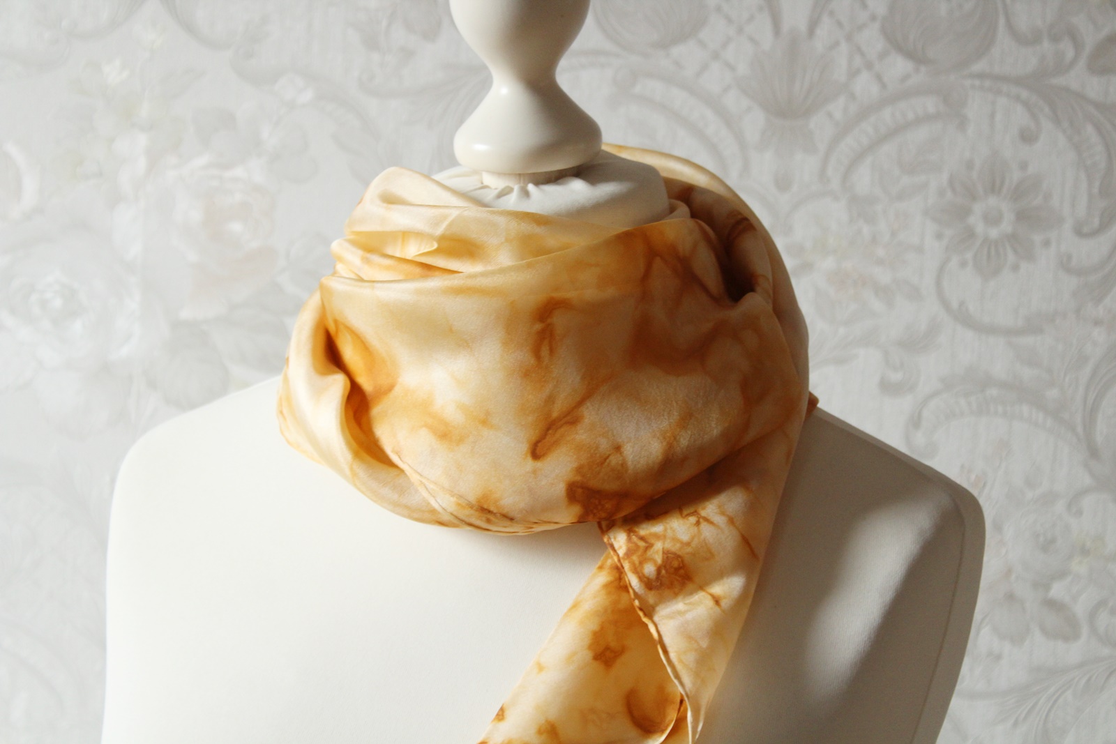 Das beige braune Tuch ist ein von Hand bemaltes Seidentuch aus der Reihe Farbgeflüster. Miteinander geflüstert haben bei diesem Seidentuch verschiedene Farbtöne der Farben Braun, Beige und Ocker.