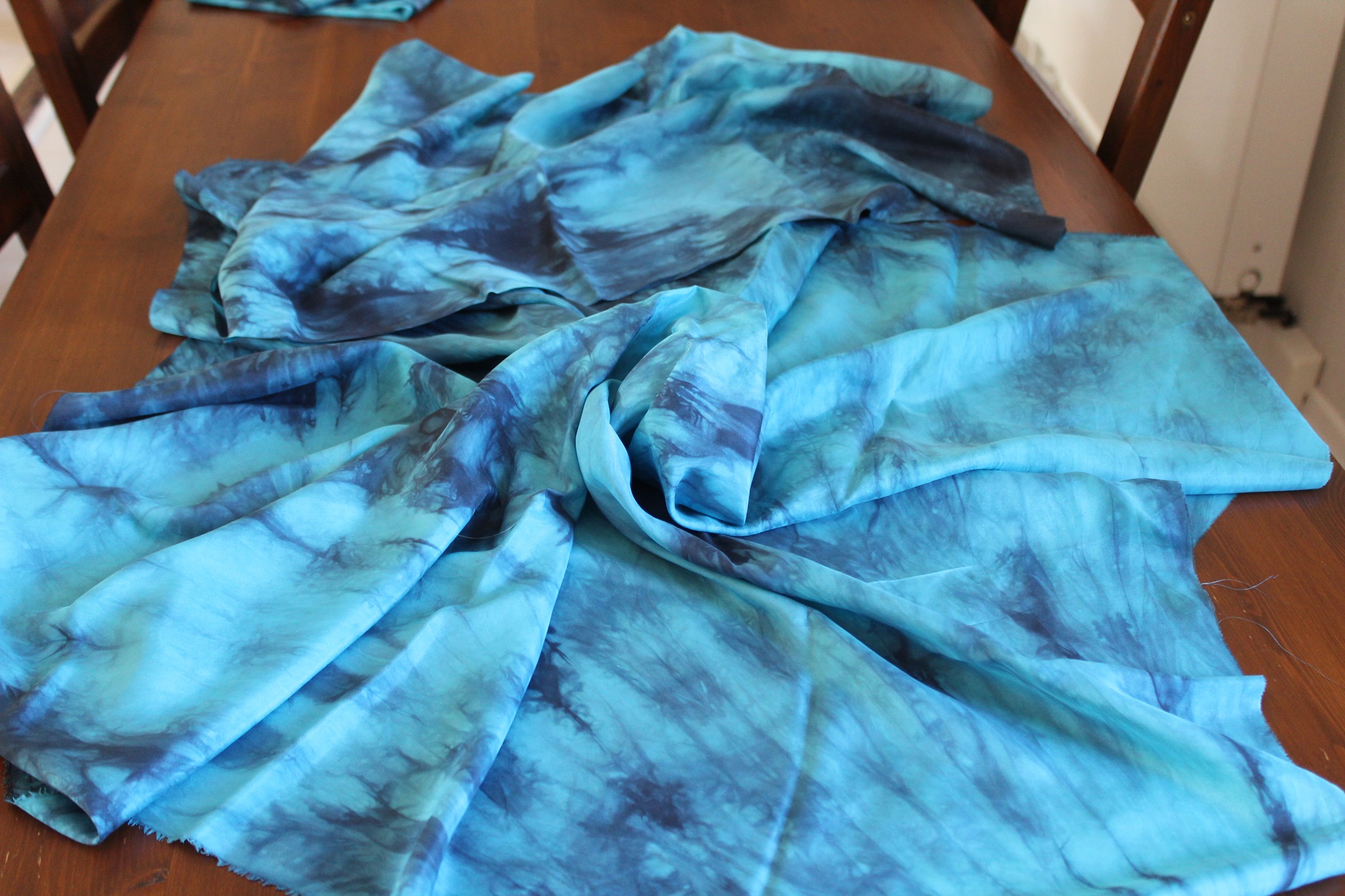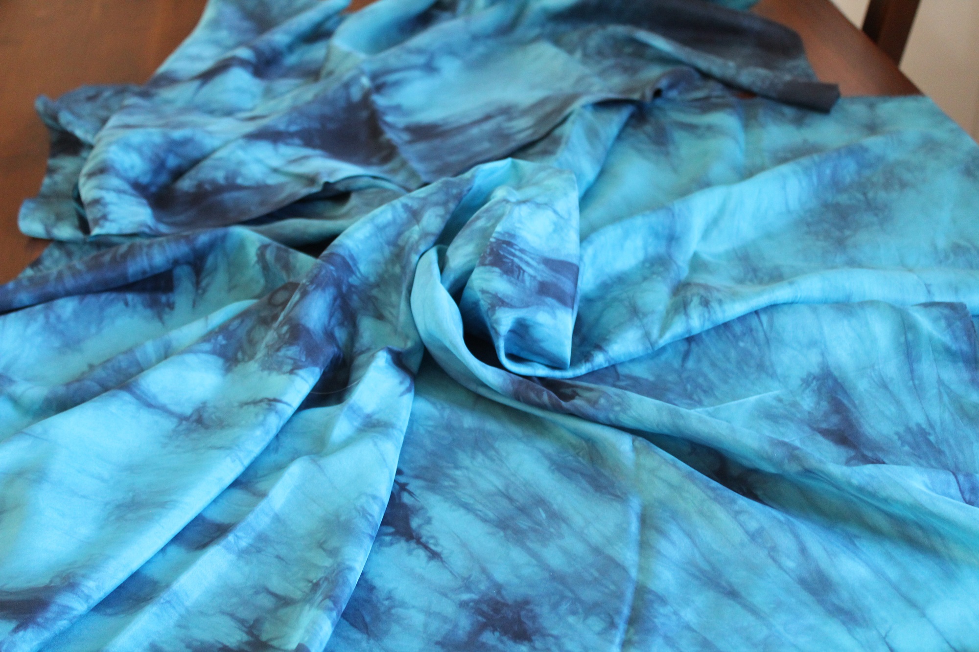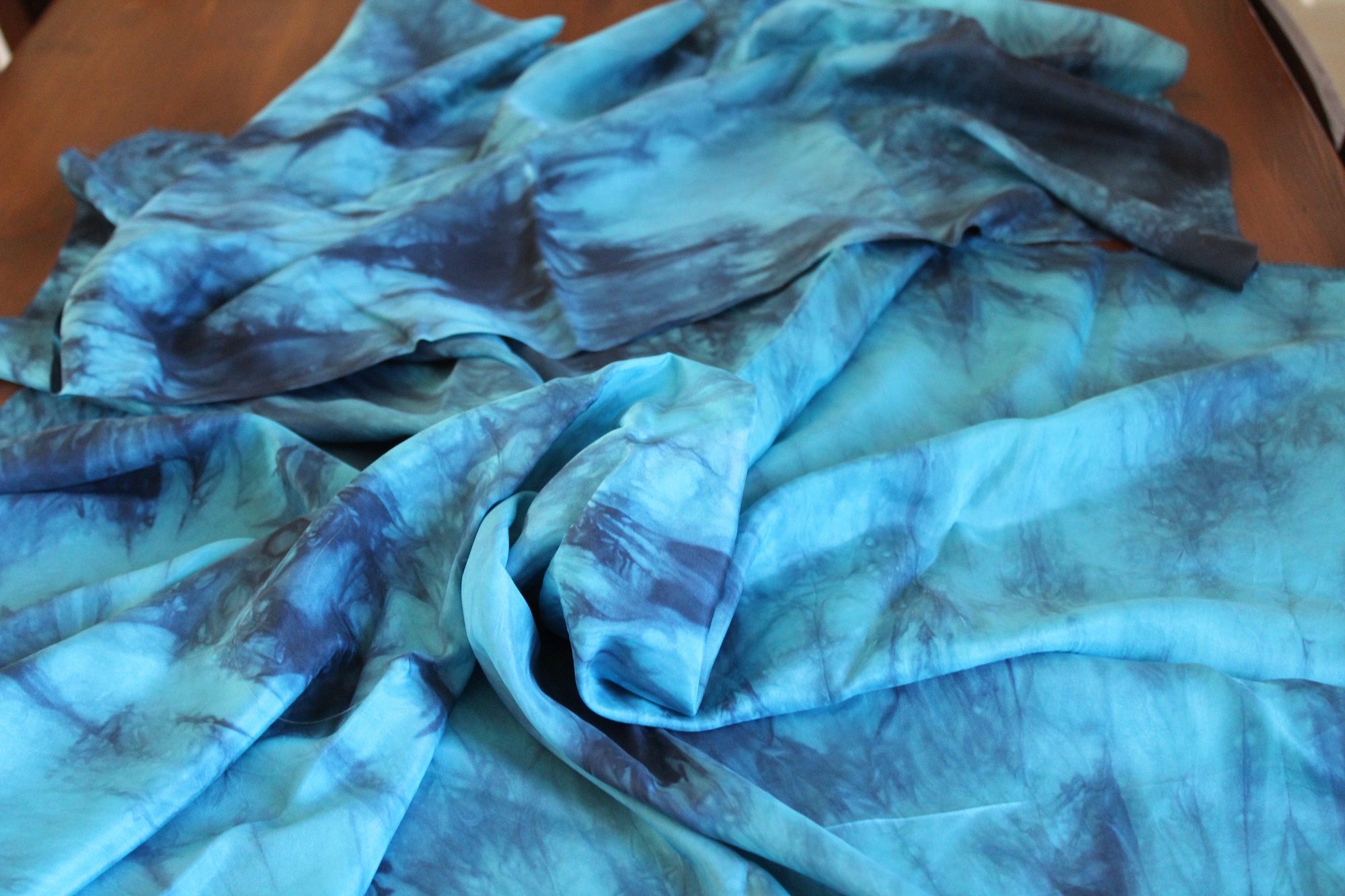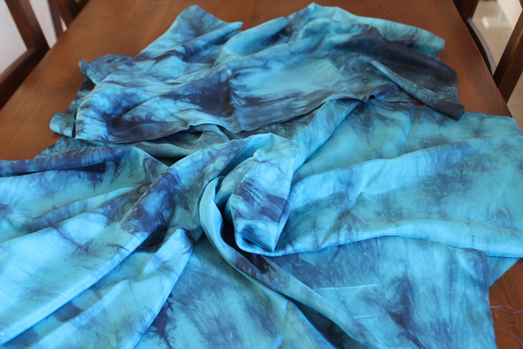 Handbemalter Seidenstoff, ein besonderer Stoff zur kreativen Weiterverarbeitung. Miteinander geflüstert haben bei dieser Seide verschiedene blaue Farbtöne, ein helles und ein dunkles Blau. Das Muster ist ein Batikmuster und entsteht beim Malen eher zufällig.