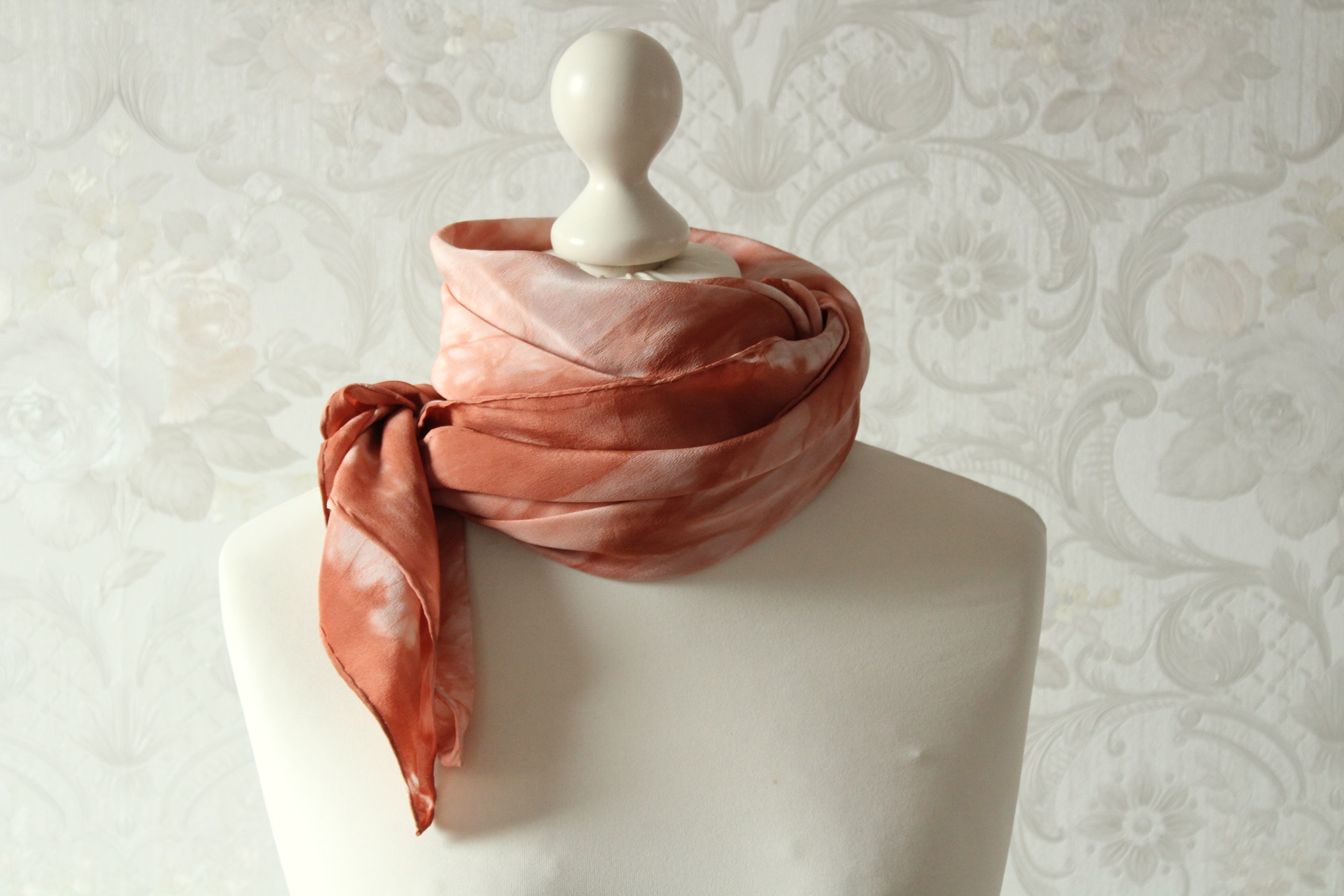 Das Seidentuch ist ca. 80 x 80 cm groß. Die Seidenart ist eine stabile Crepe de Chine Seide. Diese ist etwas rauer als die übliche Ponge Seide und hat eine leicht strukturierte Oberfläche.