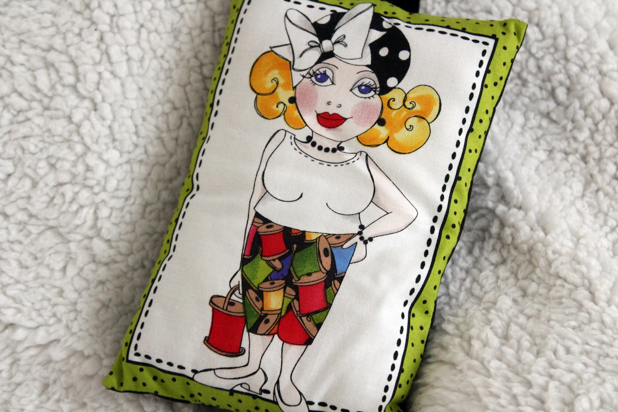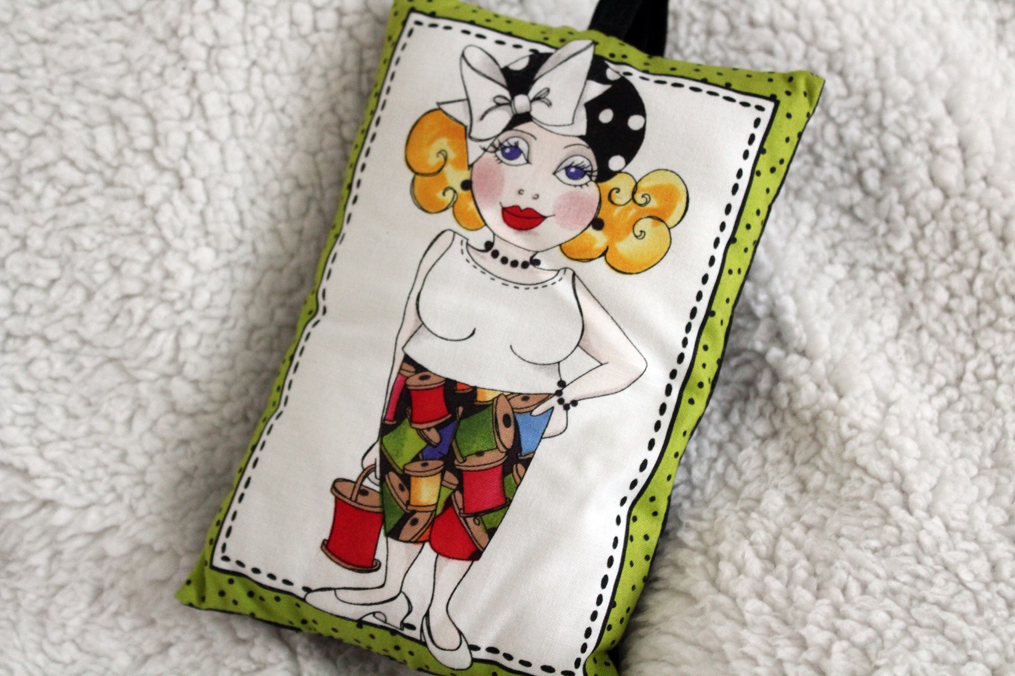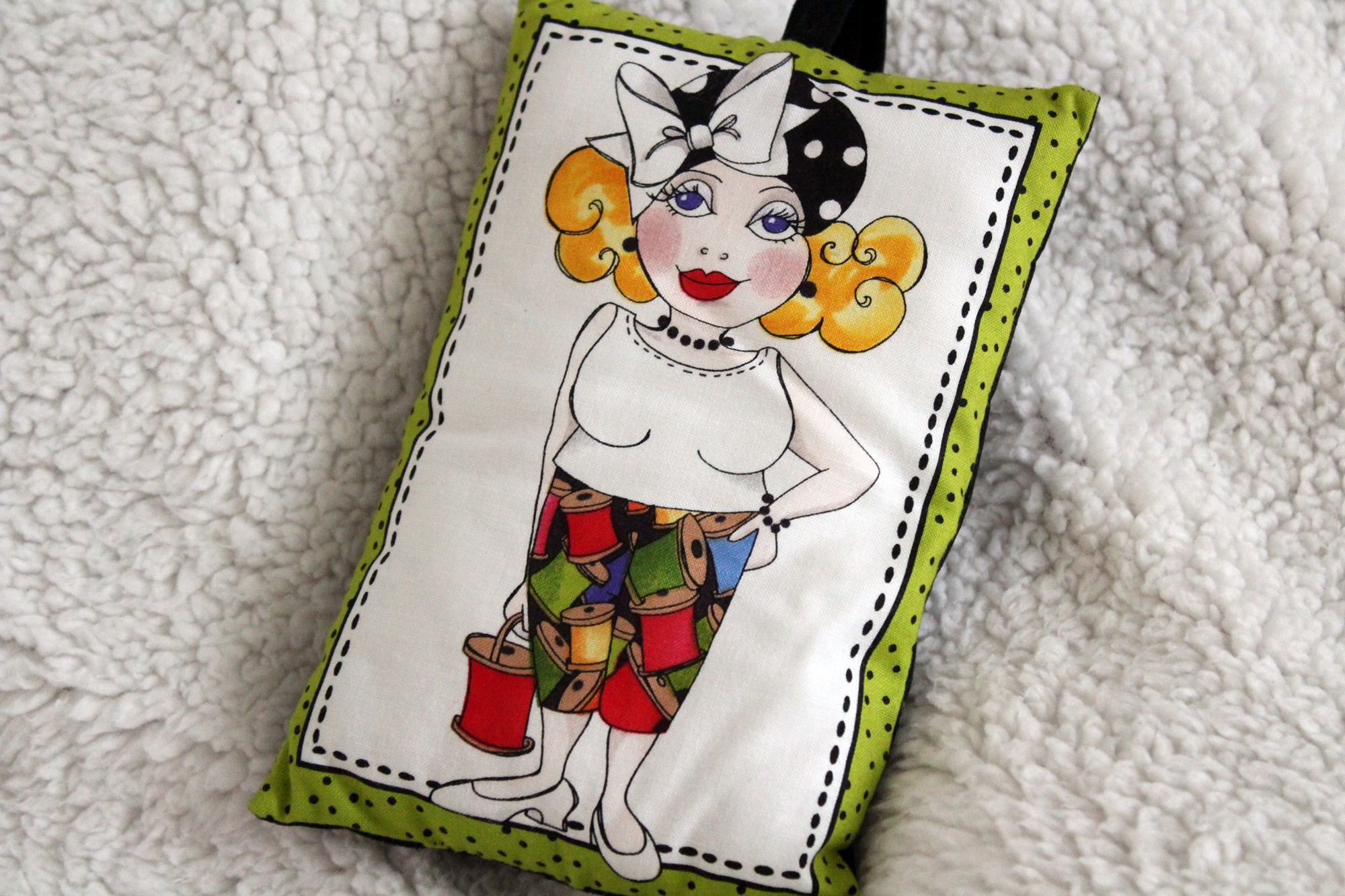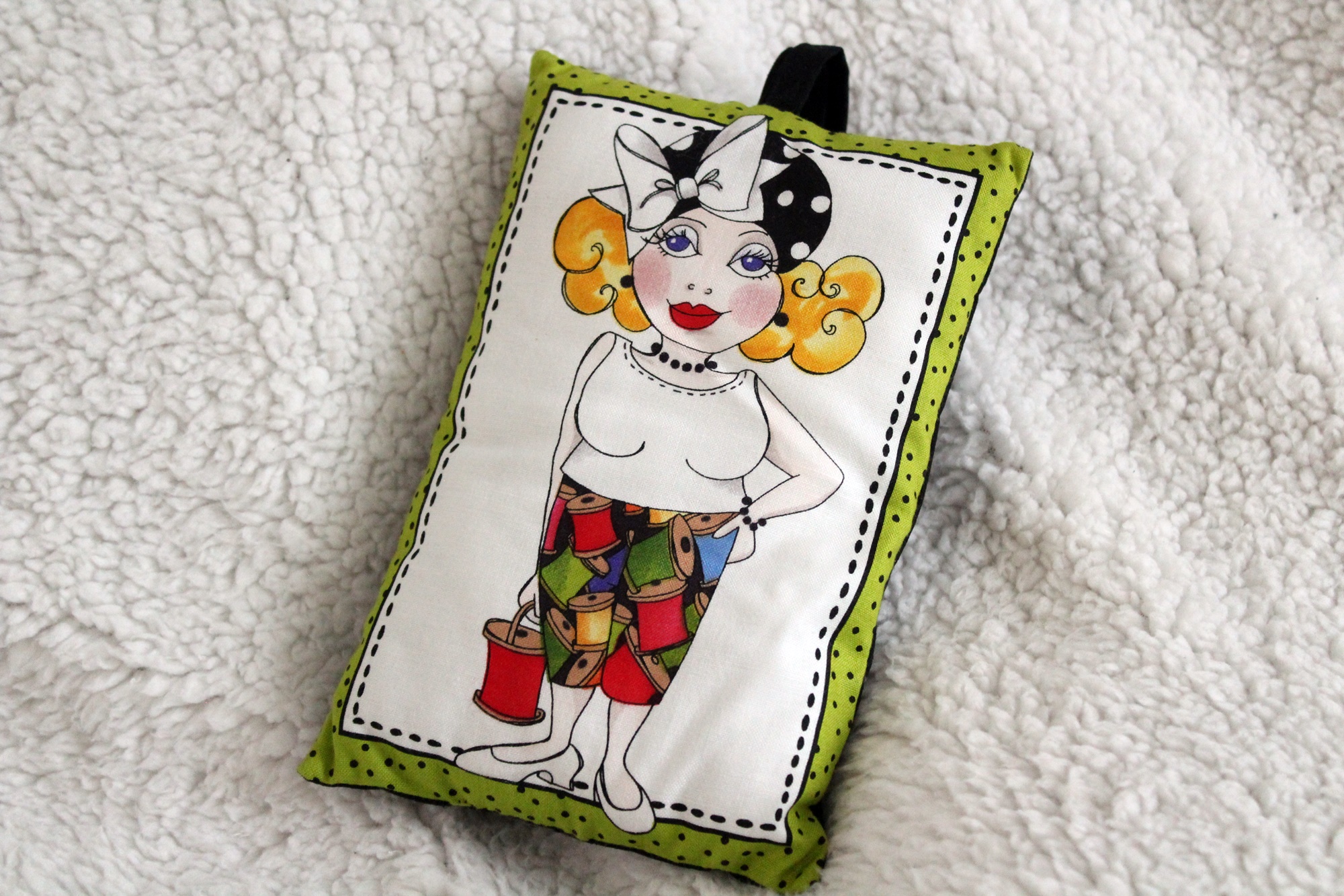 Das Kissen ist ca. 13 x 17 cm groß. Es ist aus Baumwollstoff genäht. Vorn ist ein Bildmotiv mit einer taffen Frau. Hinten ist das Kissen einfarbig schwarz. Einen Henkel zum Aufhängen hat es auch..
