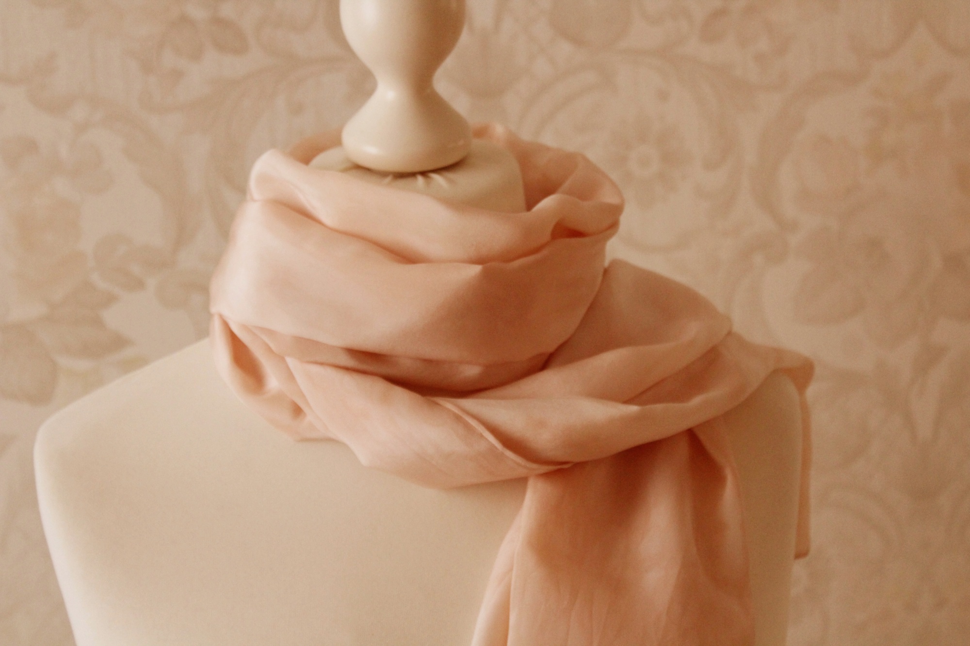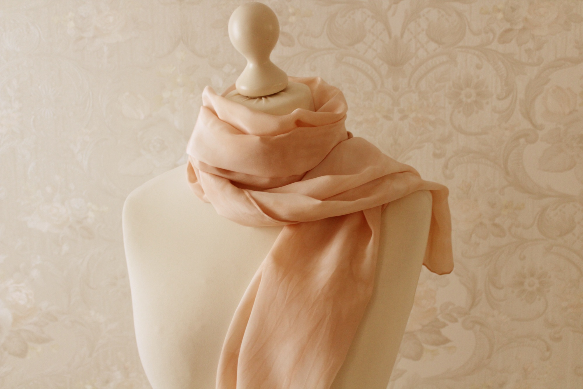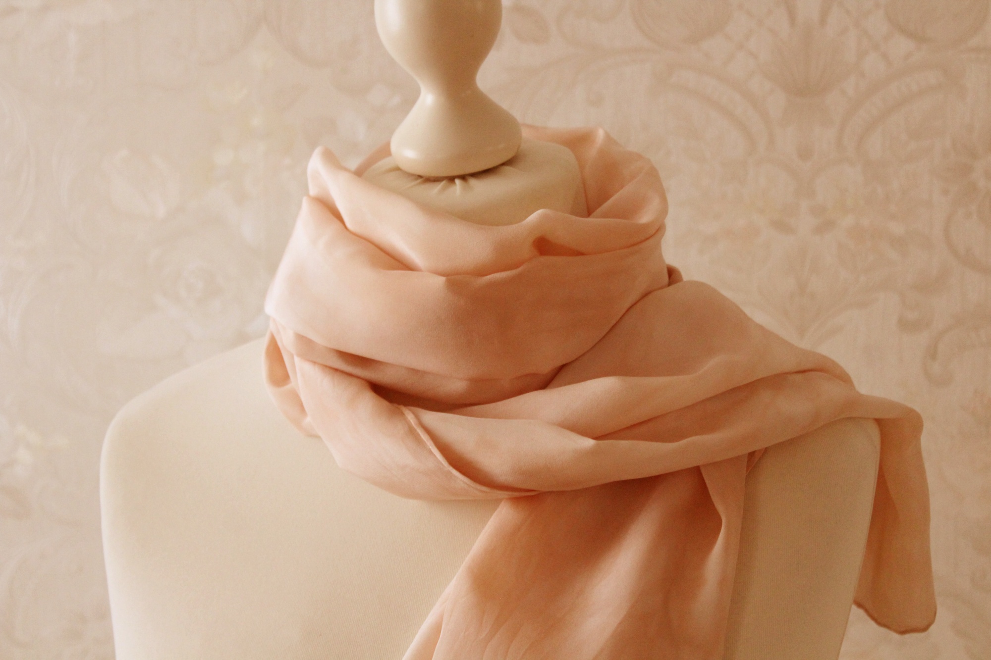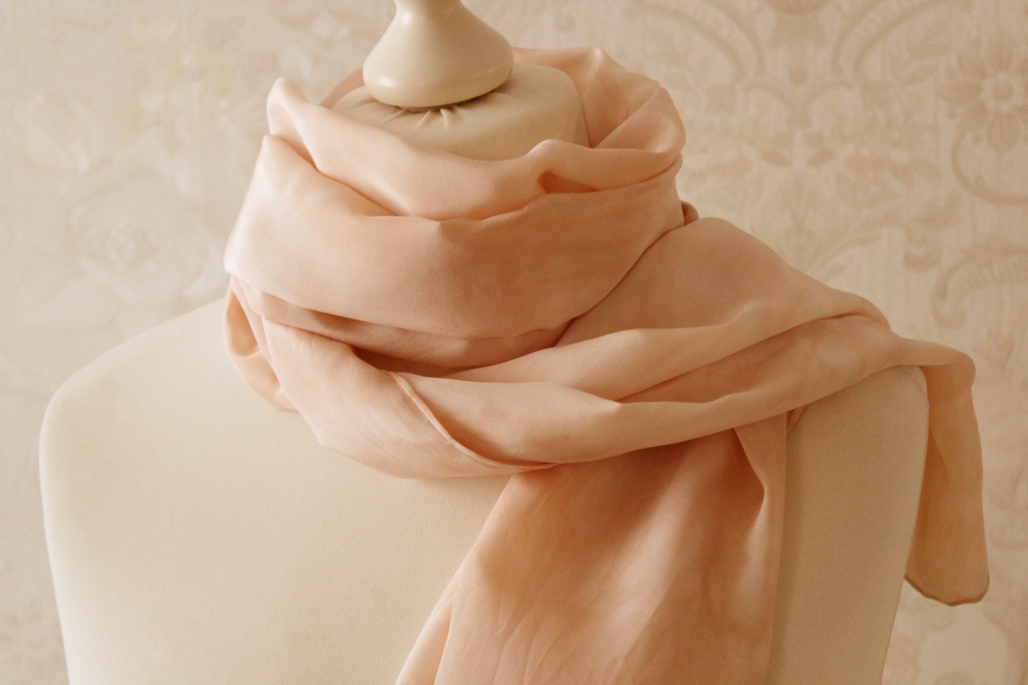 Der elegante hellbeige Schal aus Seide ist in Handarbeit gefertigt. Er hat leichte Farbverläufe als Muster. Er ist recht lang, ca 170 cm.