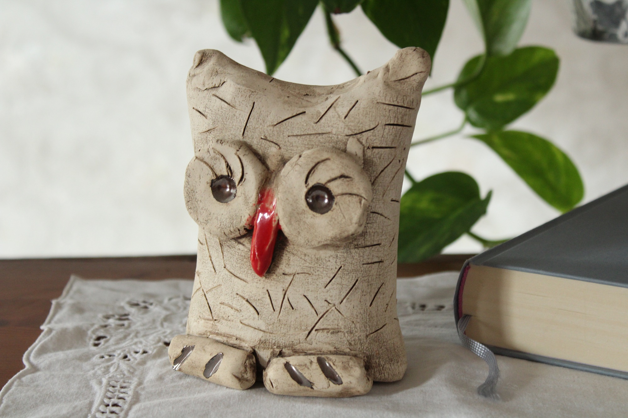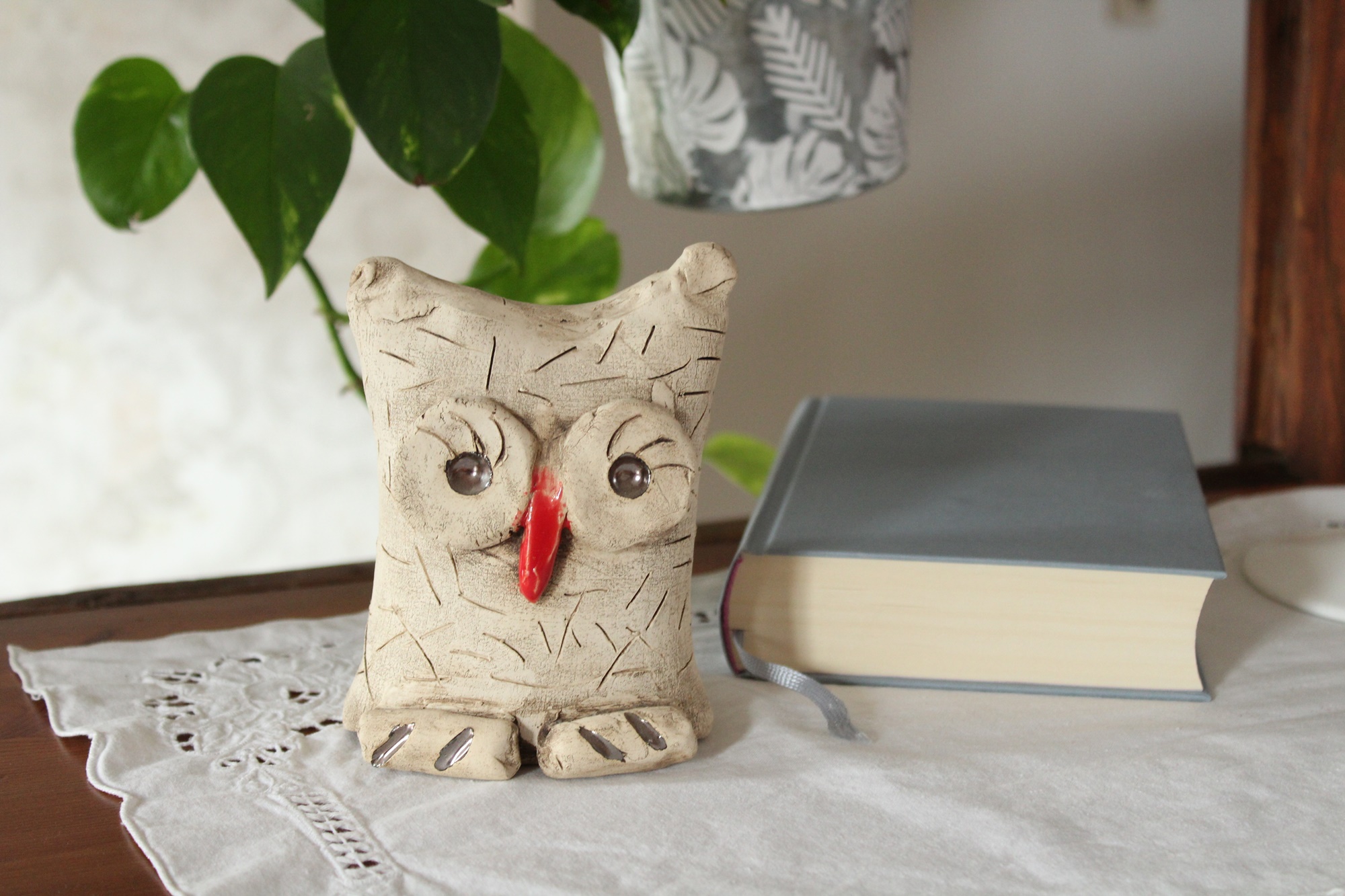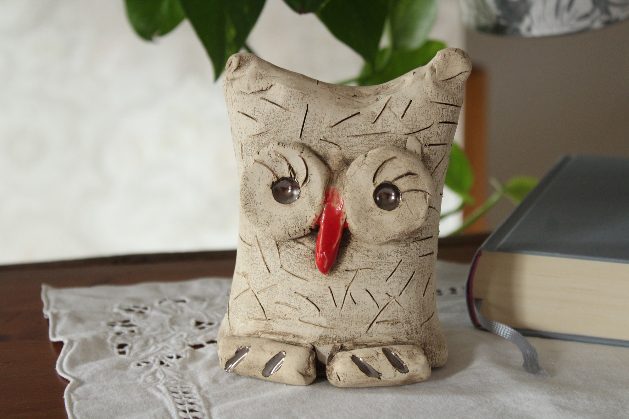 Eule aus Keramik, Töpferei Handarbeit. Die Eule ist 13 cm hoch. Die Farbe ist Natur, Augen und Schnabel sind glasiert und setzen einen tollen Akzent. Sie ist von Hand geformt und recht schwer. So kann sie auch im Außenbereich verwendet werden. (im Winter würde ich sie reinnehmen)