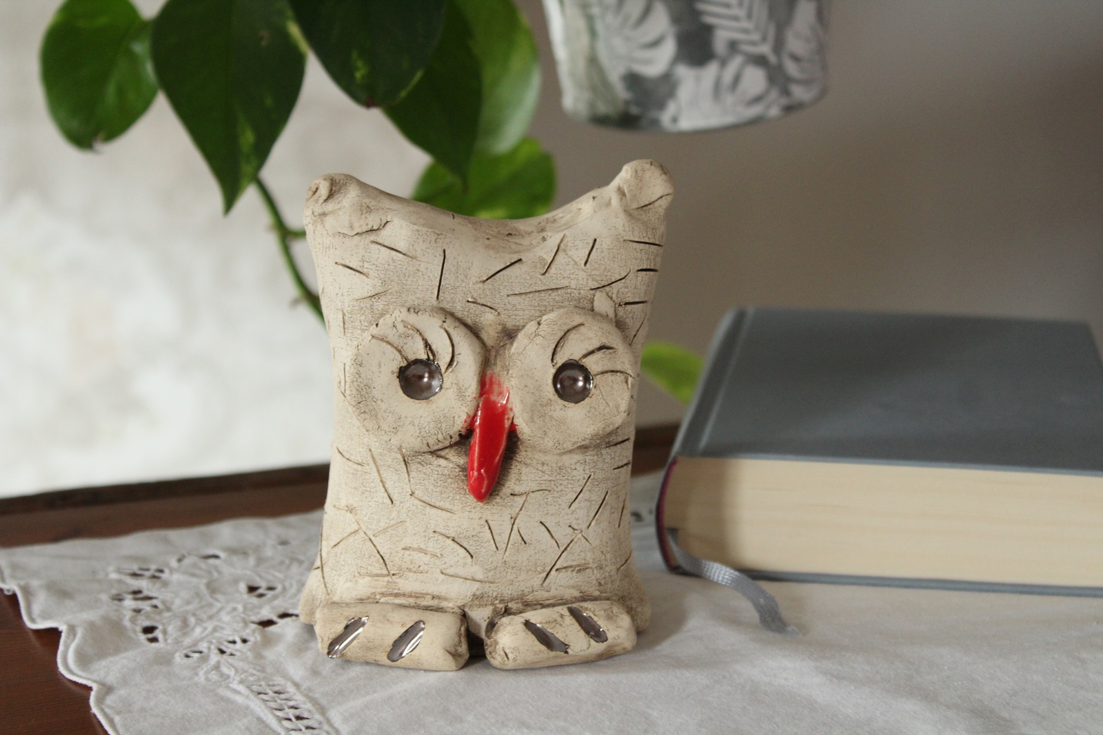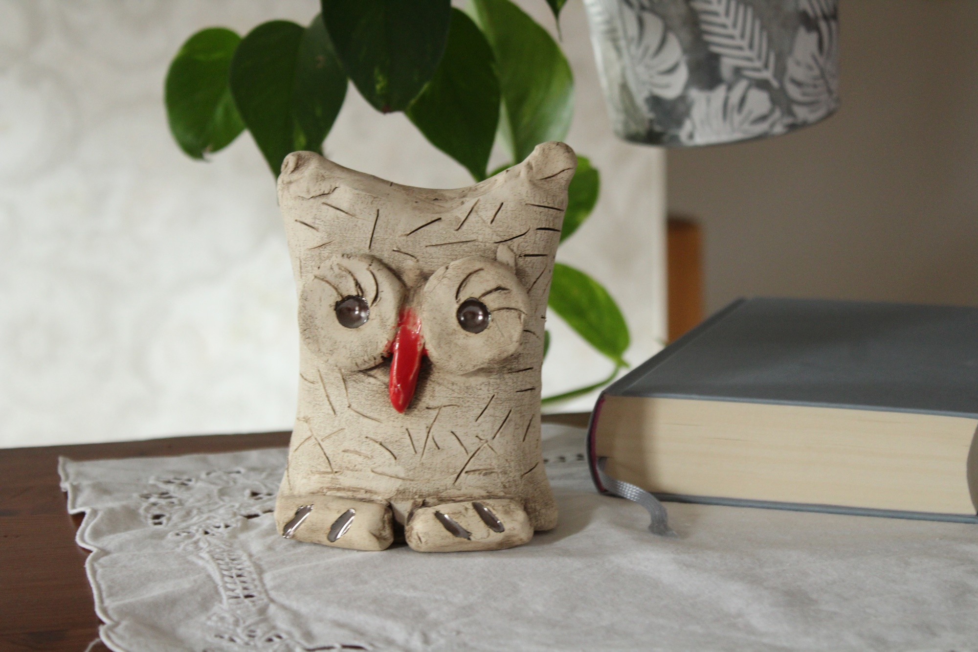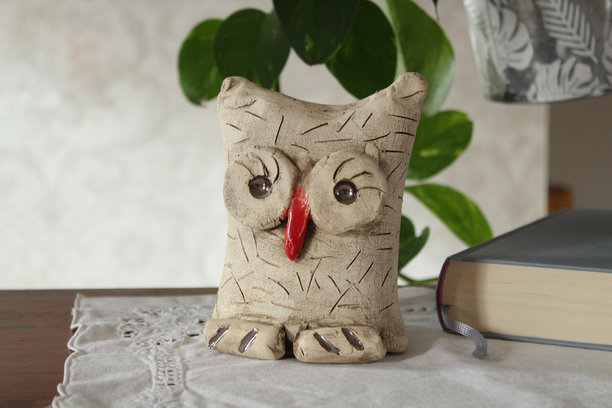 Eule aus Keramik, Töpferei Handarbeit. Die Eule ist 13 cm hoch. Die Farbe ist Natur, Augen und Schnabel sind glasiert und setzen einen tollen Akzent. Sie ist von Hand geformt und recht schwer. So kann sie auch im Außenbereich verwendet werden. (im Winter würde ich sie reinnehmen)