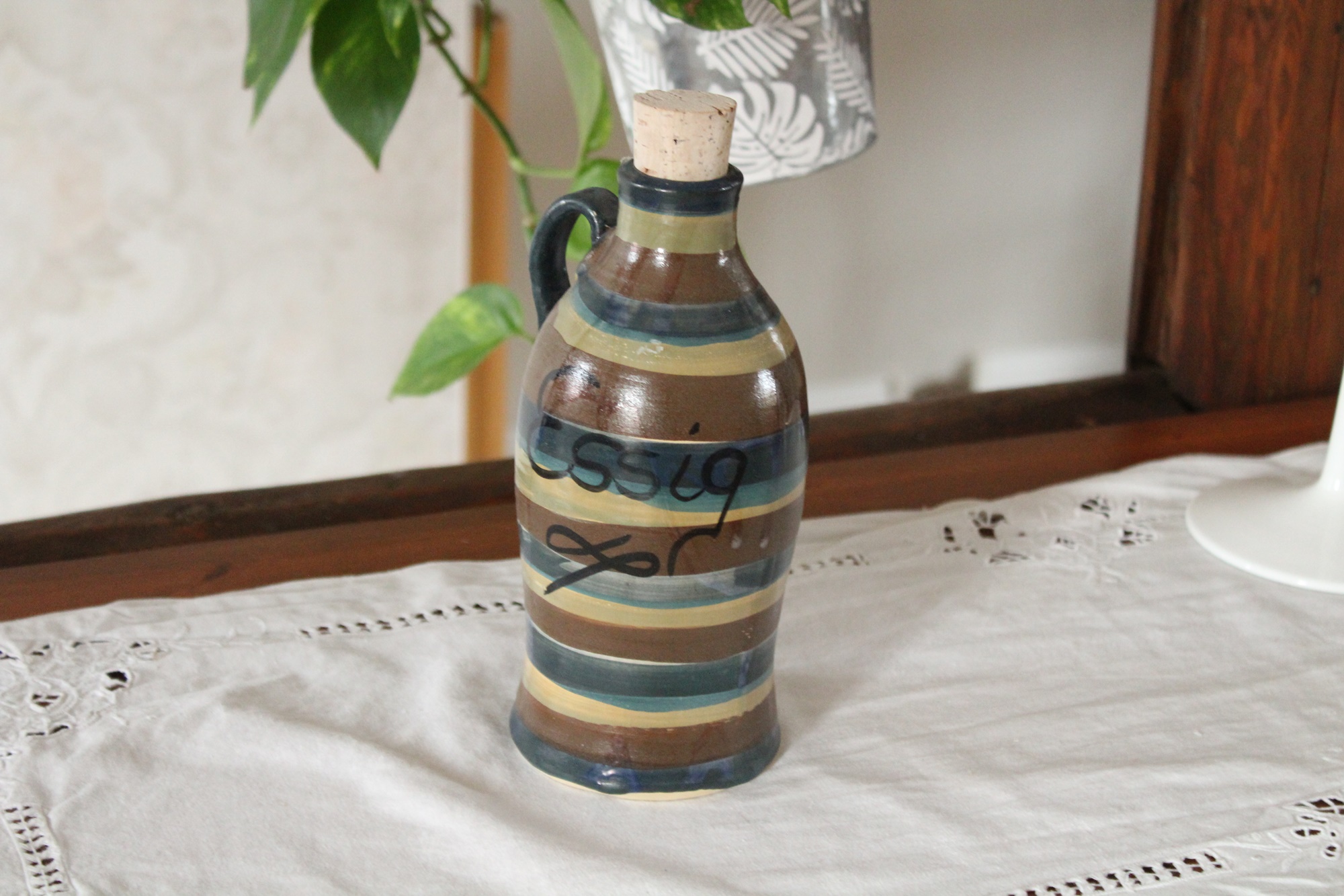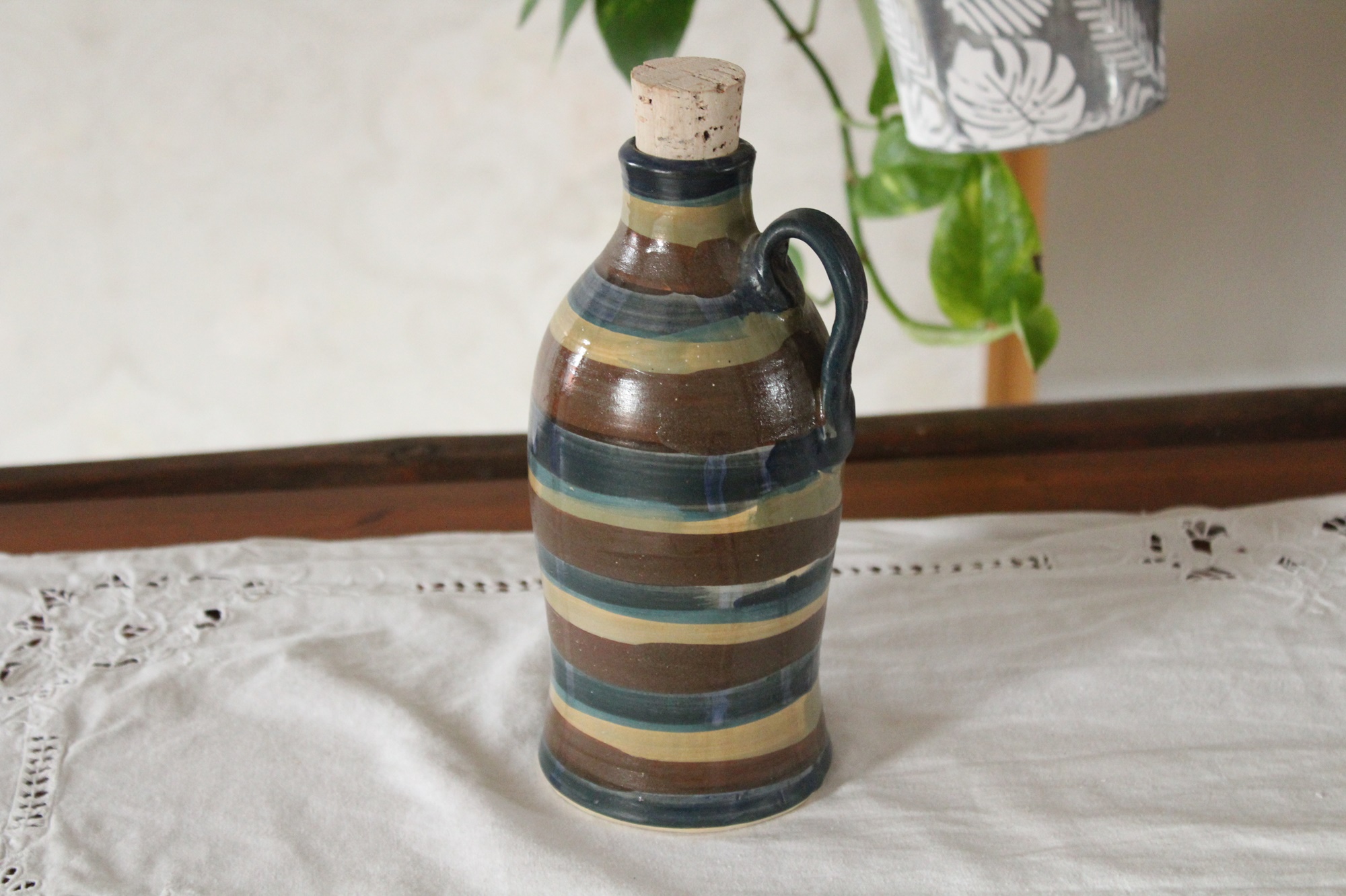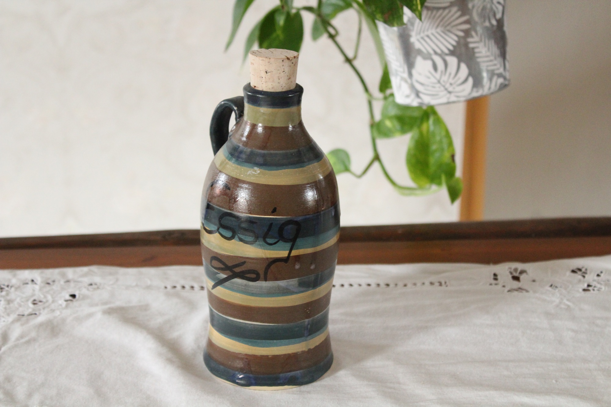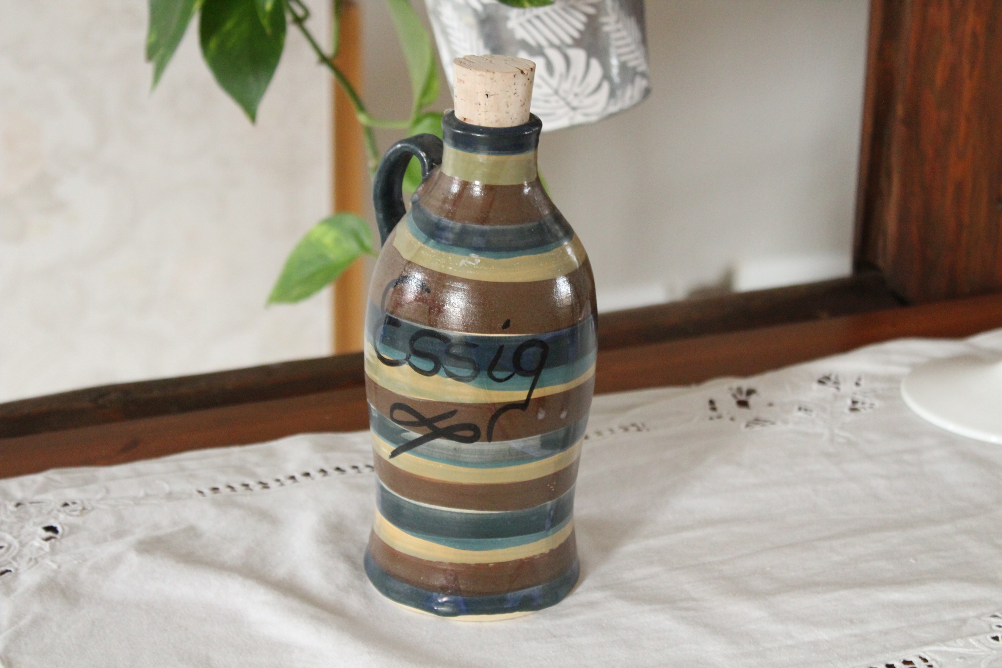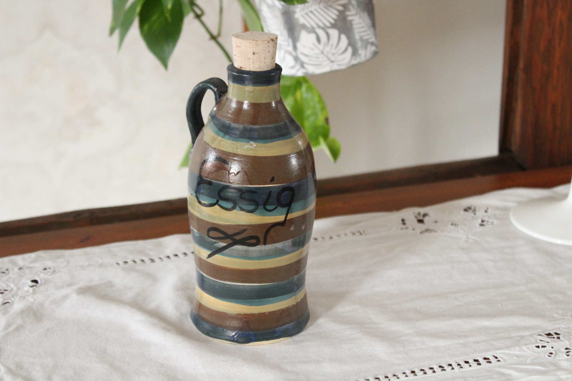 Getöpferte Flasche aus unserer Töpferei für Essig aus der Ringel Serie. B-Ware zum Sonderpreis, die Überglasur hat kleine Nasen, siehe Fotos. Alle Töpferwaren aus dieser Serie sind in braunen, graugrünen und blauen Farben gearbeitet. Das Muster sind Streifen, die ringsherum laufen. Gearbeitet wurde hier mit Engobe. D.h. die Keramik wurde aufwendig bemalt und dann nochmal farblos glasiert. So darf sie auch in den Geschirrspüler. Jedes Stück ist etwas anders, jedes für sich ist ein Unikat. Und trotzdem ergibt die Keramik Serie ein Gesamtkonzept.