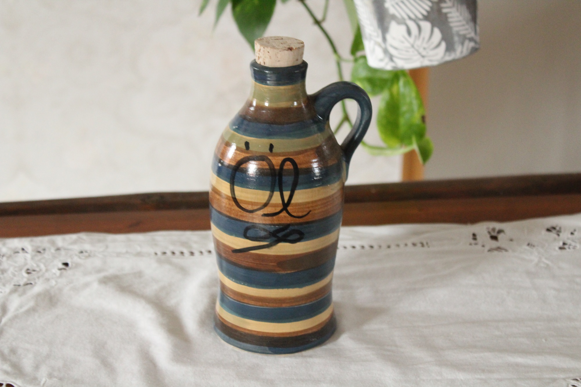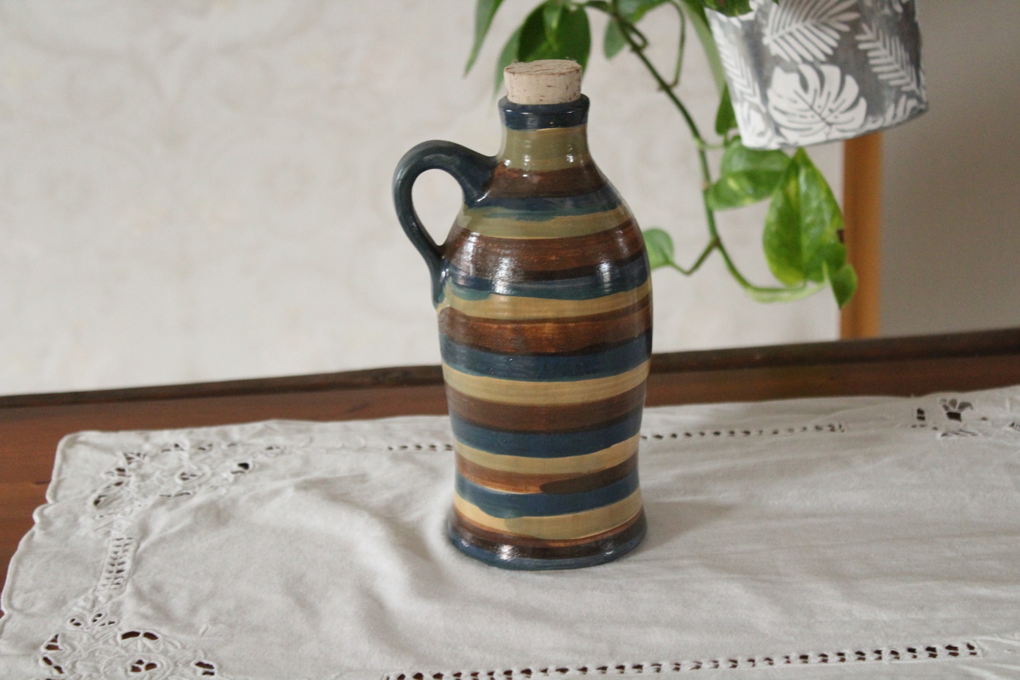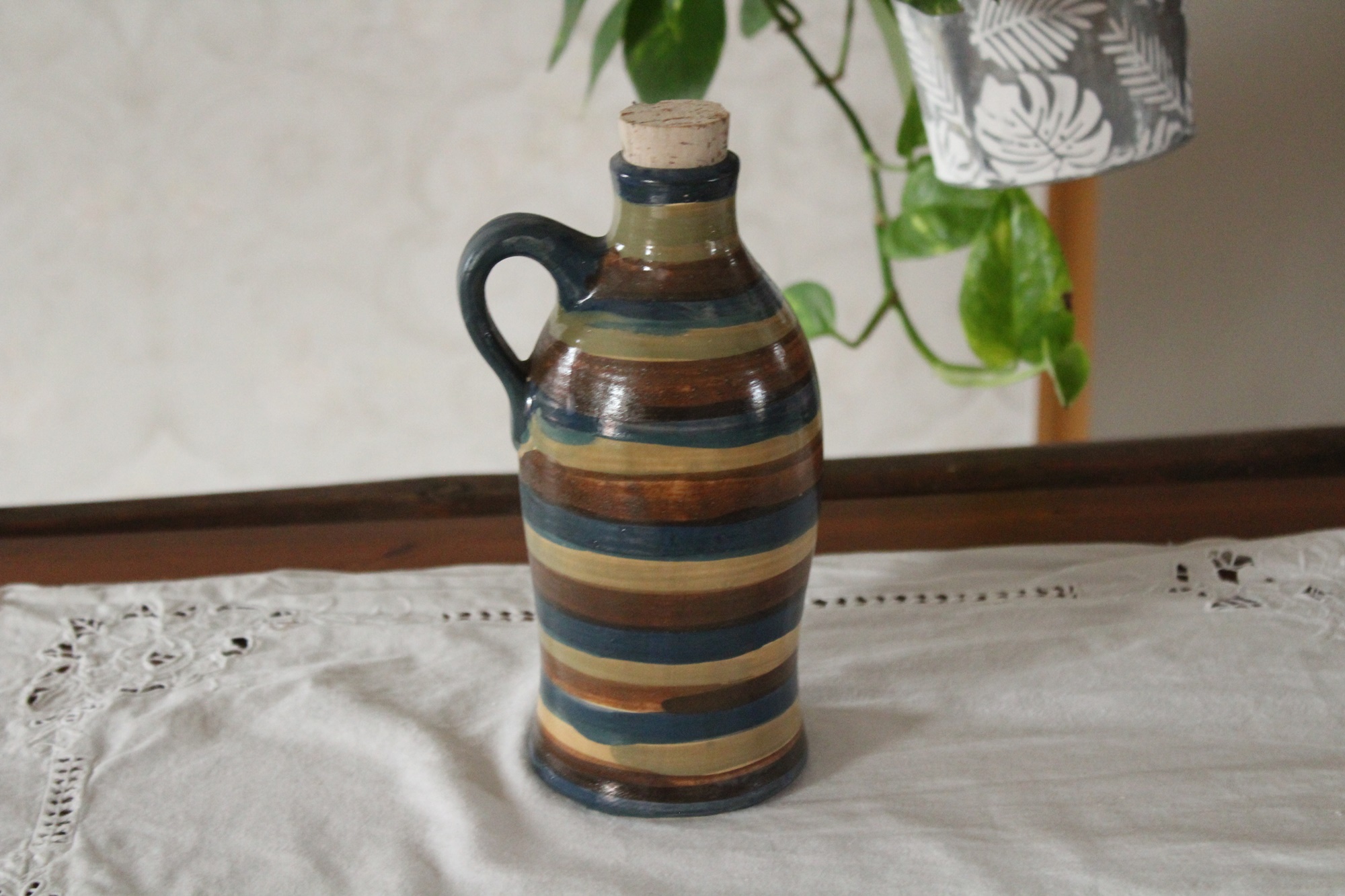 Getöpferte Flasche aus unserer Töpferei für Öl aus der Ringel Serie. Alle Töpferwaren aus dieser Serie sind in braunen, graugrünen und blauen Farben gearbeitet. Das Muster sind Streifen, die ringsherum laufen. Gearbeitet wurde hier mit Engobe. D.h. die Keramik wurde aufwendig bemalt und dann nochmal farblos glasiert. So darf sie auch in den Geschirrspüler. Jedes Stück ist etwas anders, jedes für sich ist ein Unikat. Und trotzdem ergibt die Keramik Serie ein Gesamtkonzept.