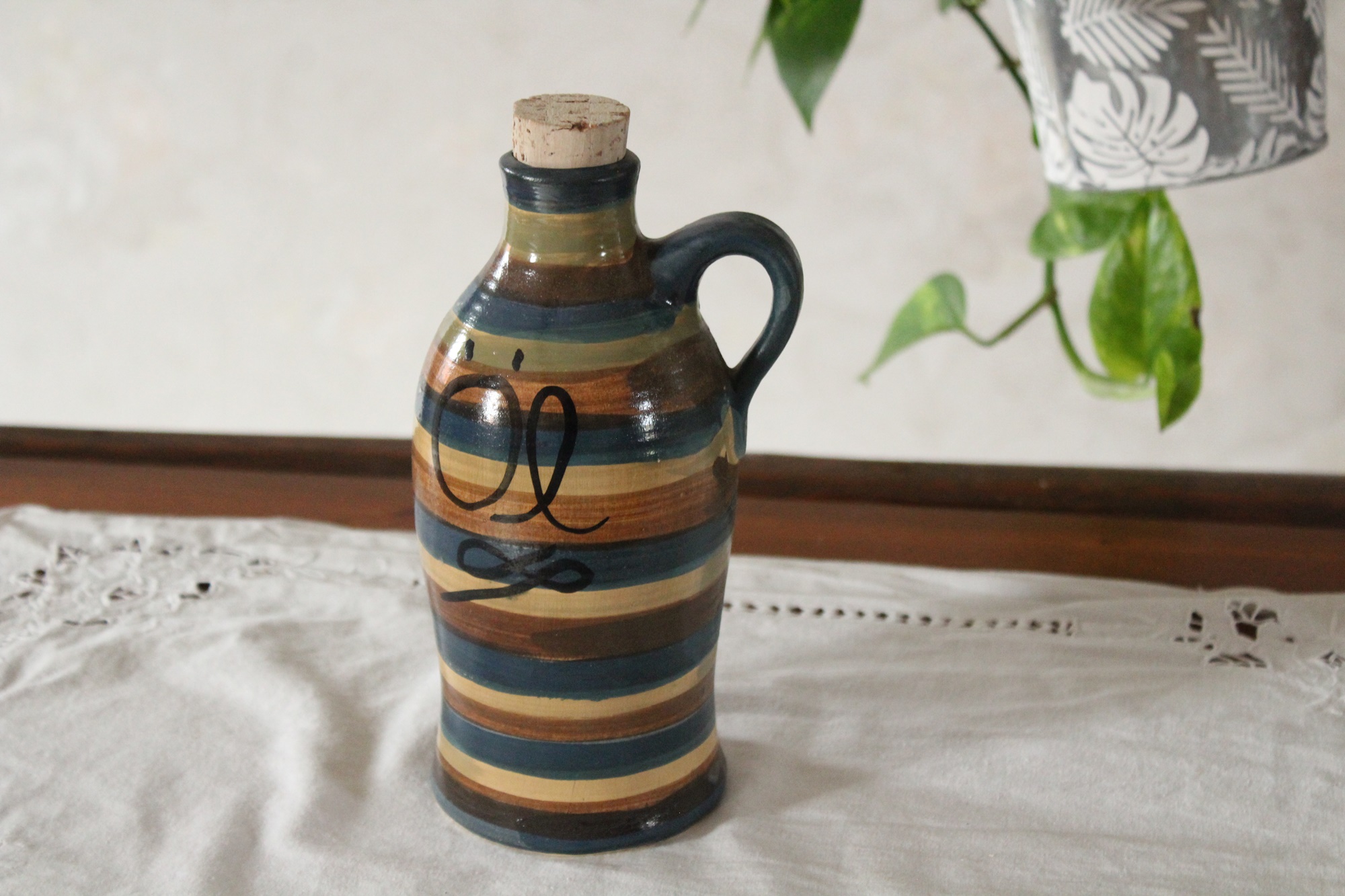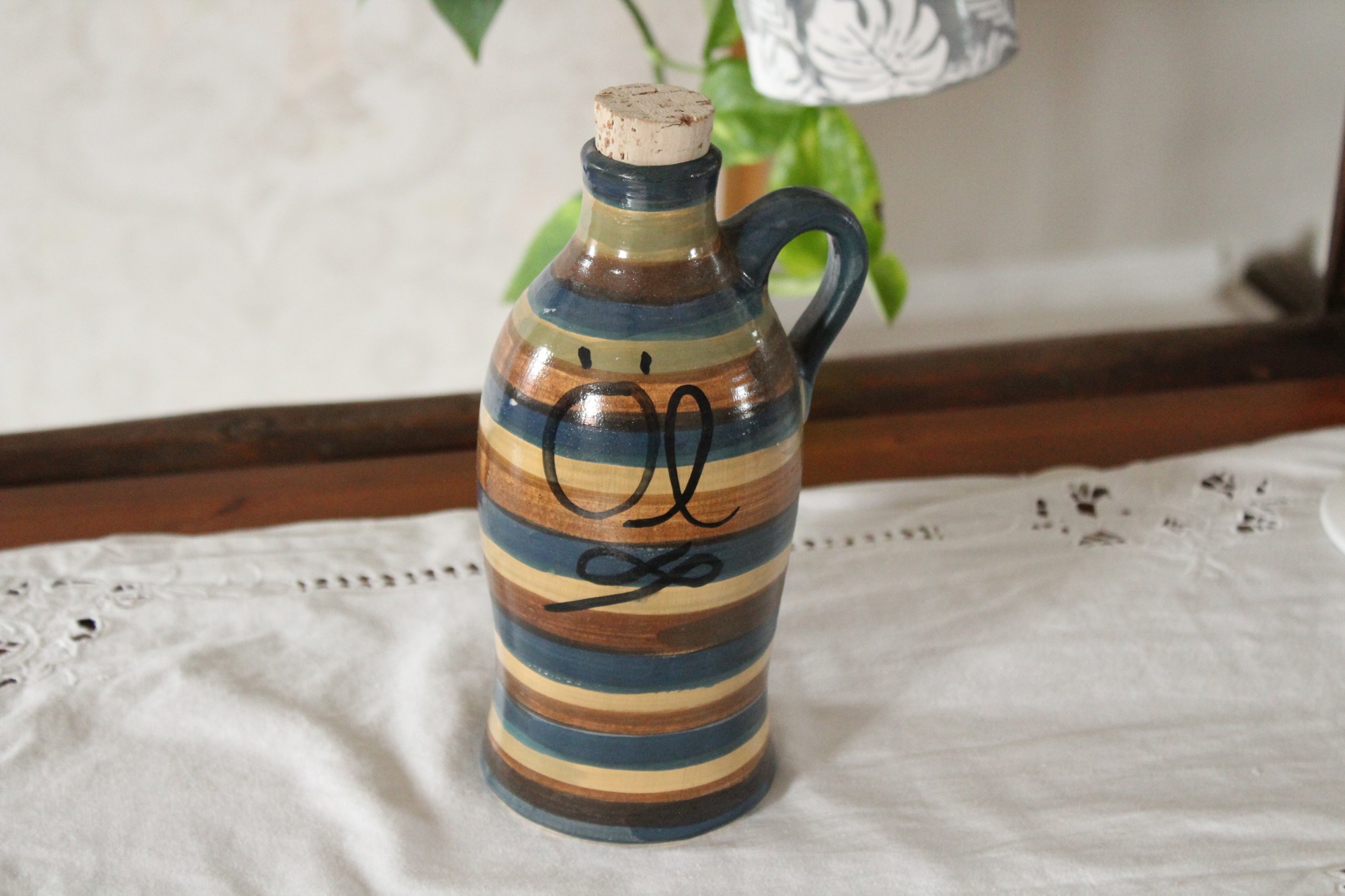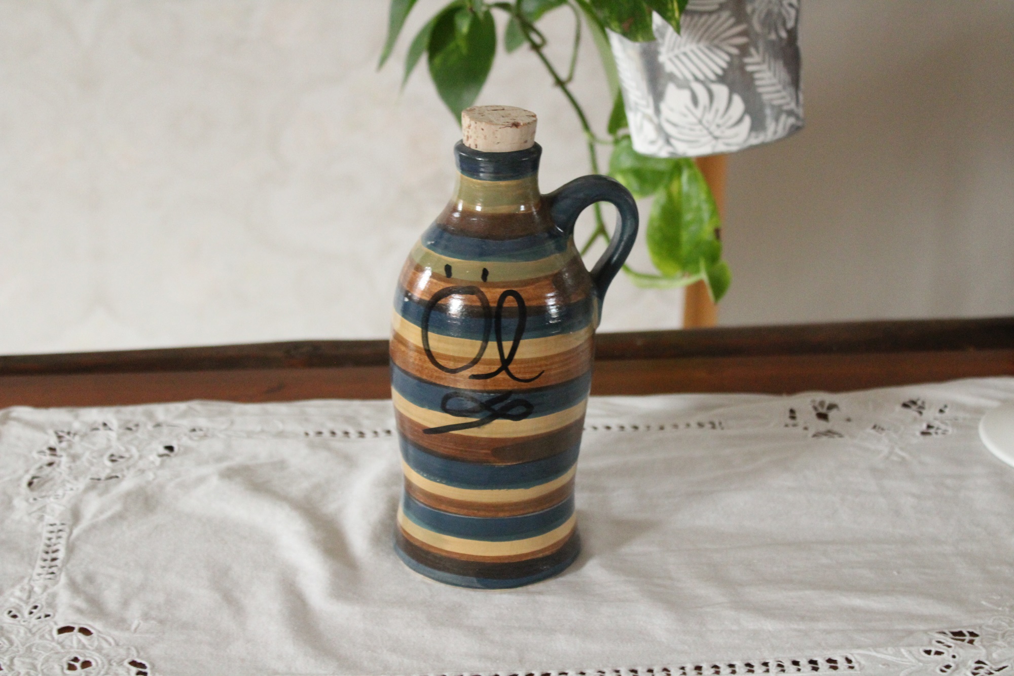 Getöpferte Flasche aus unserer Töpferei für Öl aus der Ringel Serie. Alle Töpferwaren aus dieser Serie sind in braunen, graugrünen und blauen Farben gearbeitet. Das Muster sind Streifen, die ringsherum laufen. Gearbeitet wurde hier mit Engobe. D.h. die Keramik wurde aufwendig bemalt und dann nochmal farblos glasiert. So darf sie auch in den Geschirrspüler. Jedes Stück ist etwas anders, jedes für sich ist ein Unikat. Und trotzdem ergibt die Keramik Serie ein Gesamtkonzept.
