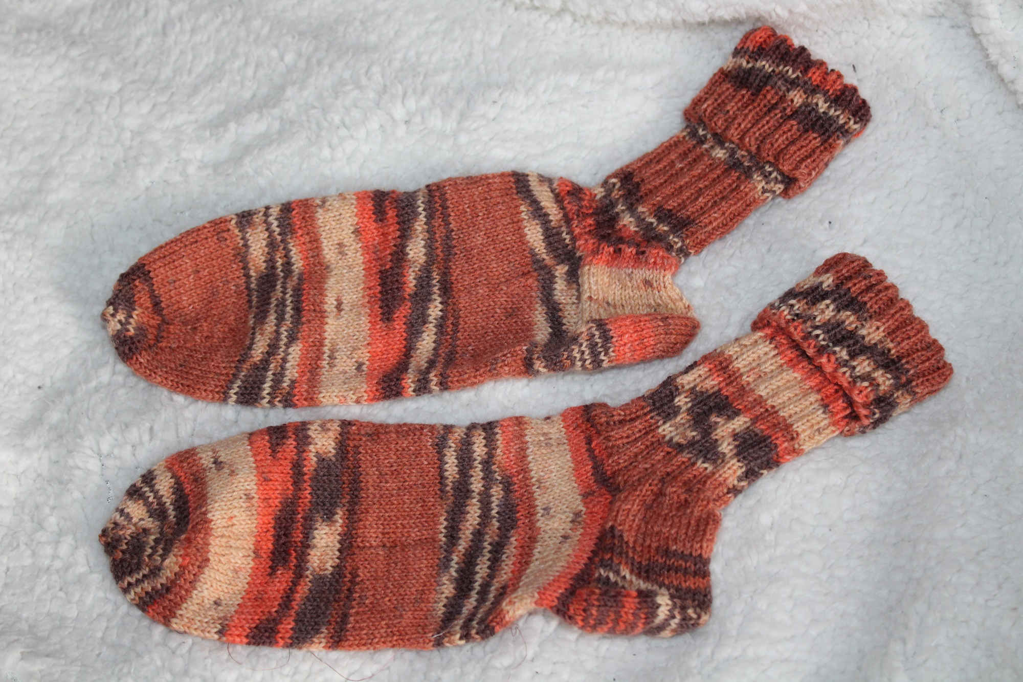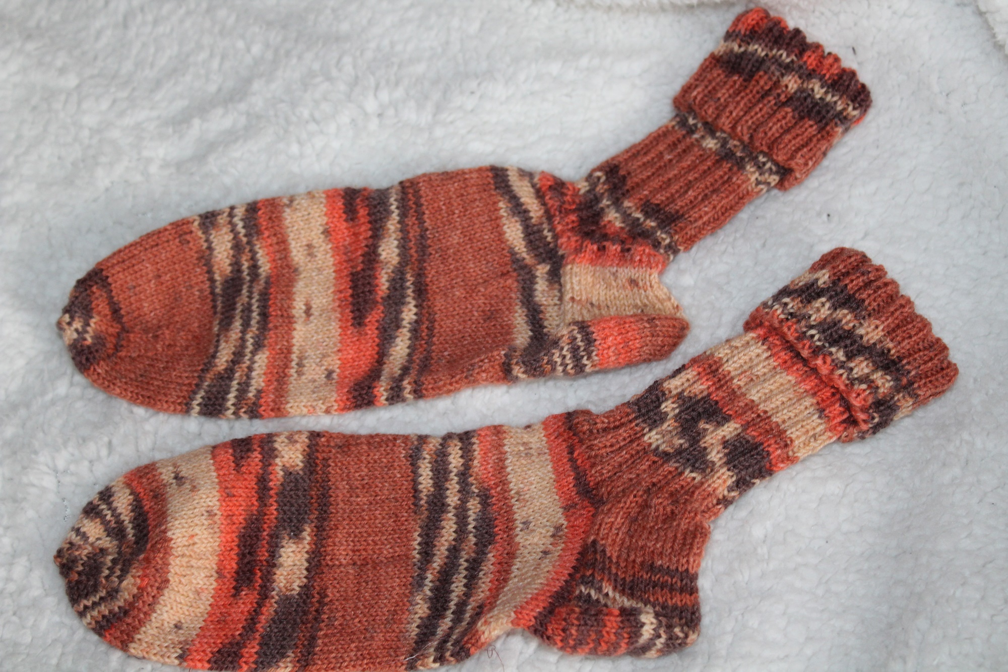 Die Socken haben ein braun beiges Muster. Der Schaft ist in Rippen gestrickt, damit sie auch gut am Bein anliegen und nicht rutschen.