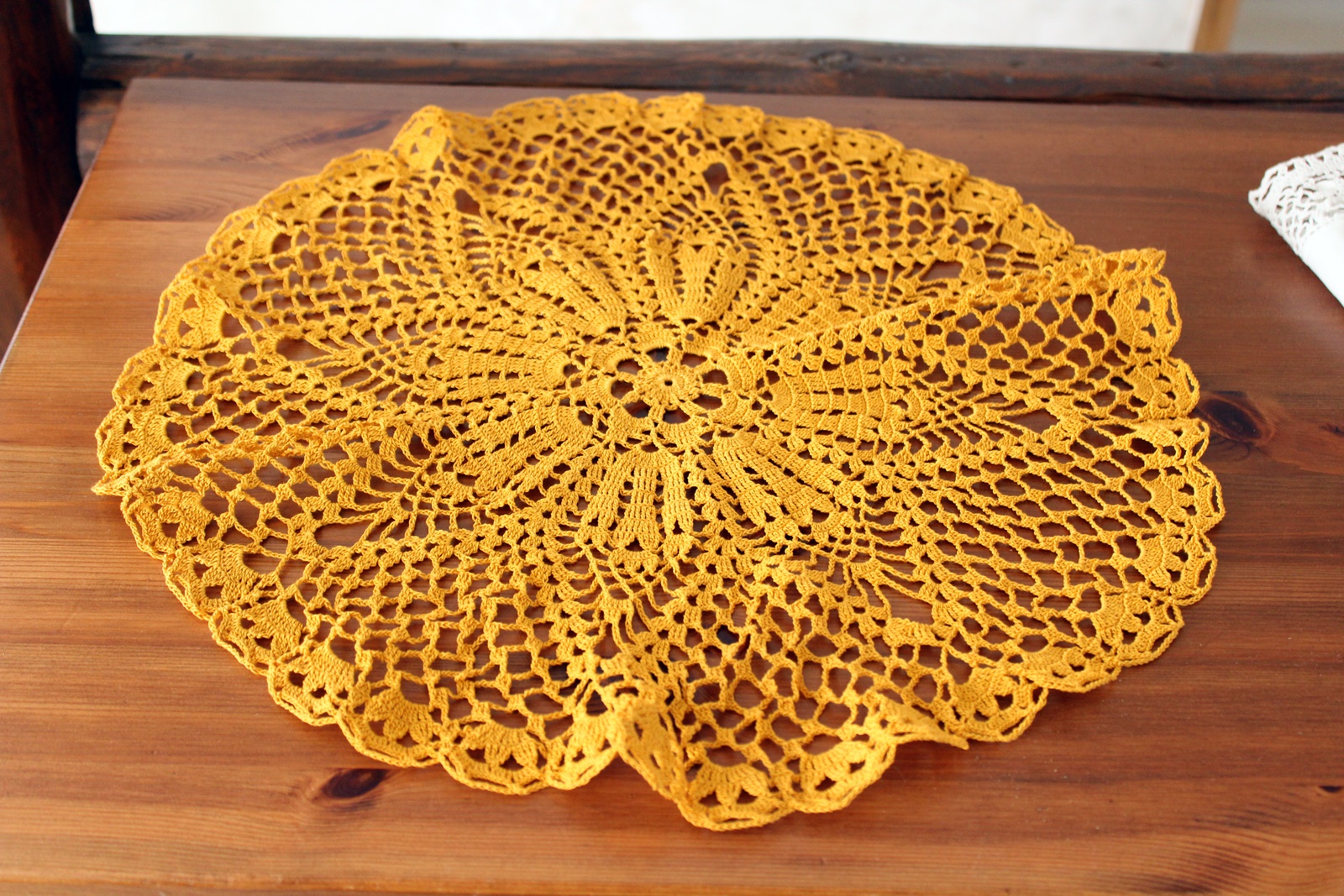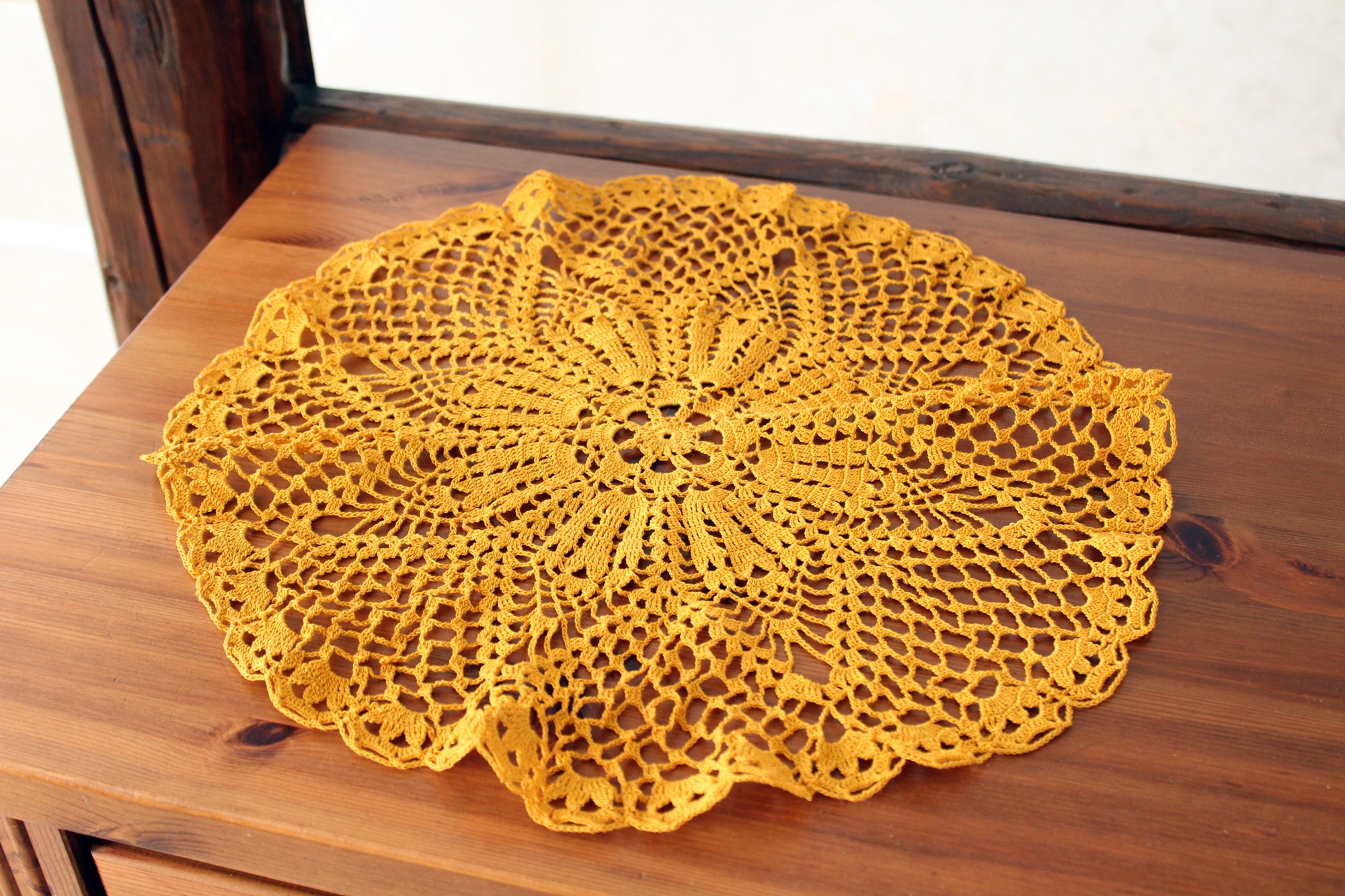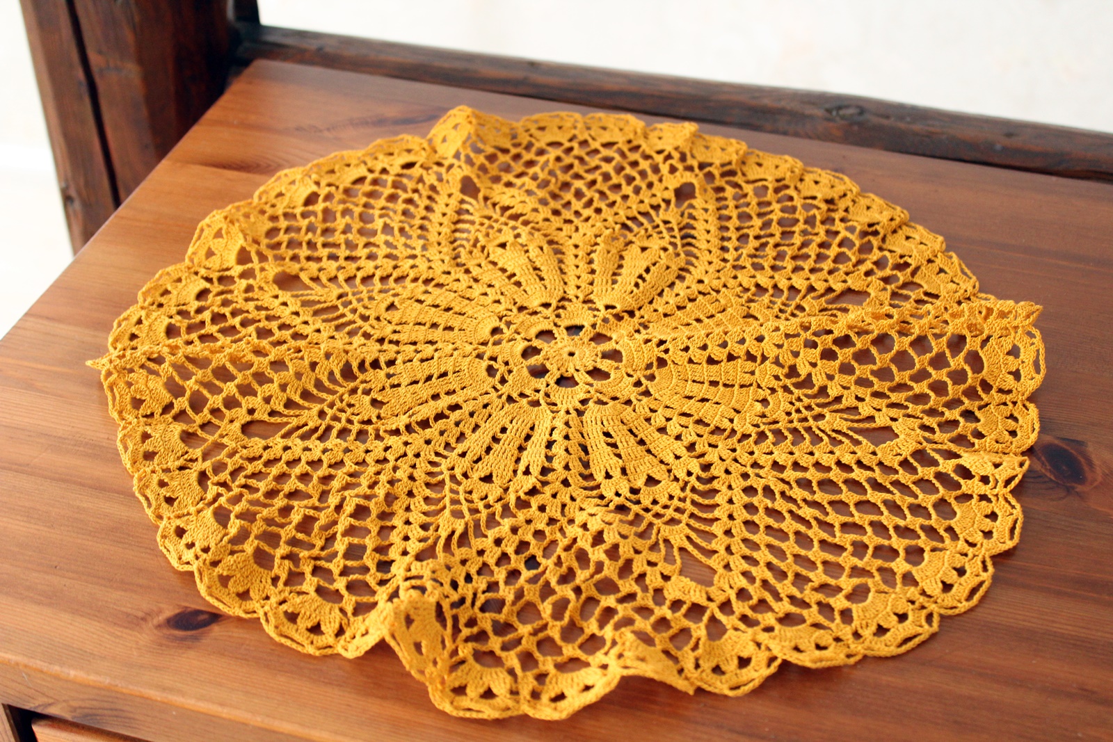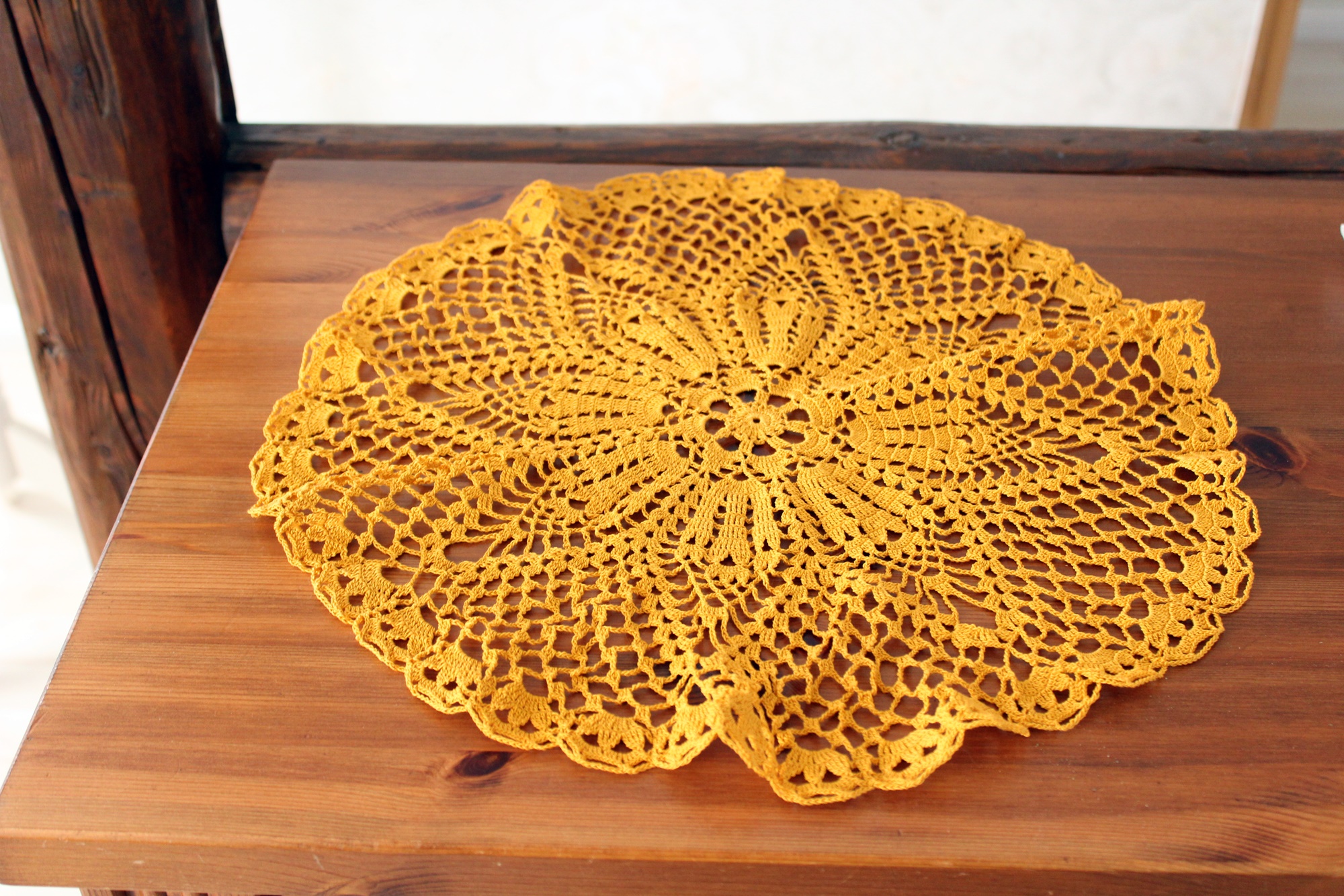 Großes Häkeldeckchen in senfgelb, ein romantisches kleines Deckchen von Hand gehäkelt.