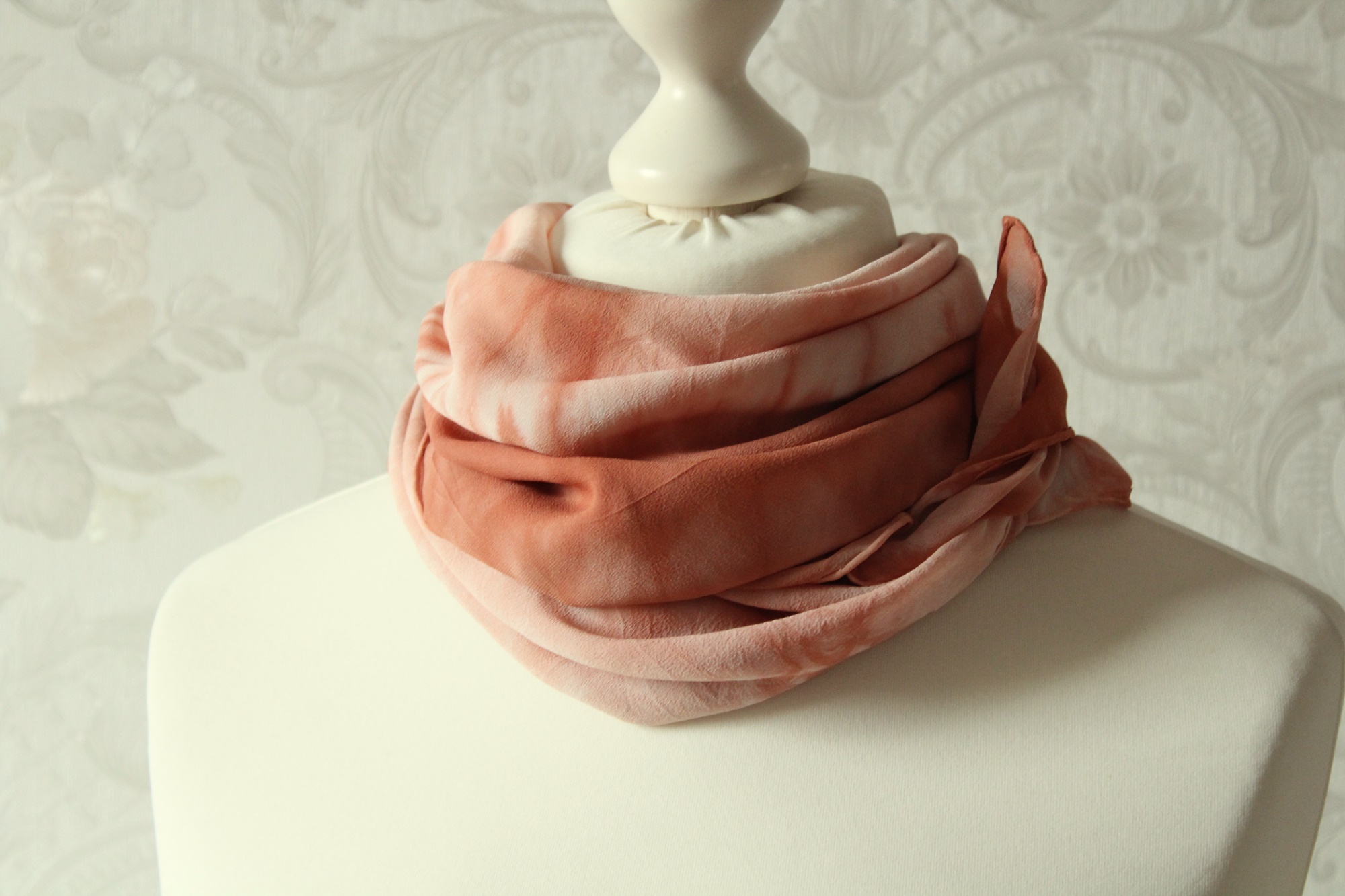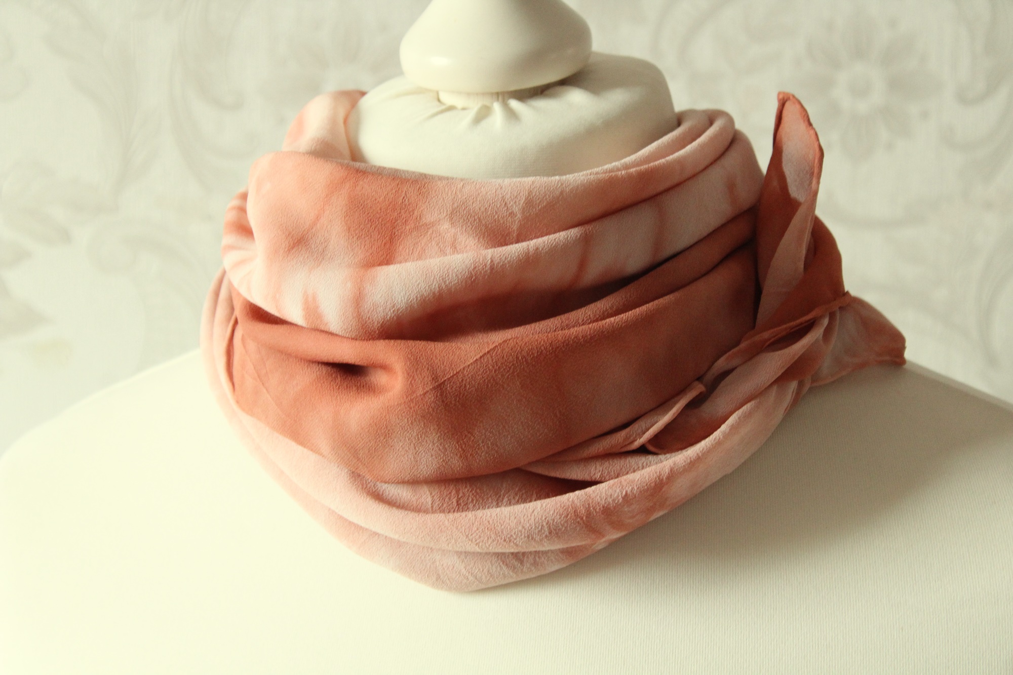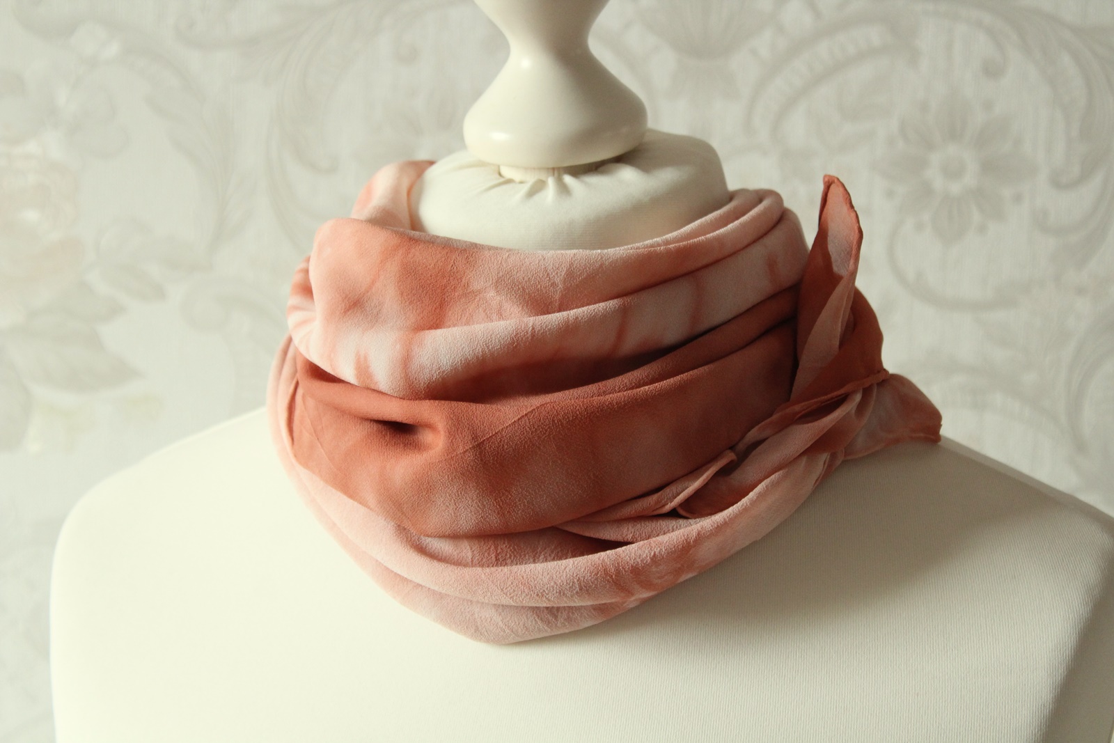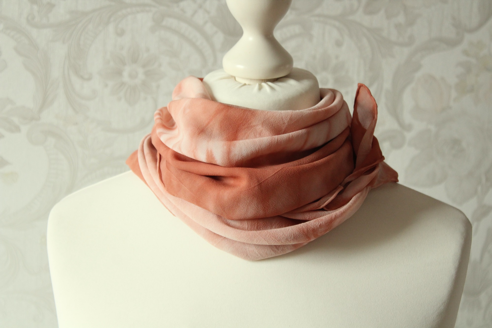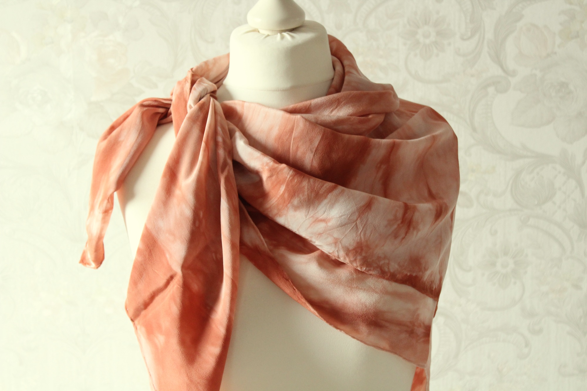 Das große Tuch aus Seide ist in Handarbeit gefertigt und ein weiteres Stück der Sinfonie Reihe. Die Farben hier sind ein helles Beige und ein Terracotta Braun. Die Farbverläufe wechseln sich harmonisch ab und sind leicht streifenförmig angelegt. Die Seidenart ist eine stabile Crepe de Chine Seide. Diese ist etwas dicker als die übliche Ponge Seide und hat eine leicht strukturierte Oberfläche. Dies hat den Vorteil, dass die Seide nicht so schnell knittert und nicht zwingend gebügelt werden muss.