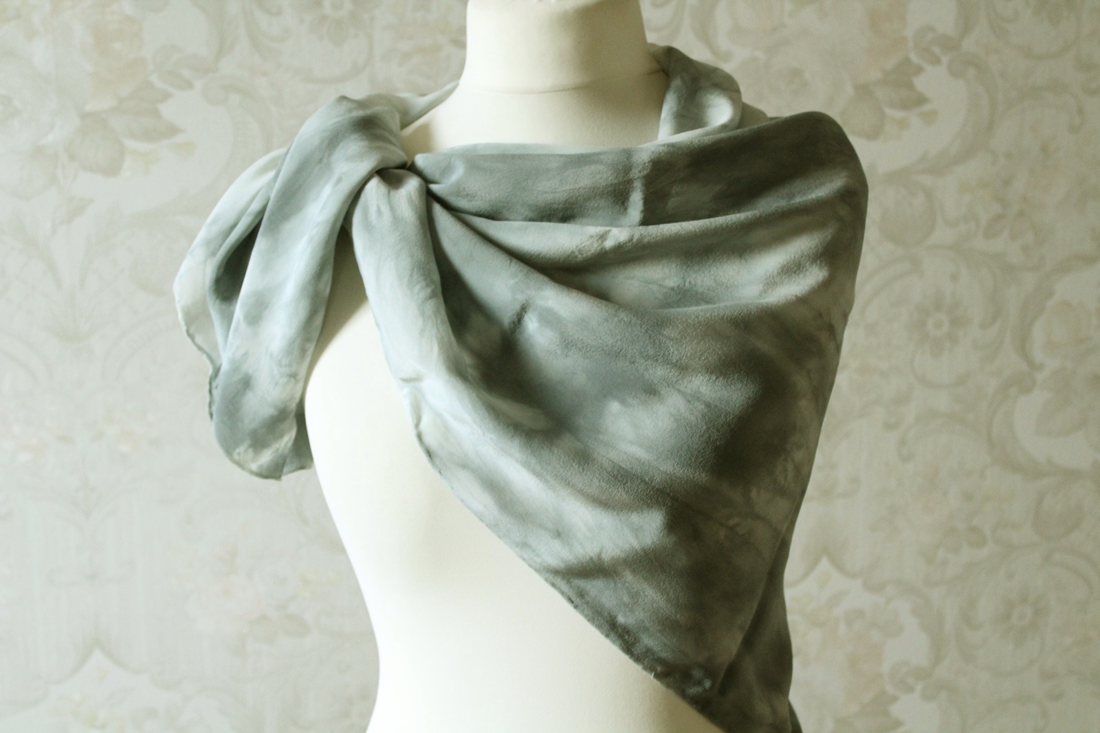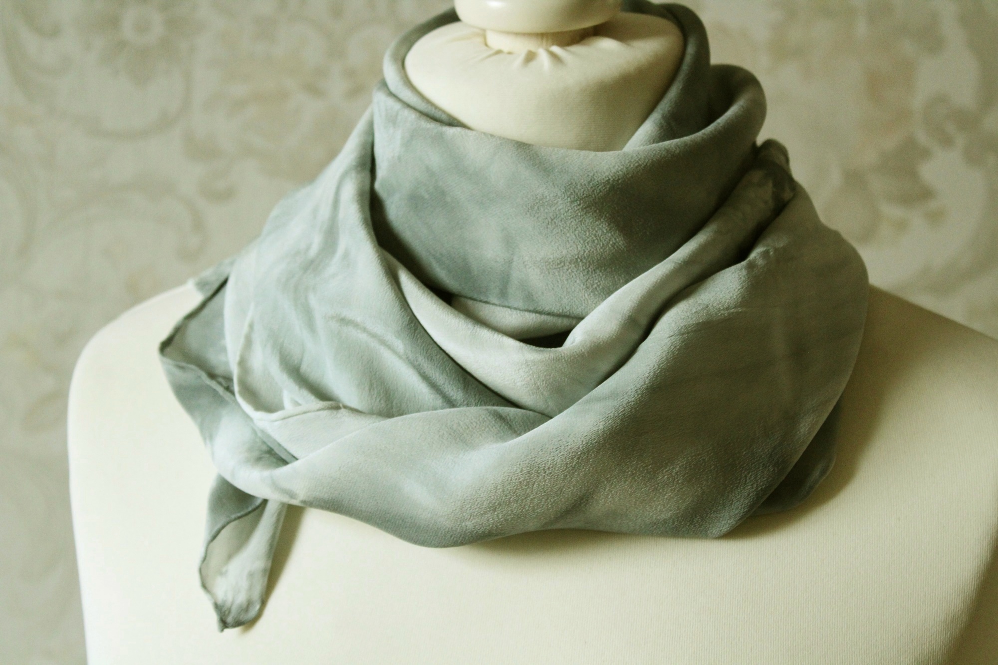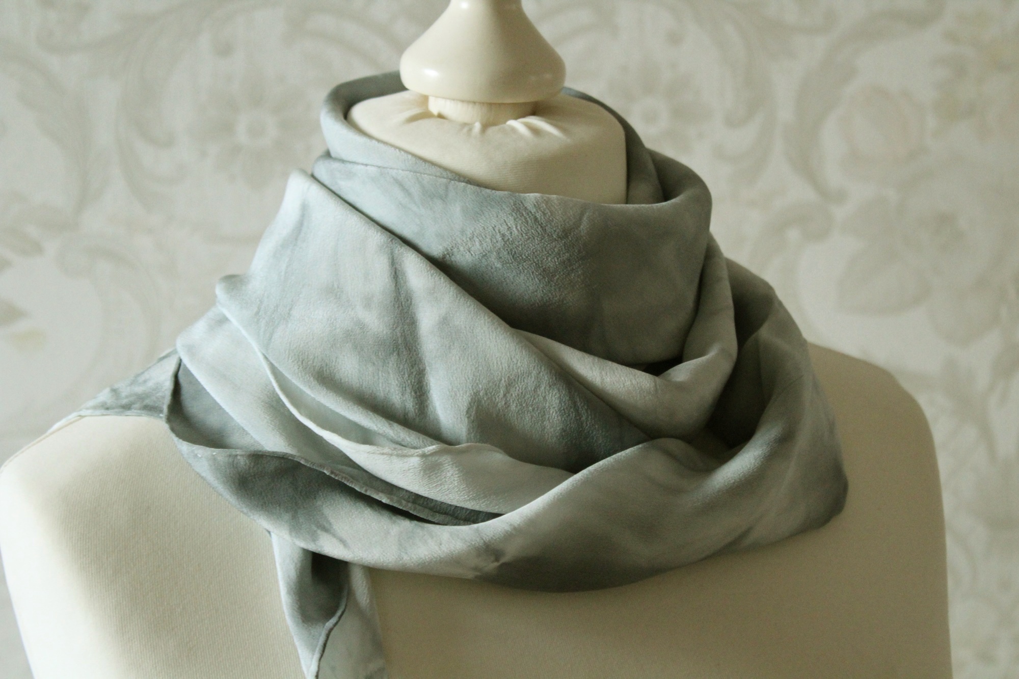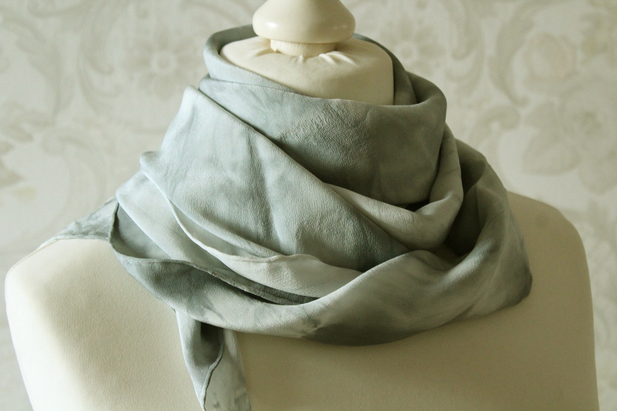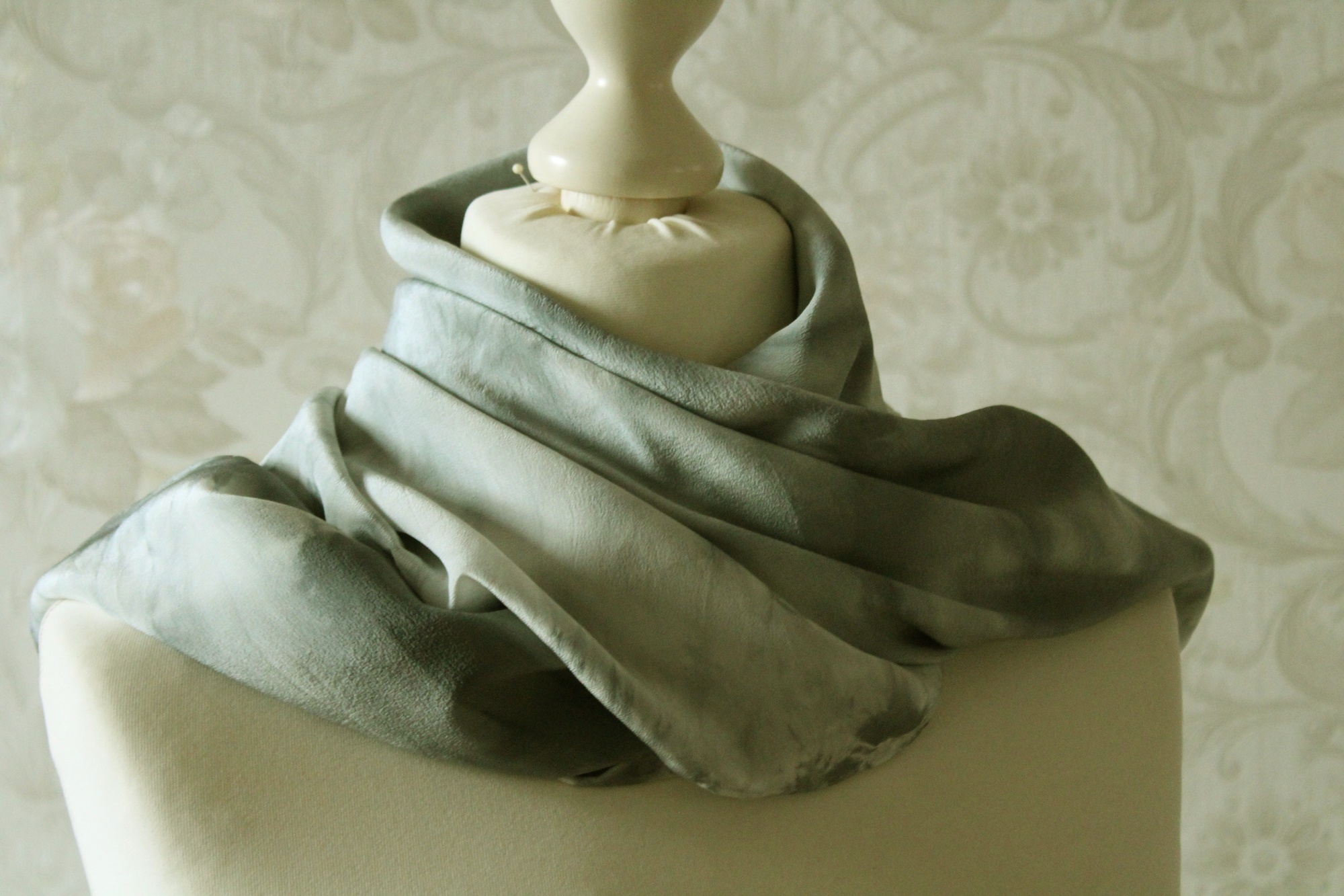 Auch das große blaugraue Tuch aus Seide ist in Handarbeit gefertigt und ein weiteres Stück der Sinfonie Reihe. Verschiedene hellere und dunklere blaue bis graue Töne wechseln sich harmonisch ab. Die Farbverläufe sind leicht streifenförmig angelegt. Die Seidenart ist eine stabile Crepe de Chine Seide. Diese ist etwas dicker als die übliche Ponge Seide und hat eine leicht strukturierte Oberfläche. Dies hat den Vorteil, dass die Seide nicht so schnell knittert und nicht zwingend gebügelt werden muss.