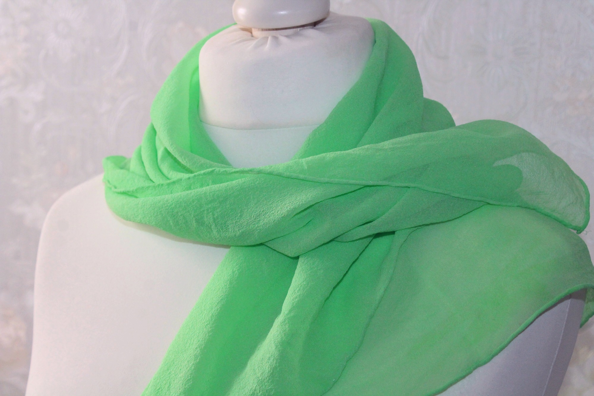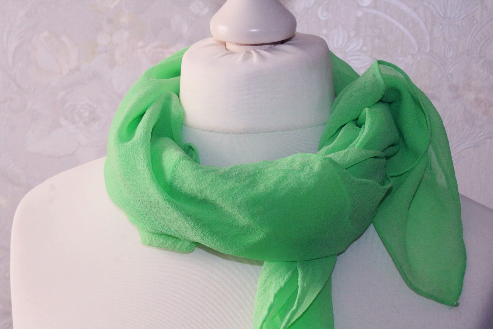 Ein Tuch aus Chiffon in hellem Grün, Handarbeit aus Thüringen. Das Tuch ist aus Seidenchiffon und ist 85 x 85 cm groß. Es ist nicht gemustert. Das Halstuch ist hauchzart und ein Hingucker auf jeder Kleidung, besonders gut passt es zu Schwarz oder auf weiße Kleidung.