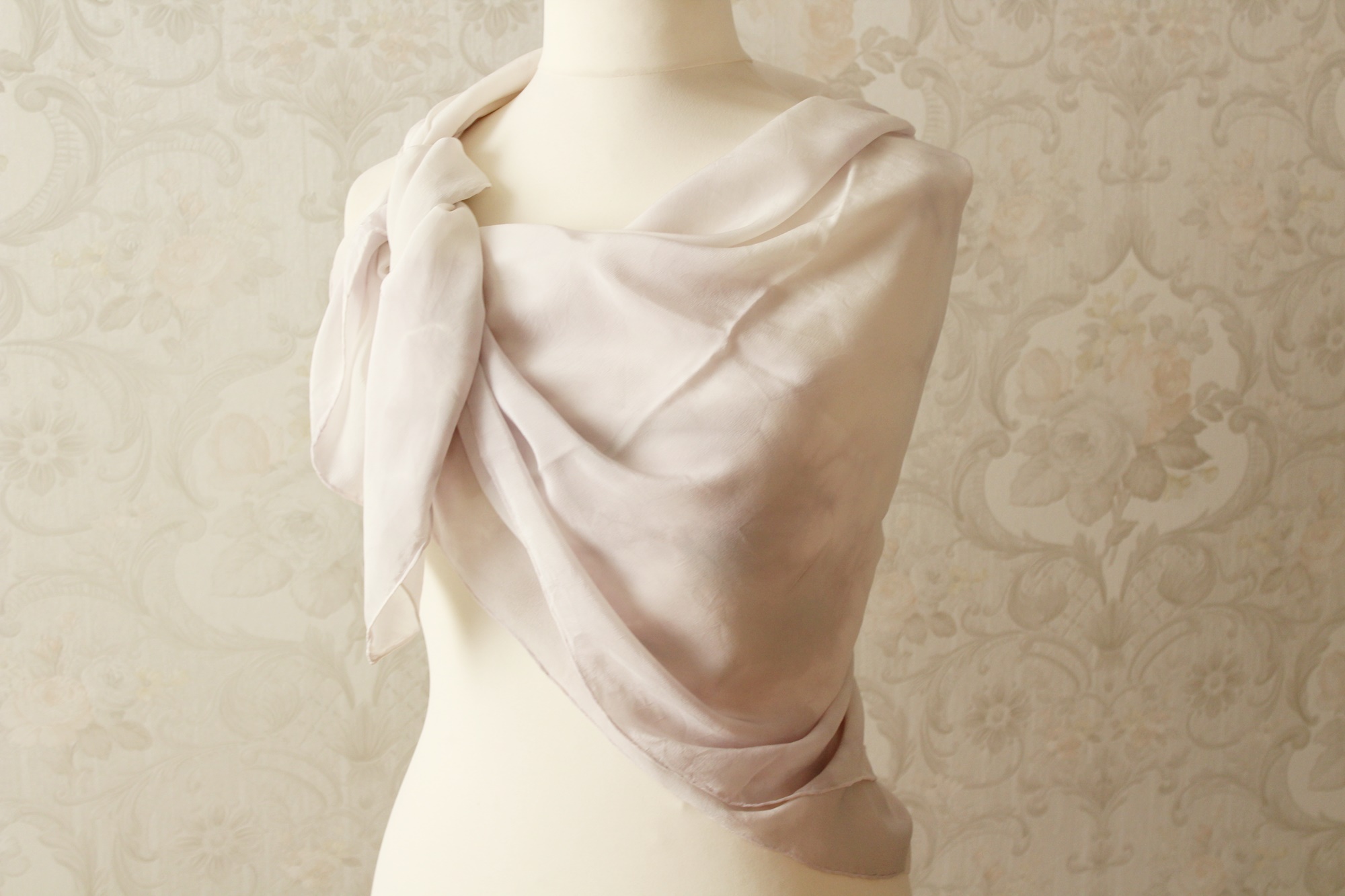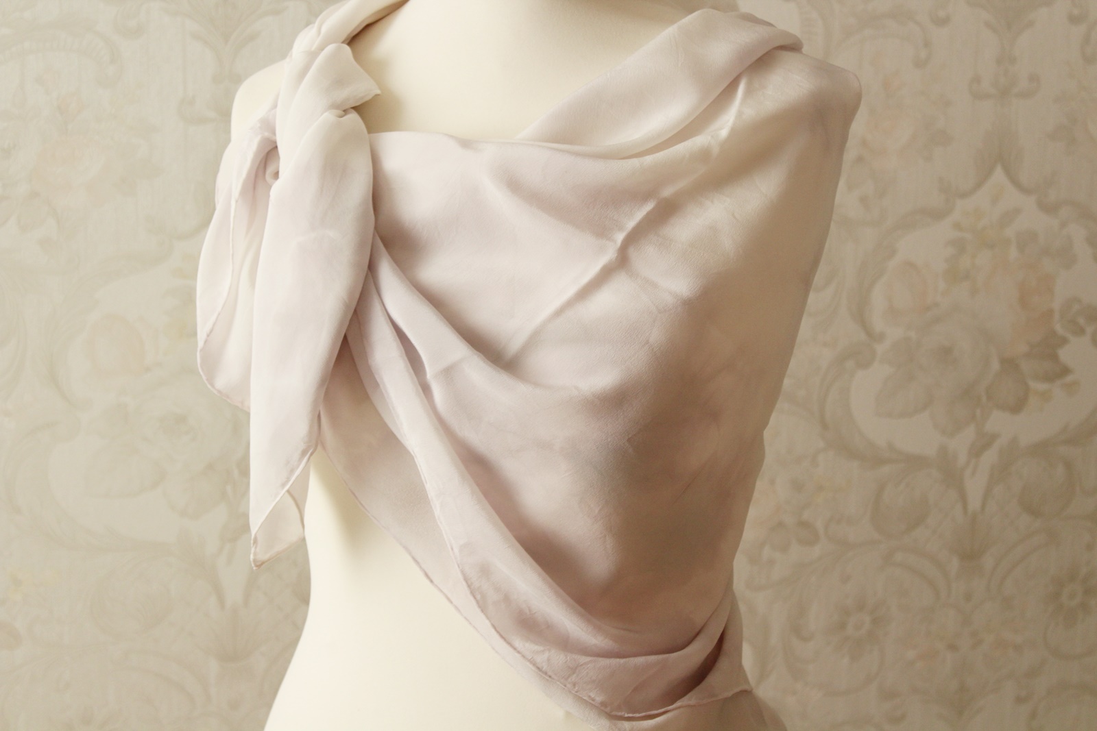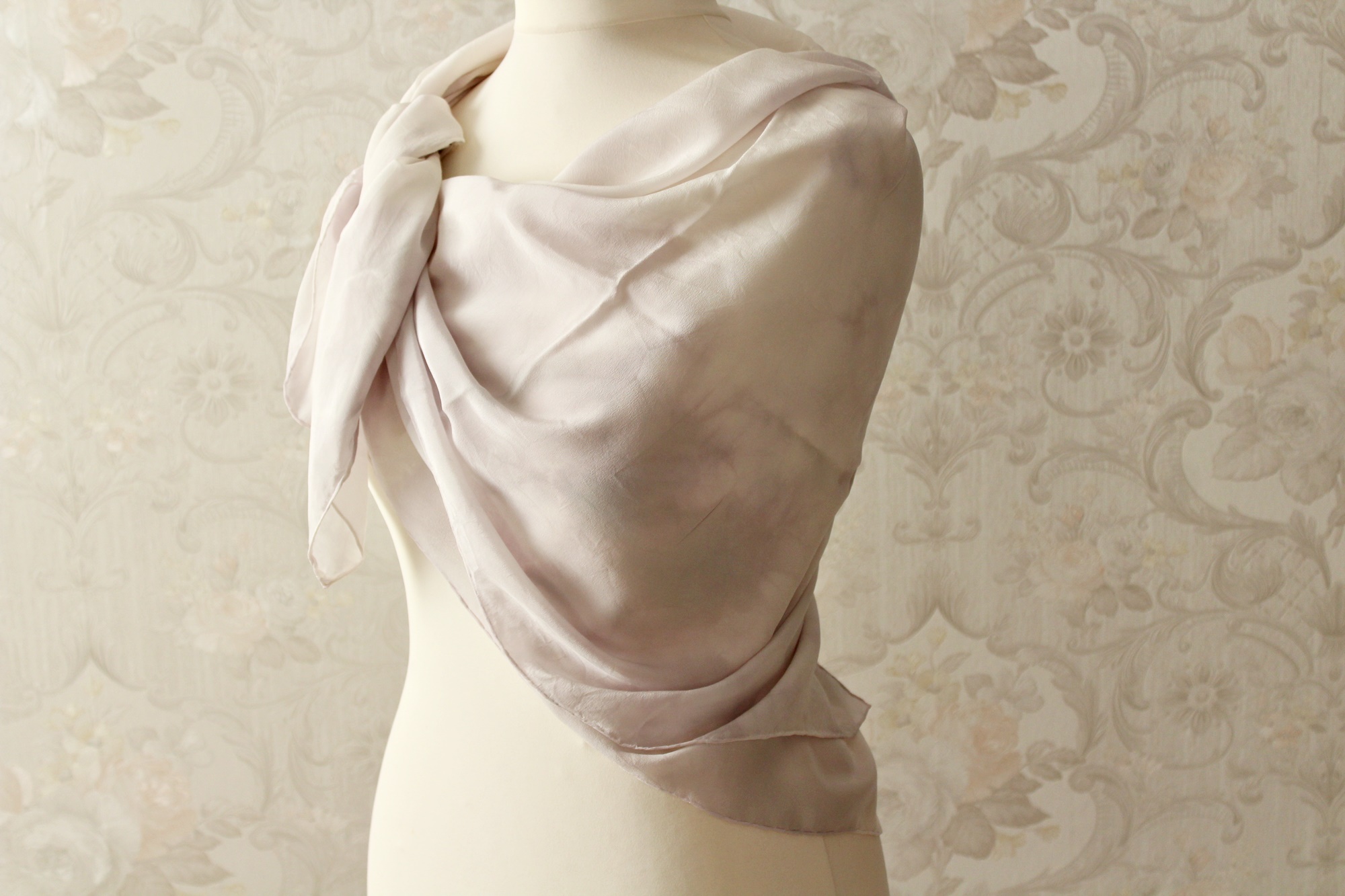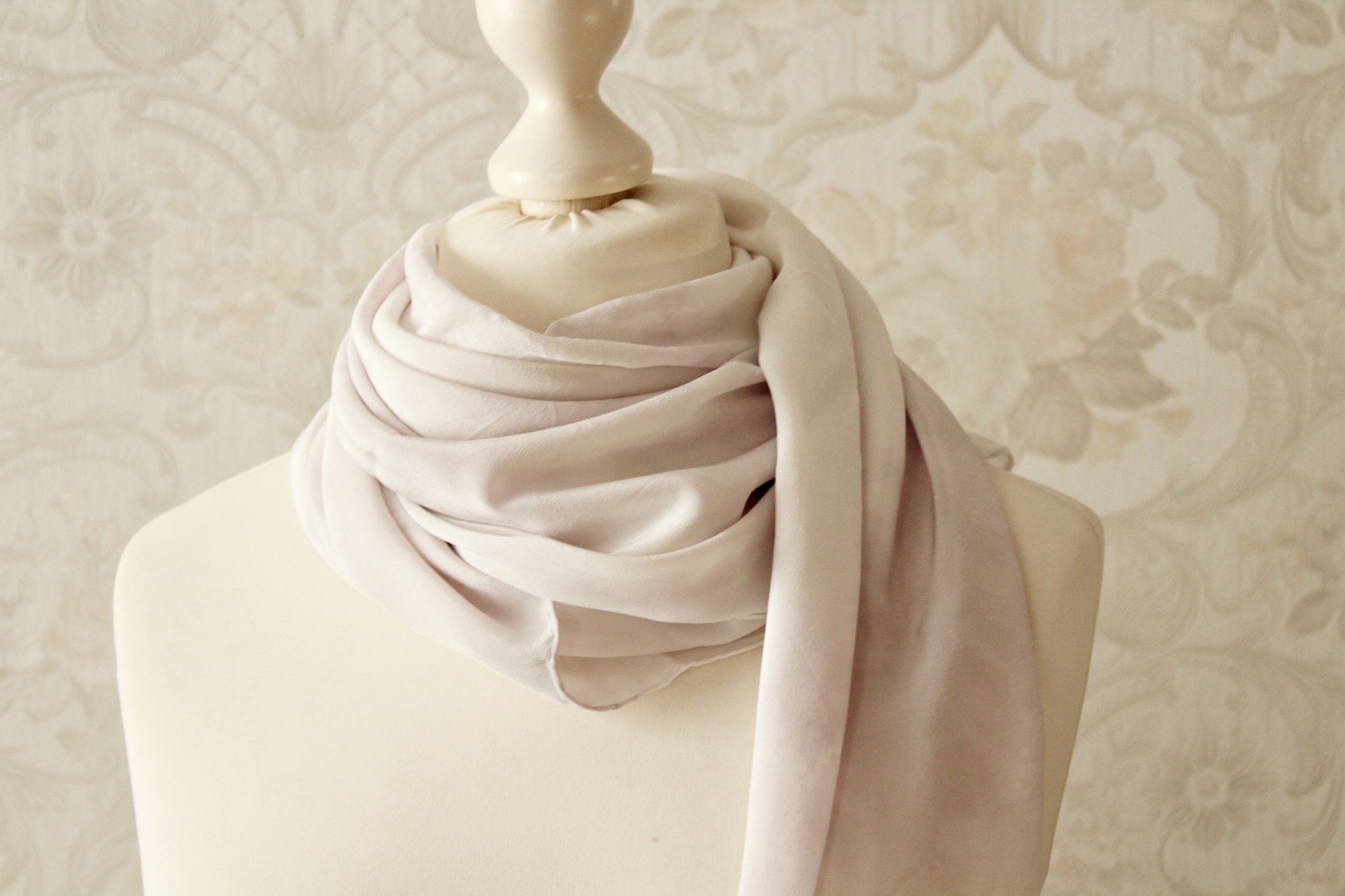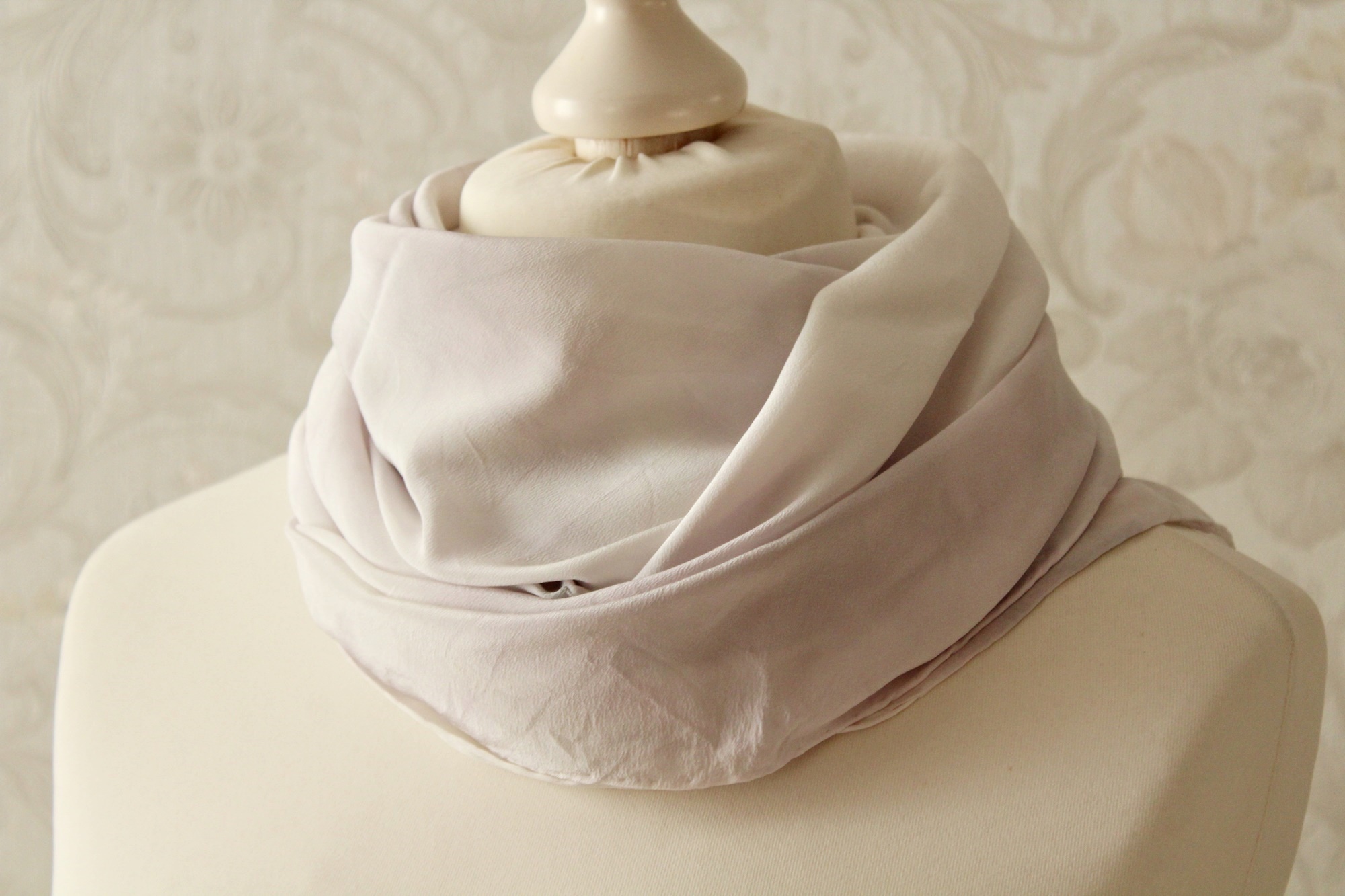 Das helle große Tuch aus Seide ist in Handarbeit gefertigt und ein weiteres Stück der Melodie Reihe. Ganz dezent in leisen Tönen wechseln sich die Farben ab. Die Muster aus leichten Farbverläufen entstehen durch verschiedenen Techniken der Seidenmalerei. Die Farben hier sind Pastell, ein ganz helles Grau und ein Fliederton. So ist das Tuch besonders geeignet für alle, die es nicht zu bunt mögen.