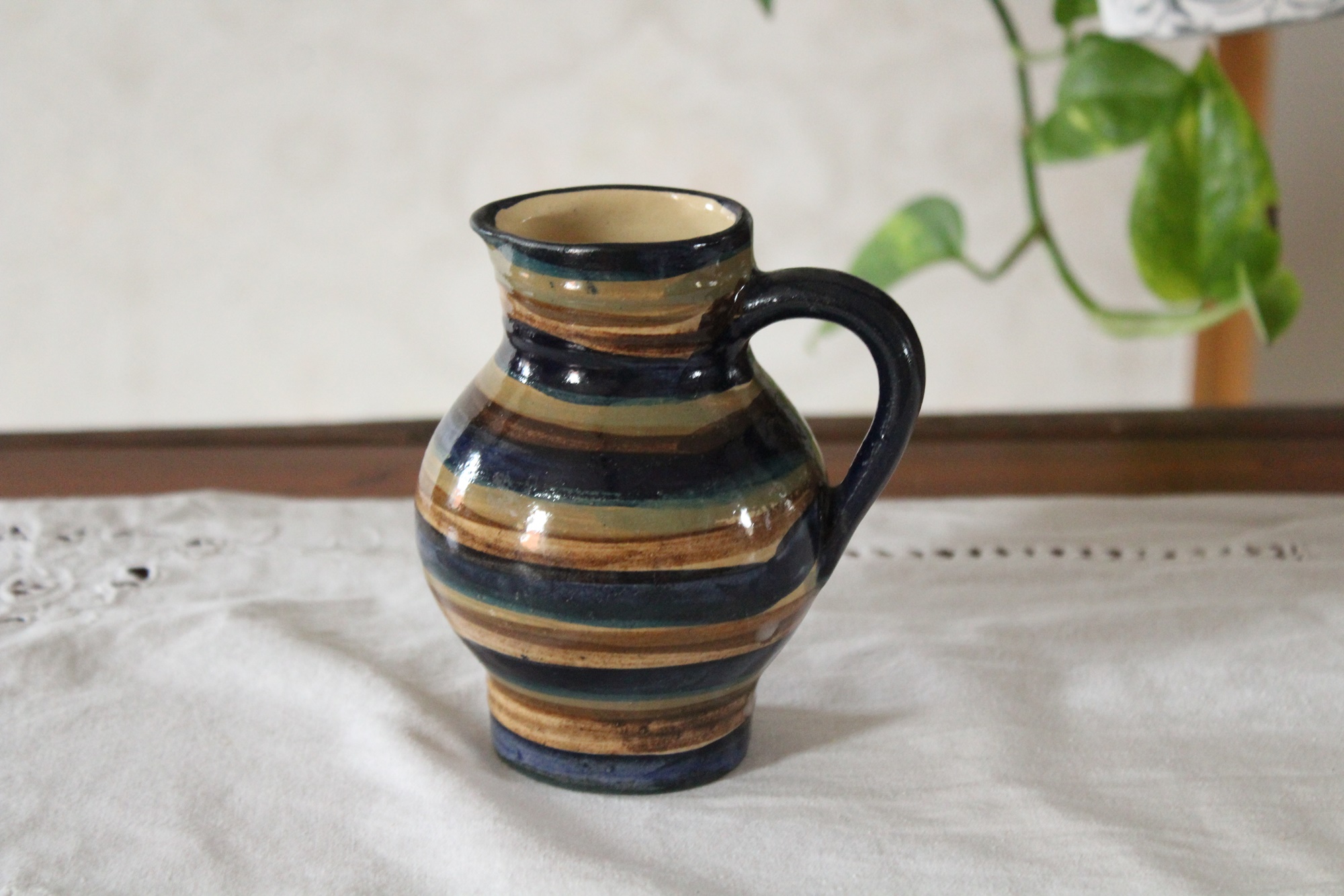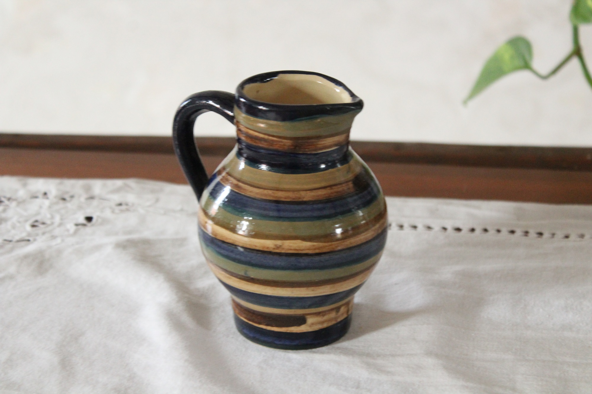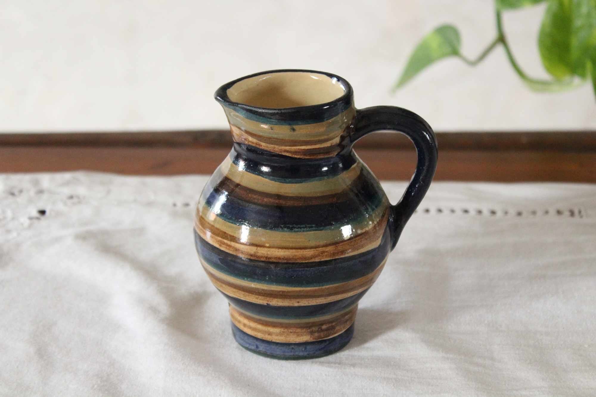 Ein kleiner Krug bzw. Kännchen aus unserer Keramik Serie Ringel für Milch, Kakao, Sahne und mehr, getöpfert in Handarbeit in unserer kleinen Töpferei in Thüringen. Auch als kleine Vase kann der Krug gut verwendet werden.