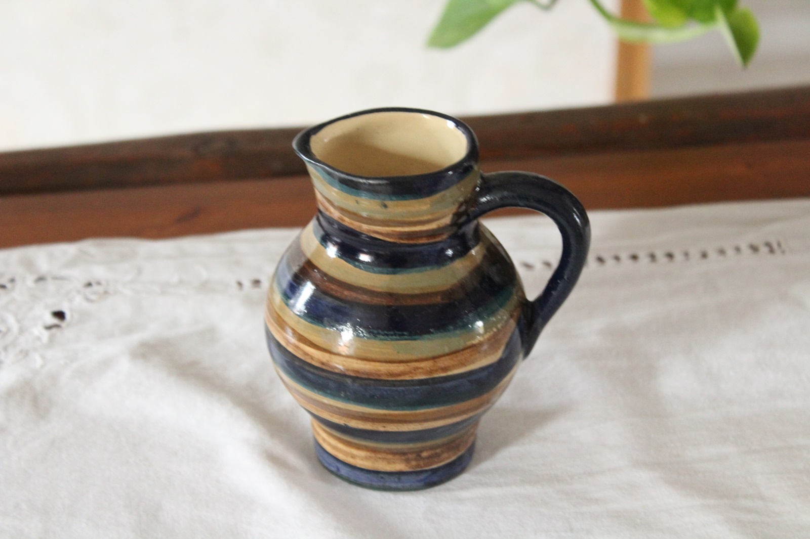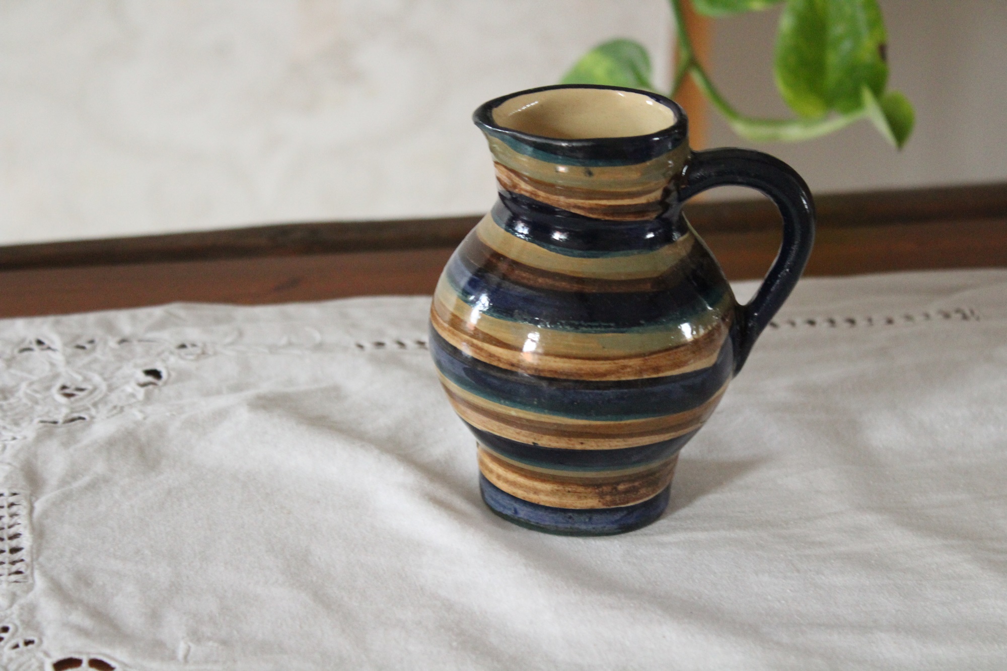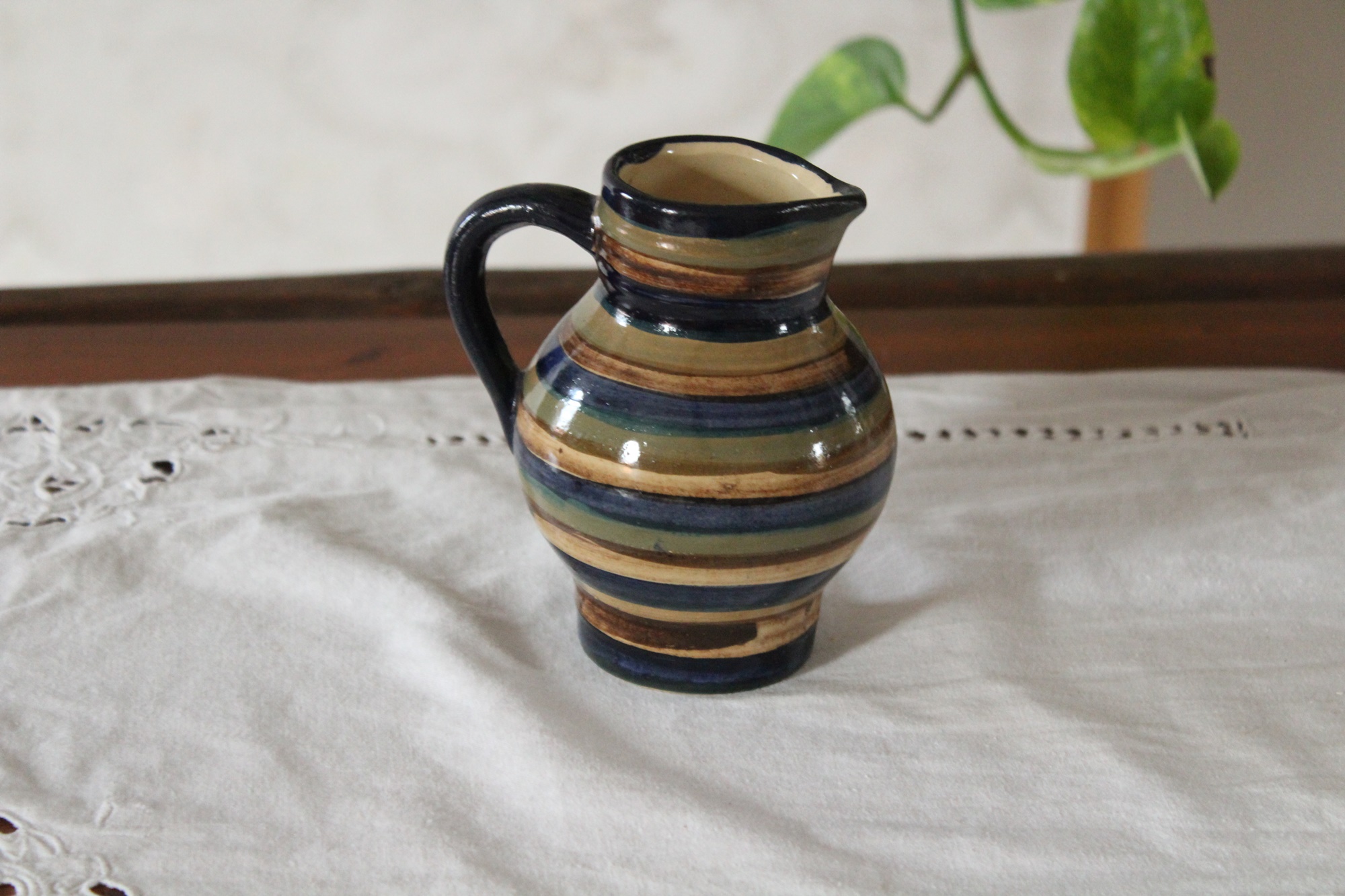Ein kleiner Krug bzw. Kännchen aus unserer Keramik Serie Ringel für Milch, Kakao, Sahne und mehr, getöpfert in Handarbeit in unserer kleinen Töpferei in Thüringen. Auch als kleine Vase kann der Krug gut verwendet werden.