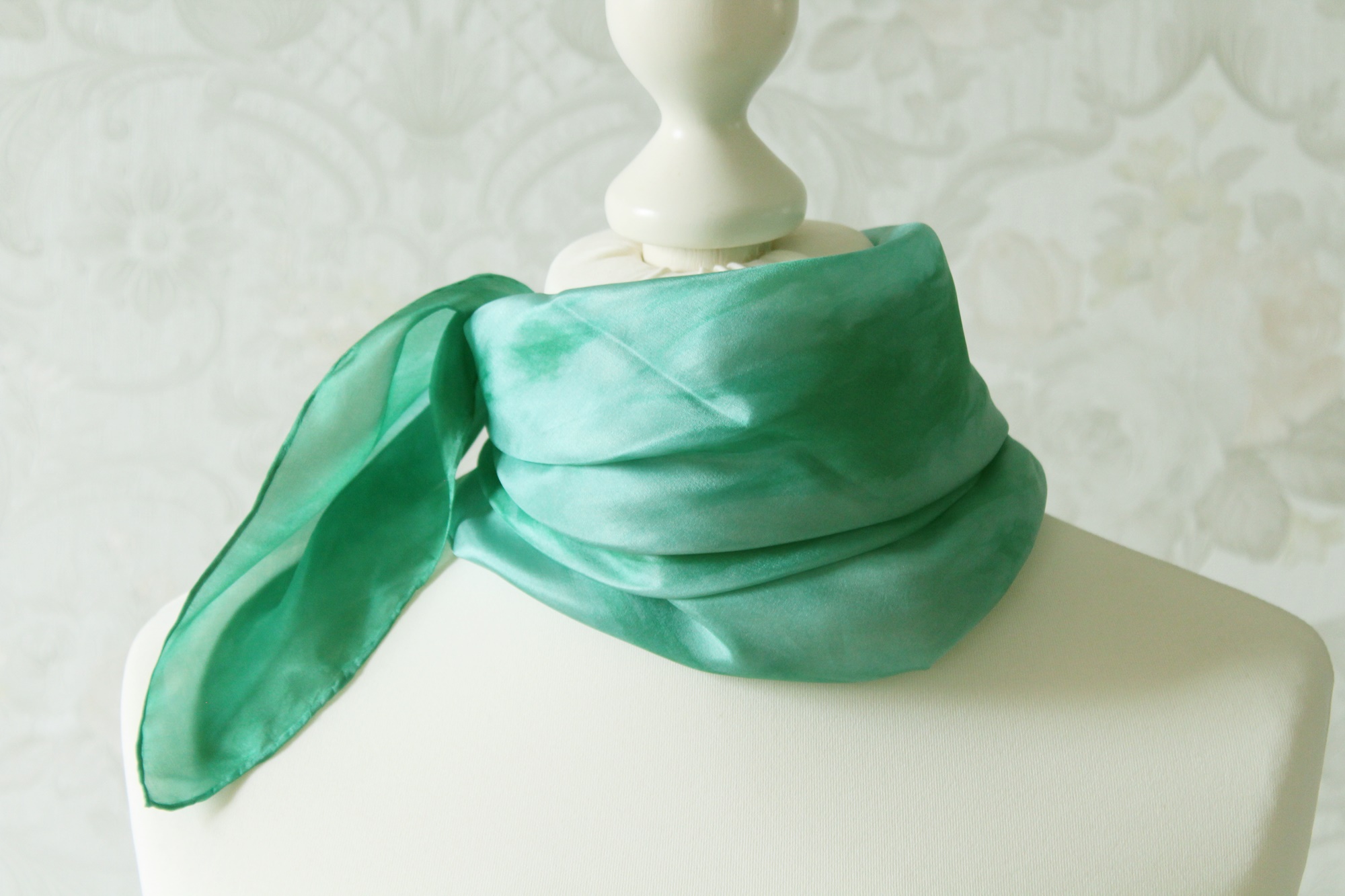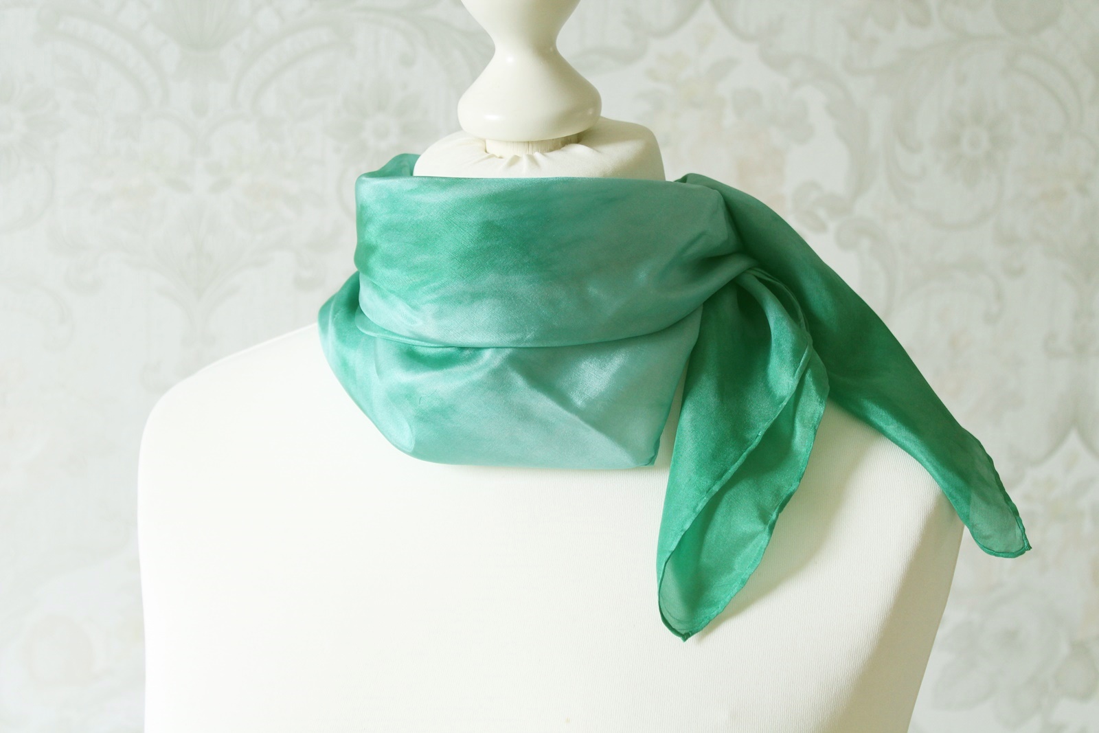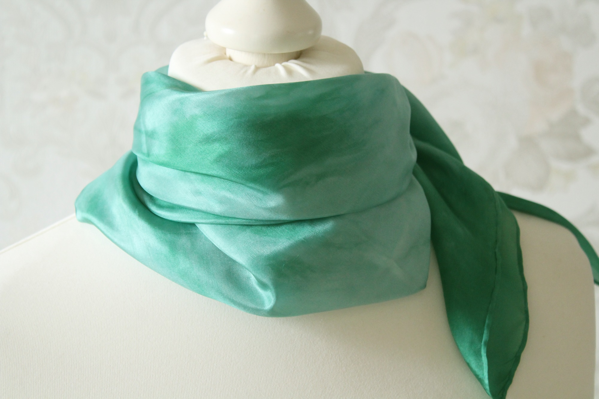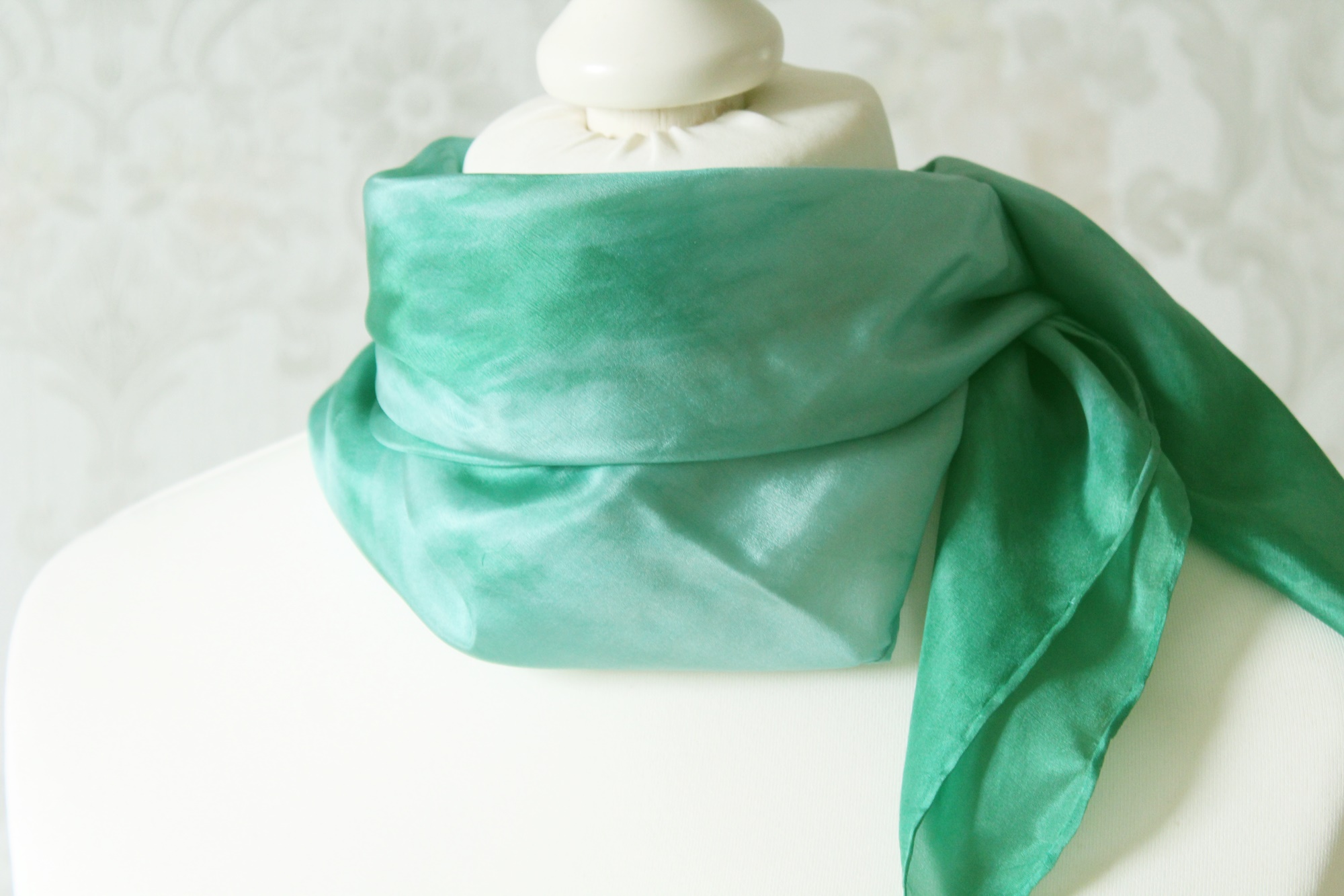 Kleines grünes, handcoloriertes Tuch aus Seide. Das Seidentuch kann man als Nickituch tragen. Aber auch für Kinder hat das kleine Seidentuch die richtige Größe. Das Nickytuch oder Kindertuch ist ca. 60 x 60 cm groß.
