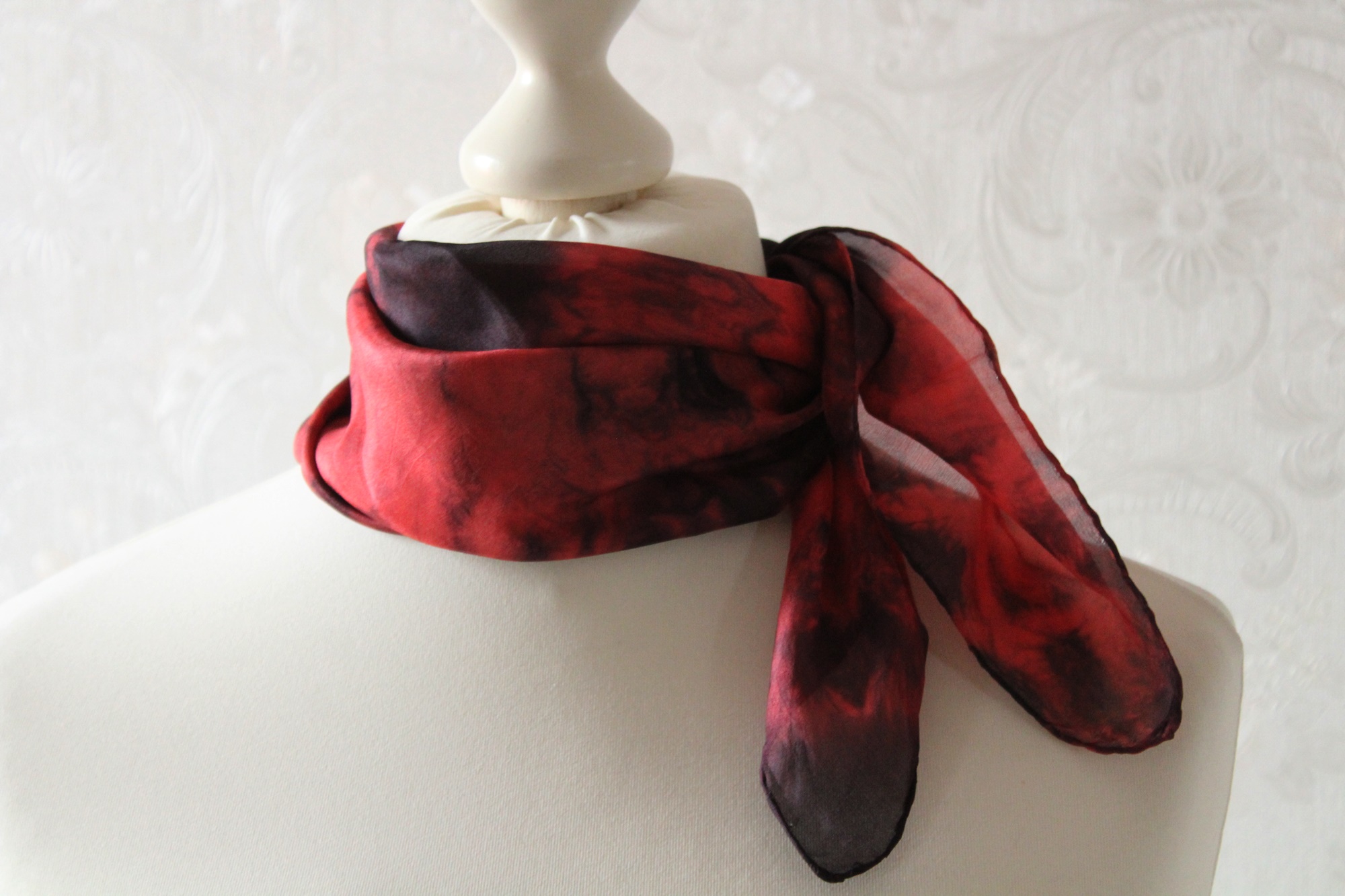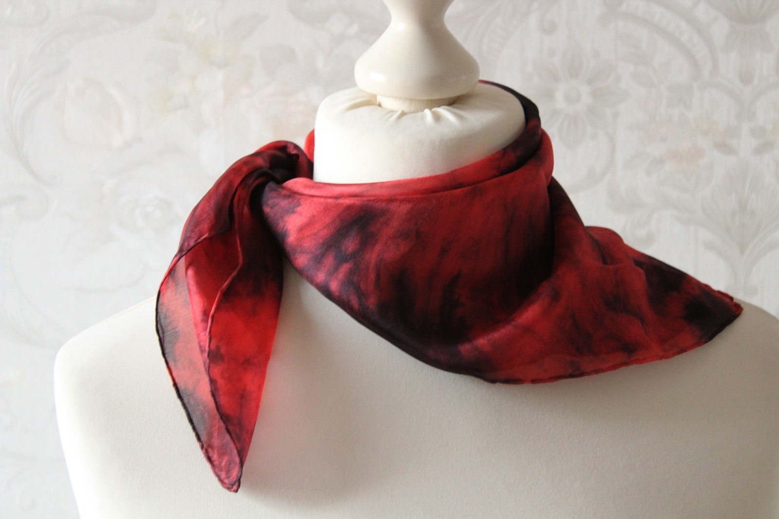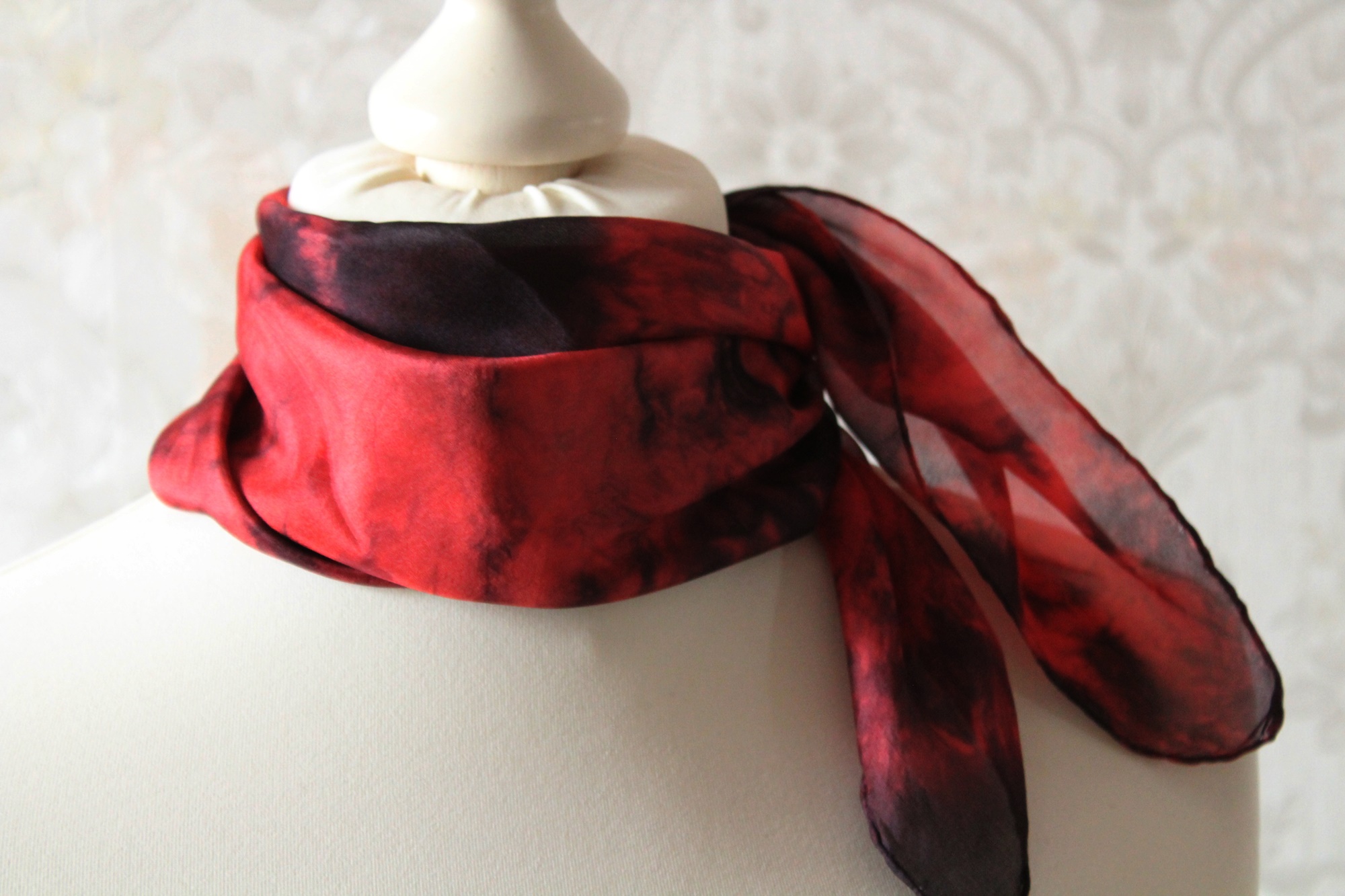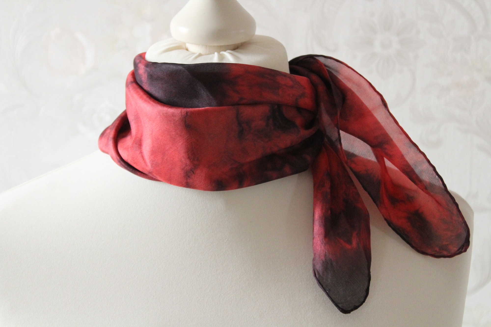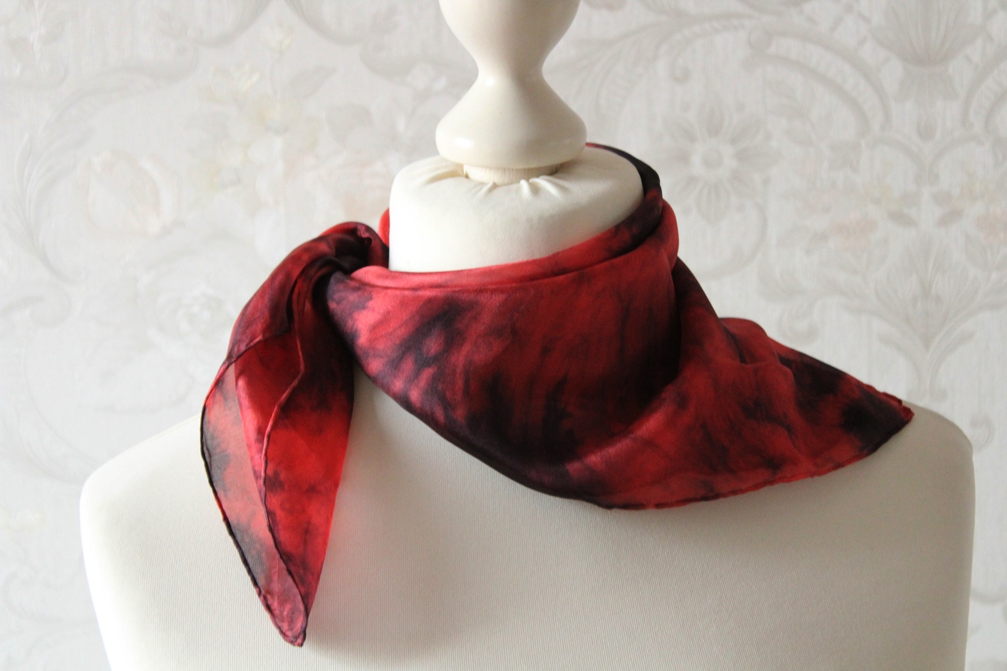 Kleines Seidentuch als Nickytuch aus der Serie Zirkel. Diese Seidentücher sind in roten und schwarzen Farben gearbeitet.