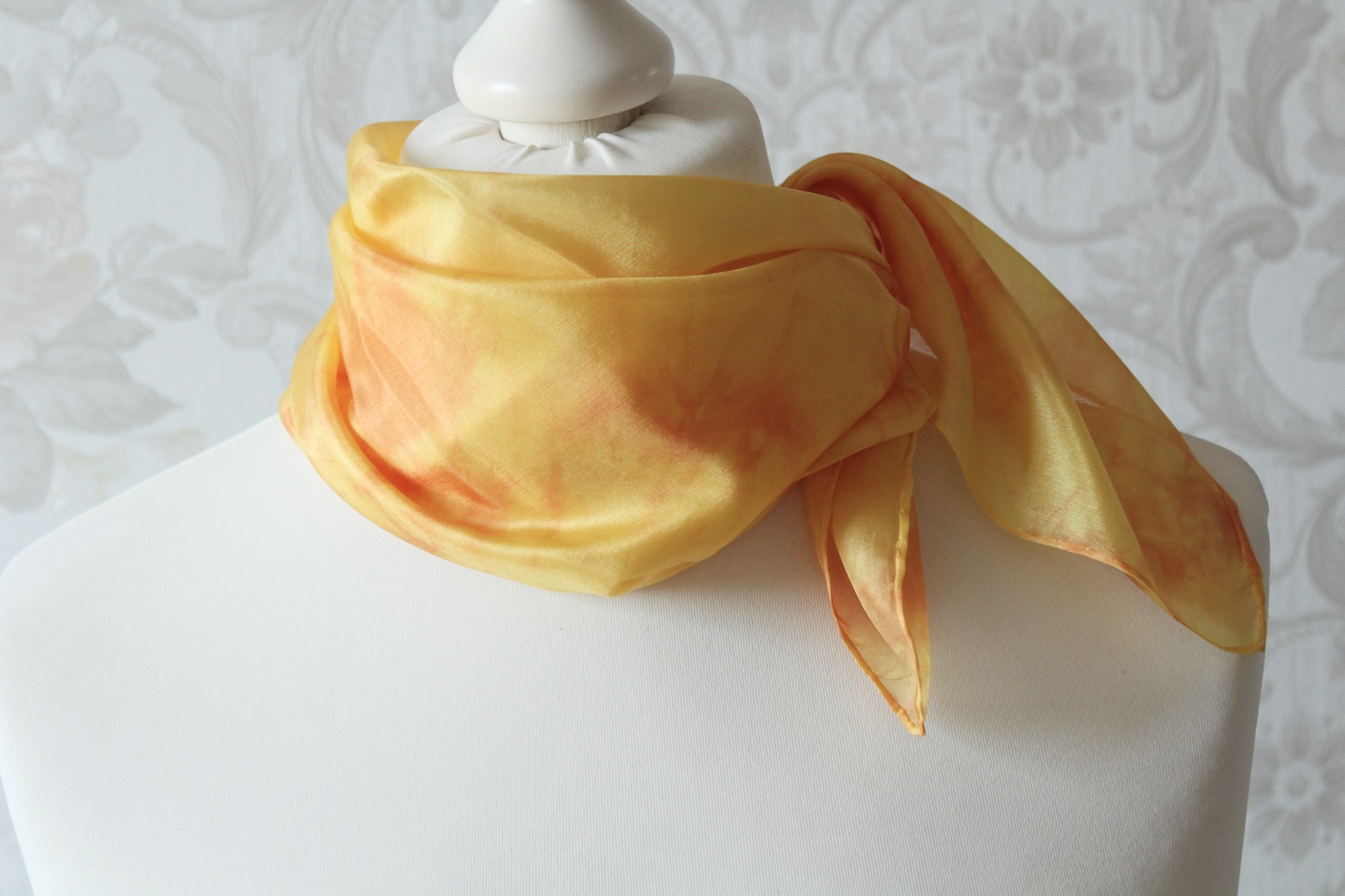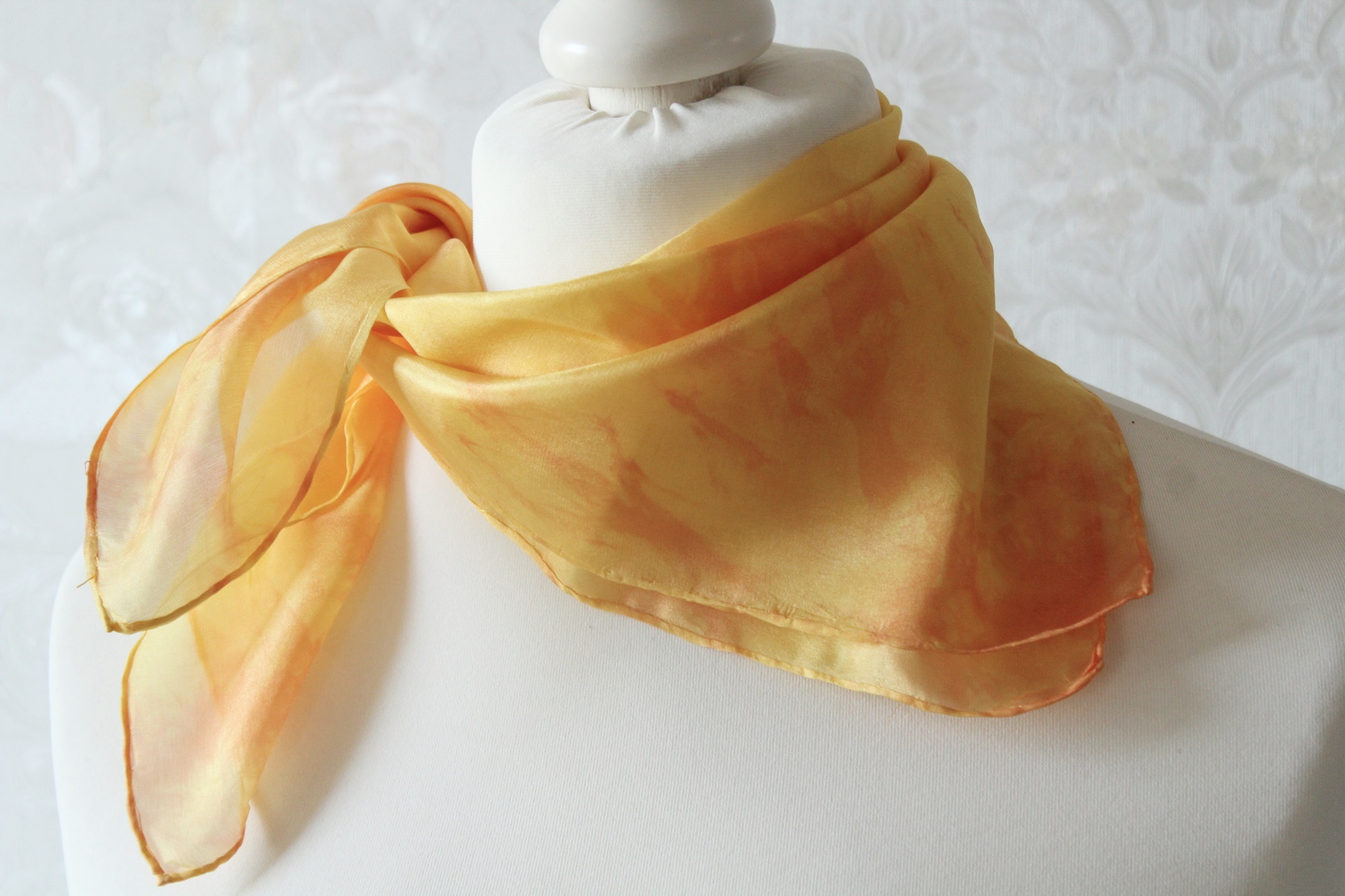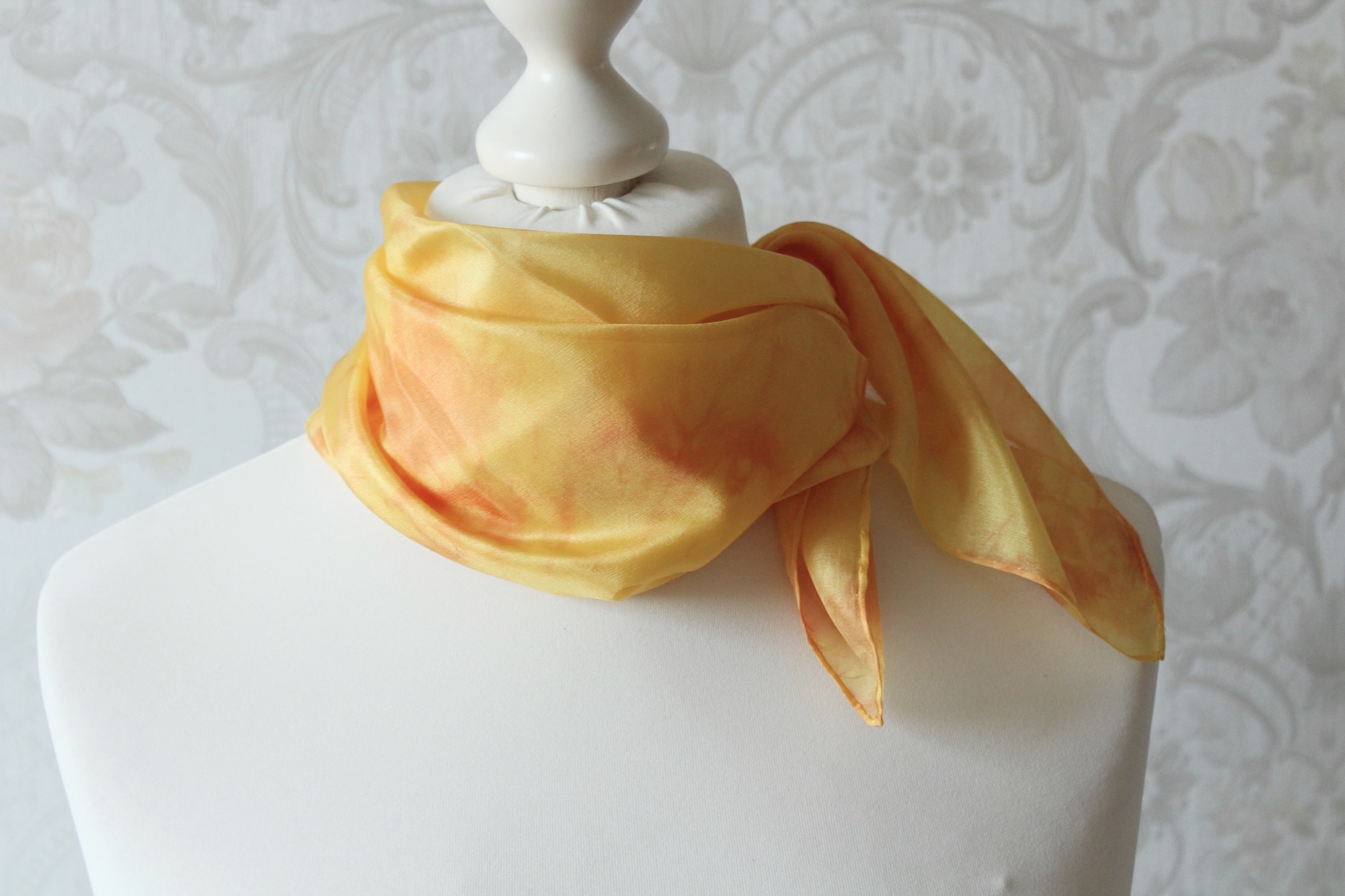 Miteinander geflüstert haben bei diesem kleinen Tuch gelbe und orange Farbtöne. Diese Farben sind freundlich und peppen besonders dunkle Outfits auf. Das Nickituch Farbgeflüster ist also ein von Hand bemaltes Seidentuch. Das Muster ist selbst entworfen bzw. entsteht beim Malen eher zufällig. Somit gibt es dieses Tuch genau so nicht noch einmal. Jedes für sich ist ein Einzelstück.