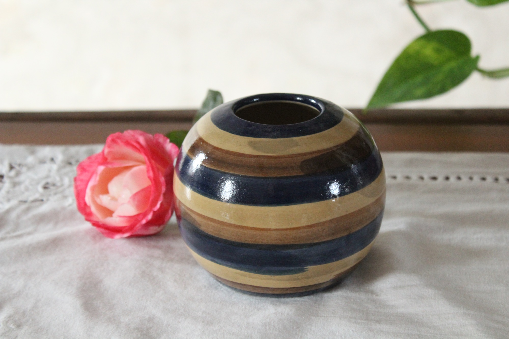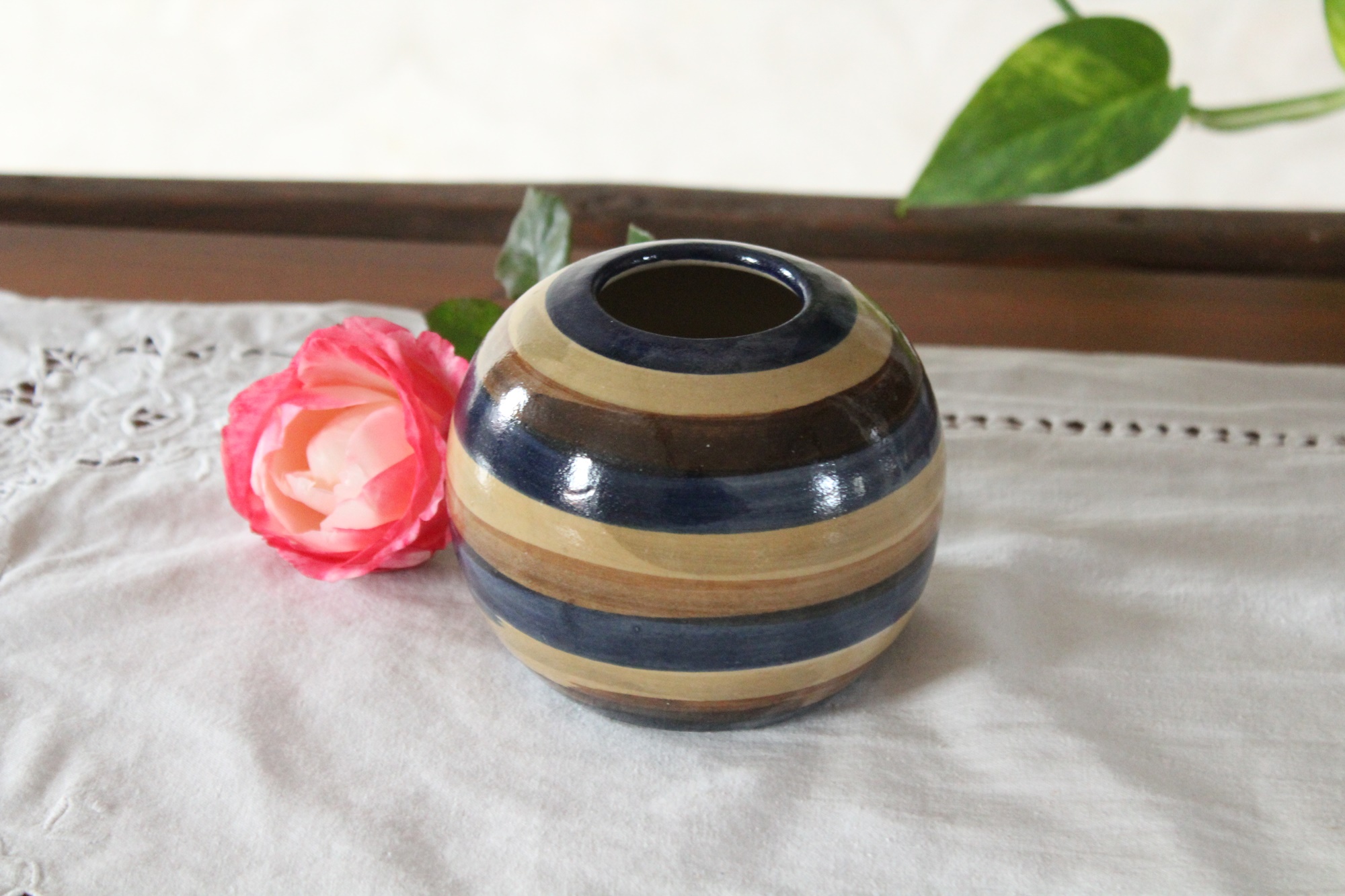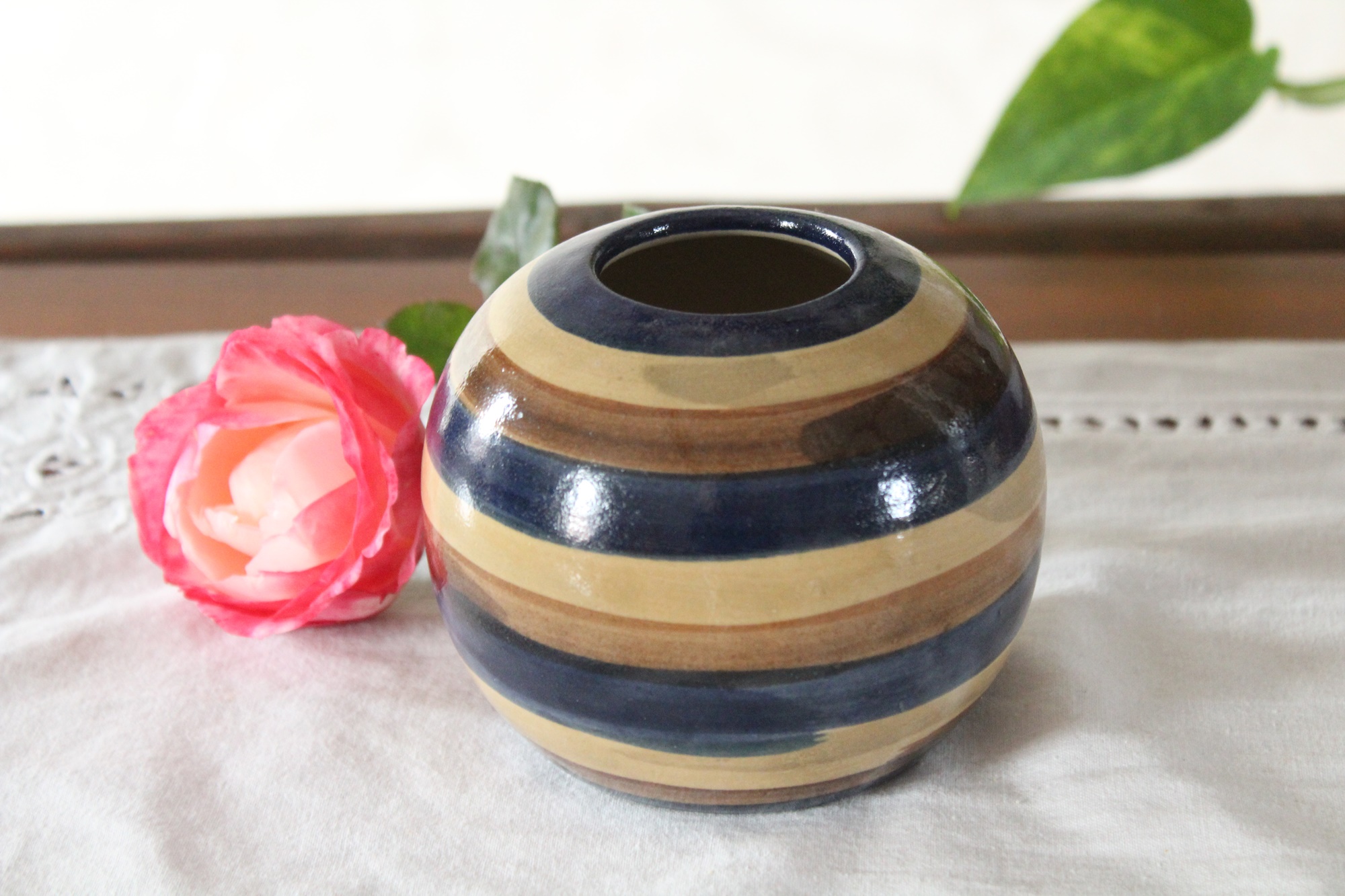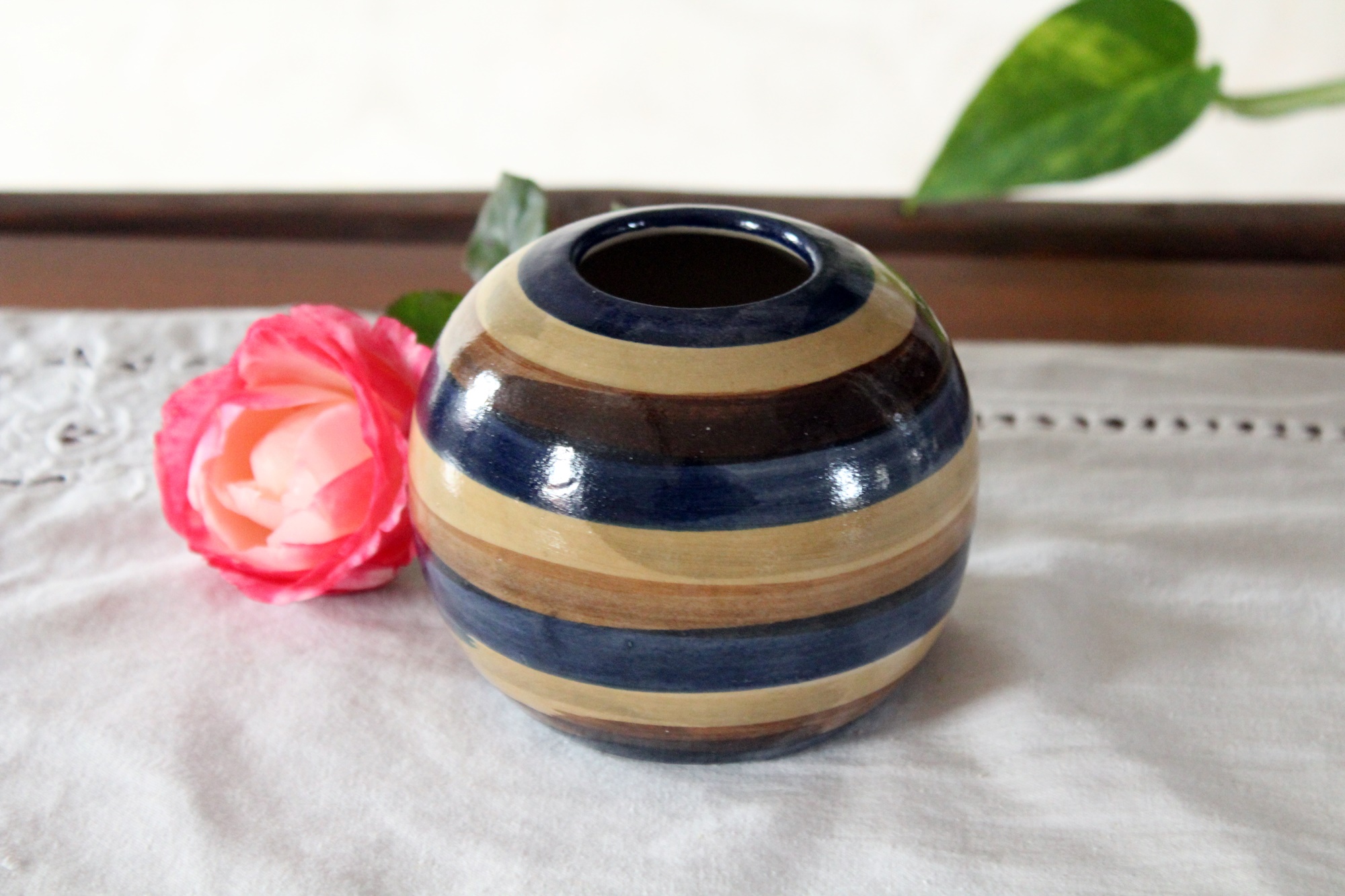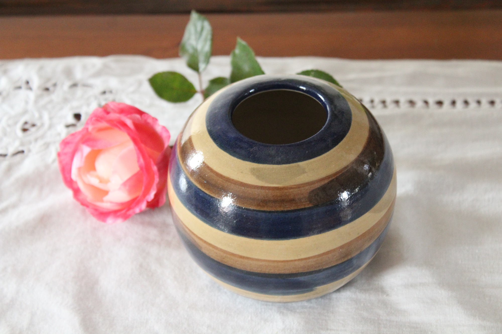 Süße, kleine getöpferte Kugelvase aus Anne und Siggi´s roter Keramik-Serie Ringel. Alle Töpferwaren aus dieser Ringel Serie sind in braunen, beigen und blauen Farben gearbeitet. Das Muster sind Streifen, die ringsherum laufen. Gearbeitet wurde hier mit Engobe. D.h. die Keramik wurde aufwendig bemalt und dann nochmal farblos glasiert. So darf sie auch in den Geschirrspüler. Jedes Stück ist etwas anders, jedes für sich ist ein Unikat. Und trotzdem ergibt die Keramik Serie ein Gesamtkonzept.