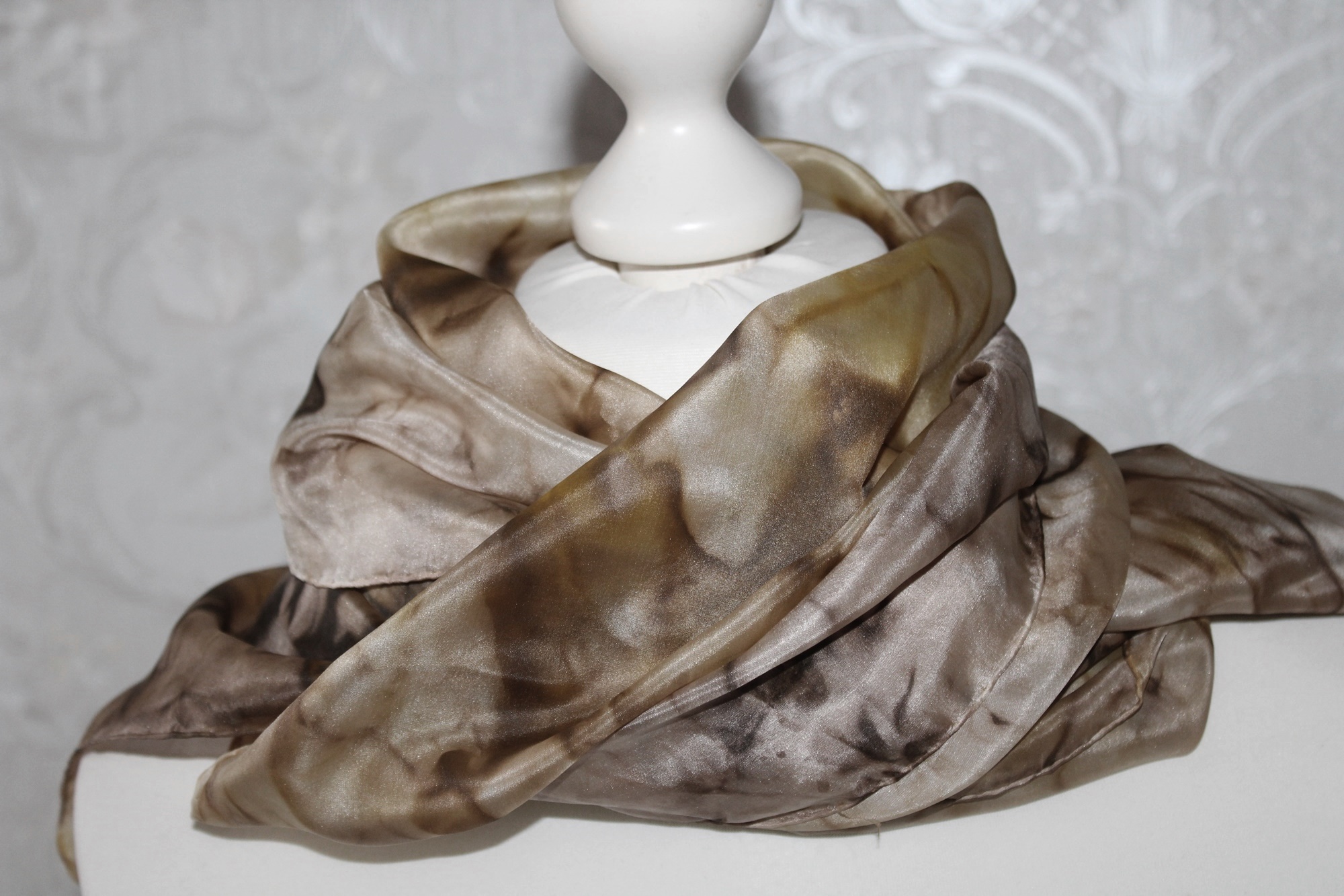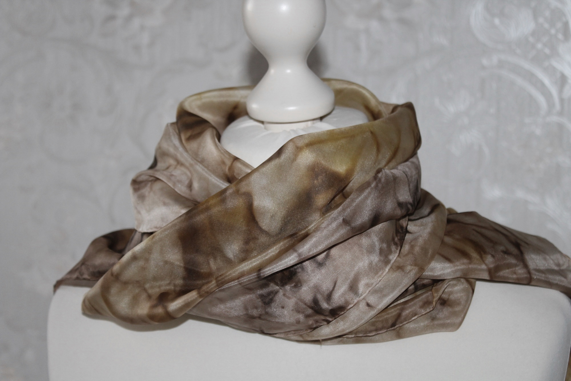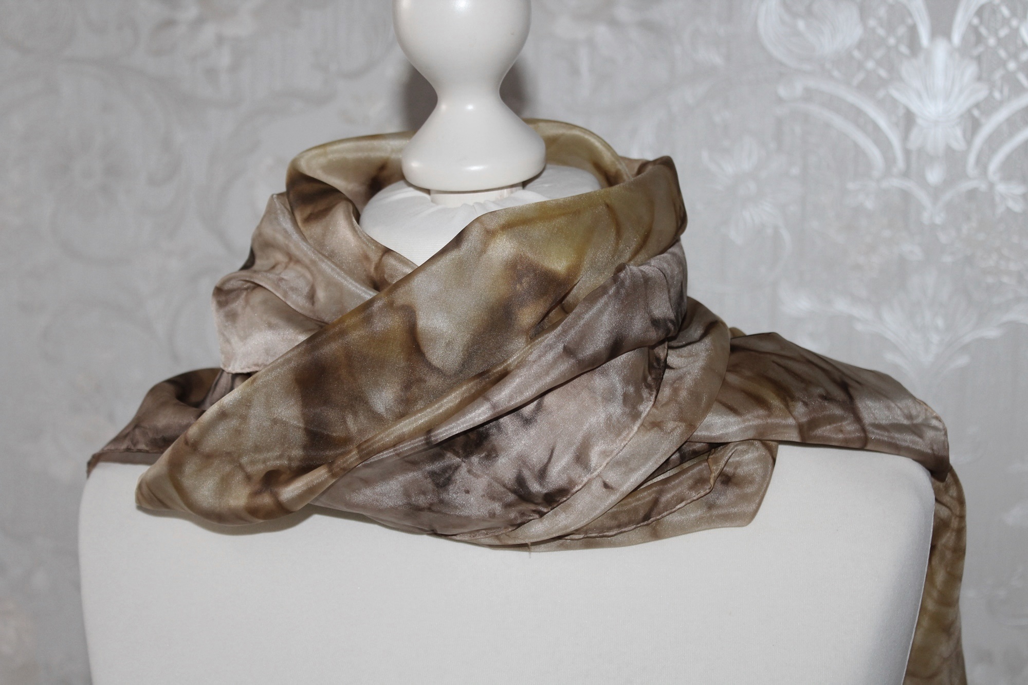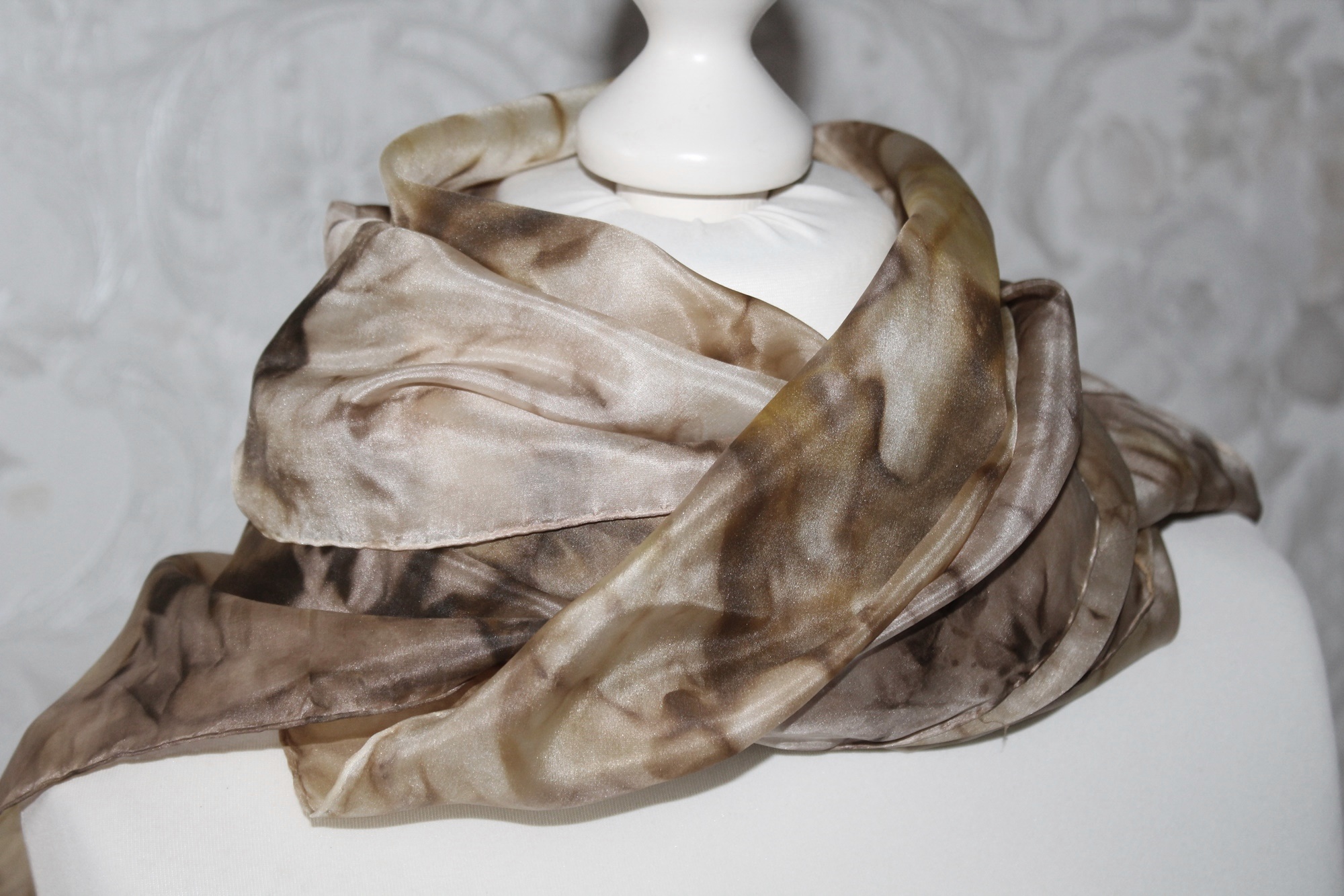 Pflege des Seidenschals: ich würde Handwäsche empfehlen, feucht bügeln oder auf das Bügeln verzichten, dann hat man eine leichte Crash Optik.