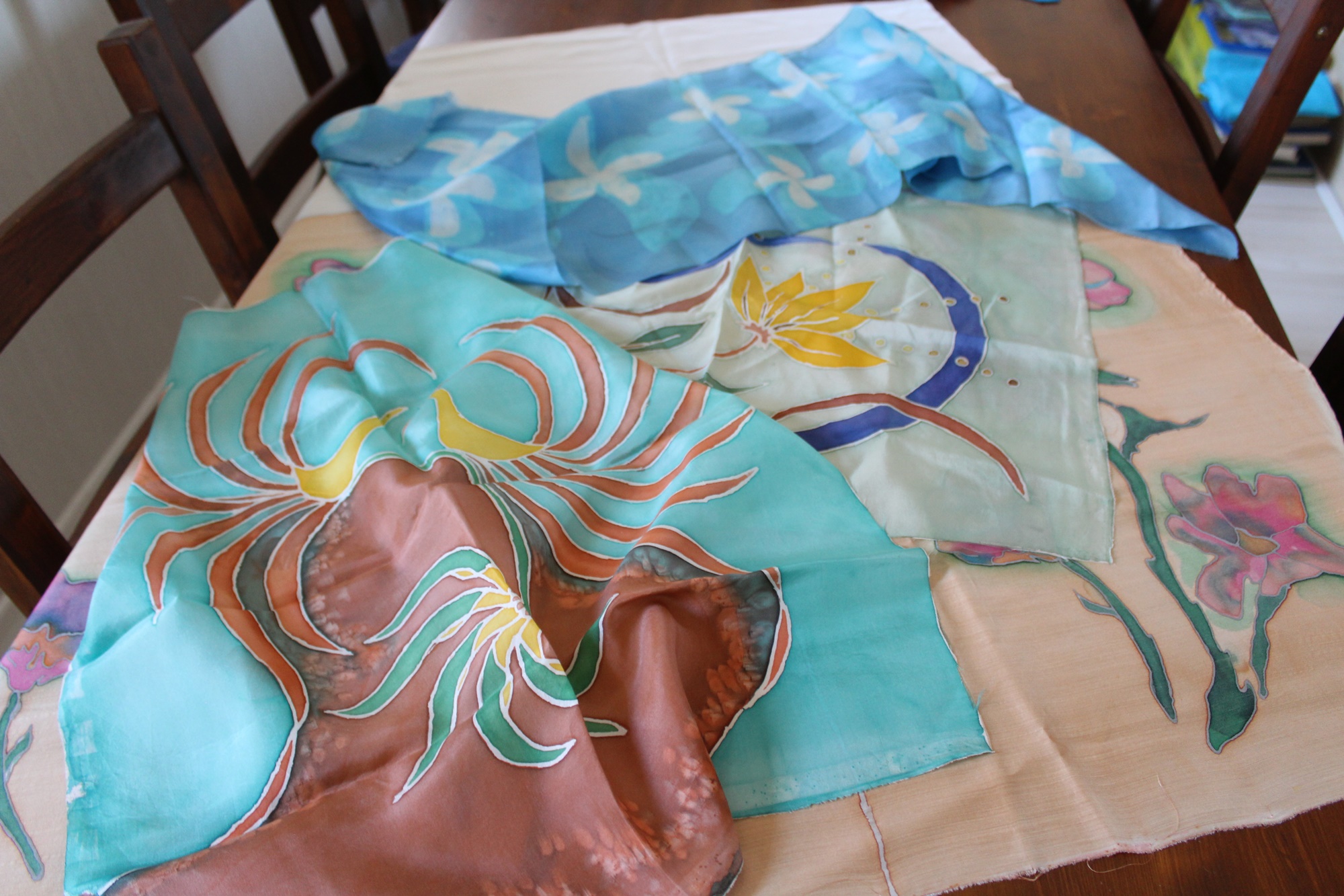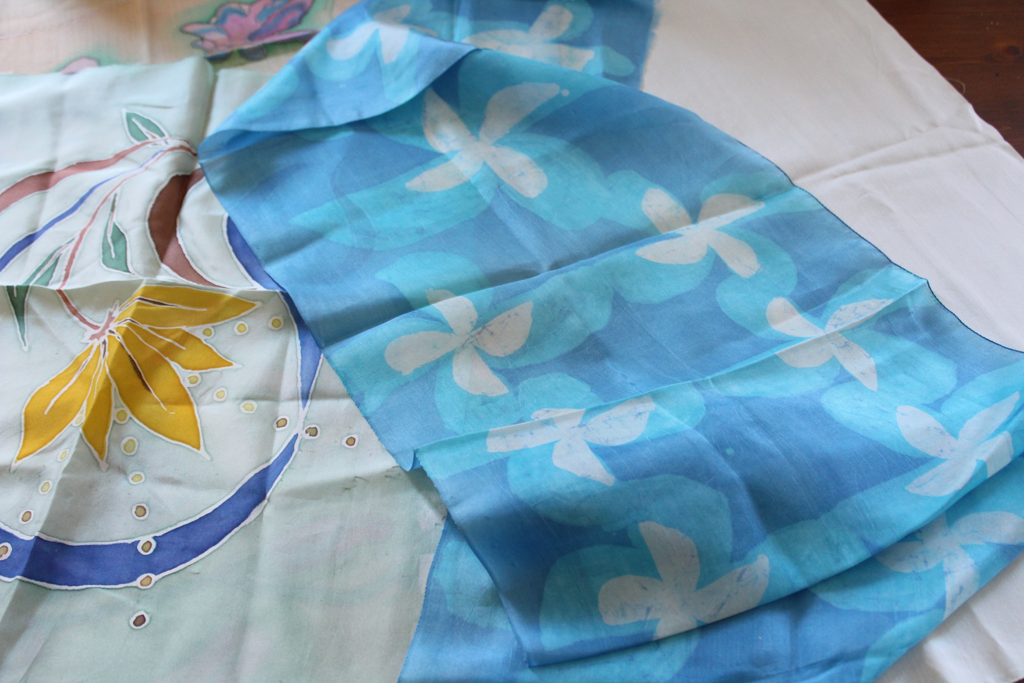 Der Seidenstoff (verschiedene Seidenarten) ist teilweise bemalt und gefärbt, er hat verschiedene Farben und Muster, siehe Fotos.
