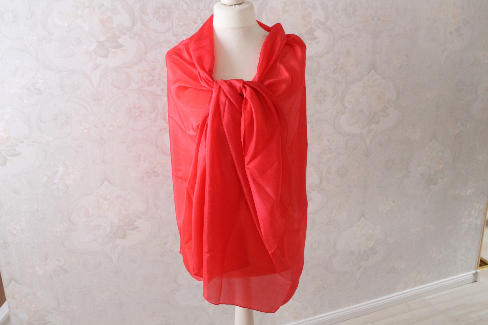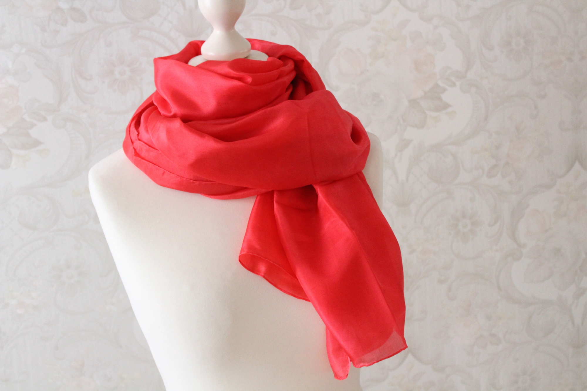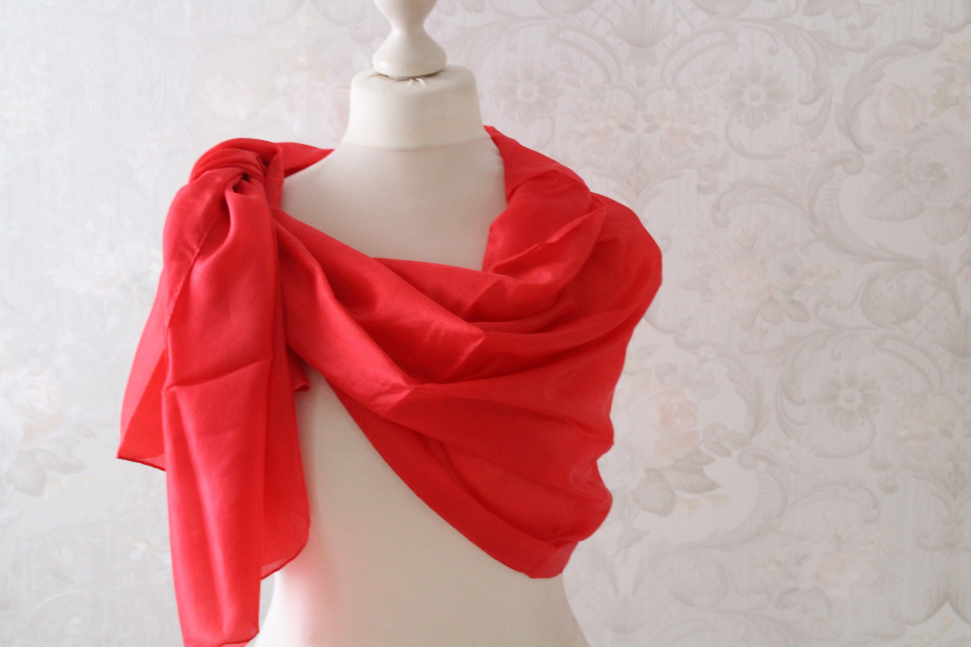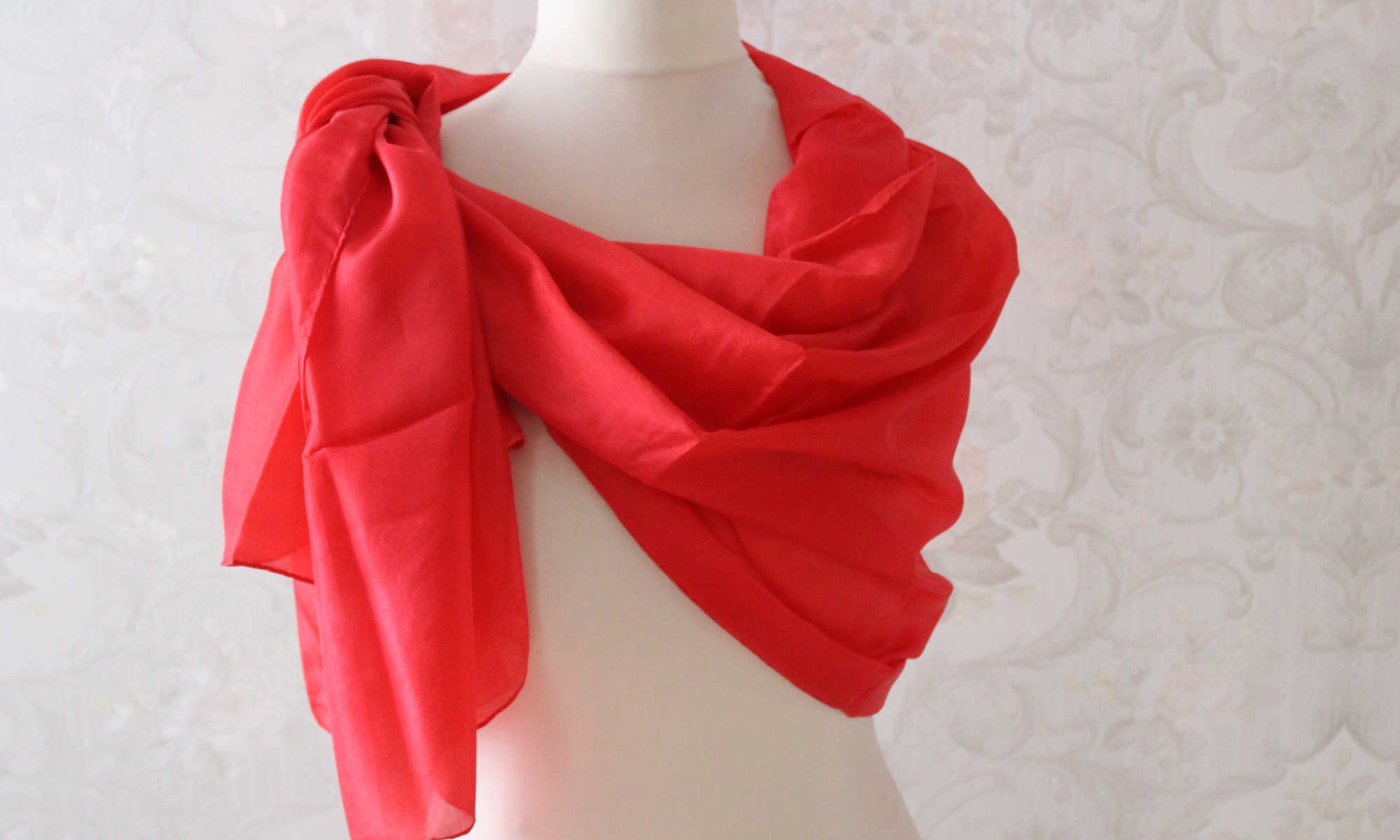 Extra großer roter Seidenschal, ein Tuch aus Seide in Handarbeit gefertigt. Der Schal ist 170 cm x 90 cm groß. So kann er auch gut als Stola getragen werden. Egal ob an kühlen Sommerabenden über Jeans oder zu besonderen Anlässen über einem tollen Kleid, als Strandtuch im Urlaub, das Tuch ist immer ein Hingucker.
