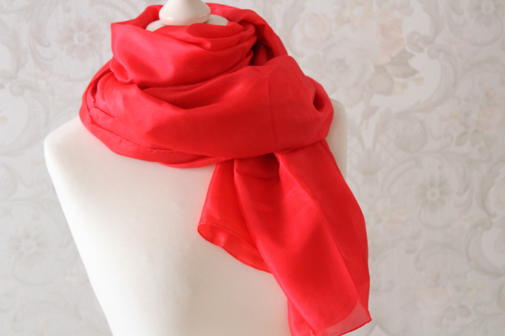 Die Farbe ist ein leuchtendes Rot. Es ist einfarbig und ohne Muster, hat lediglich leichte Farbschattierungen. Die verwendete Seide ist eine leichte, glatte Ponge Seide. Das Tuch ist handcoloriert, ist ein Unikat, er ist nur 1 x verfügbar.