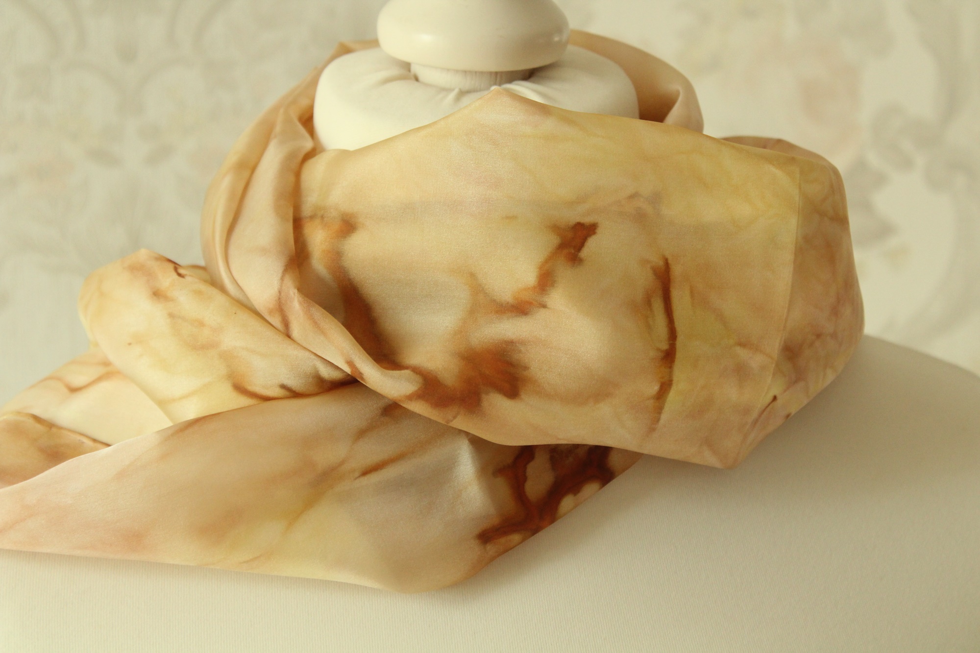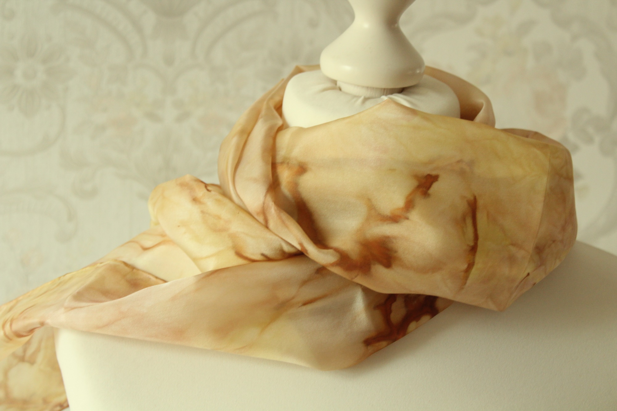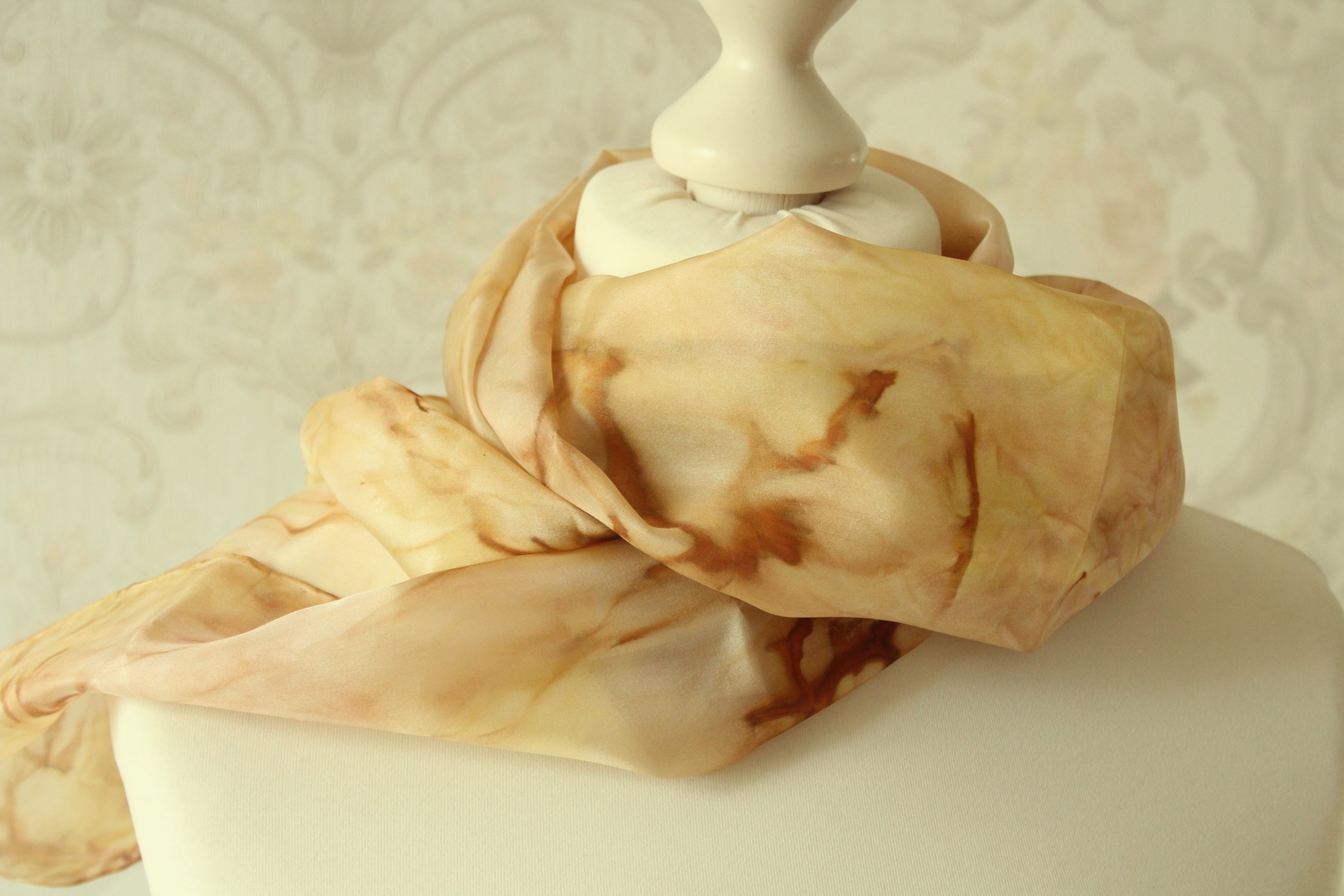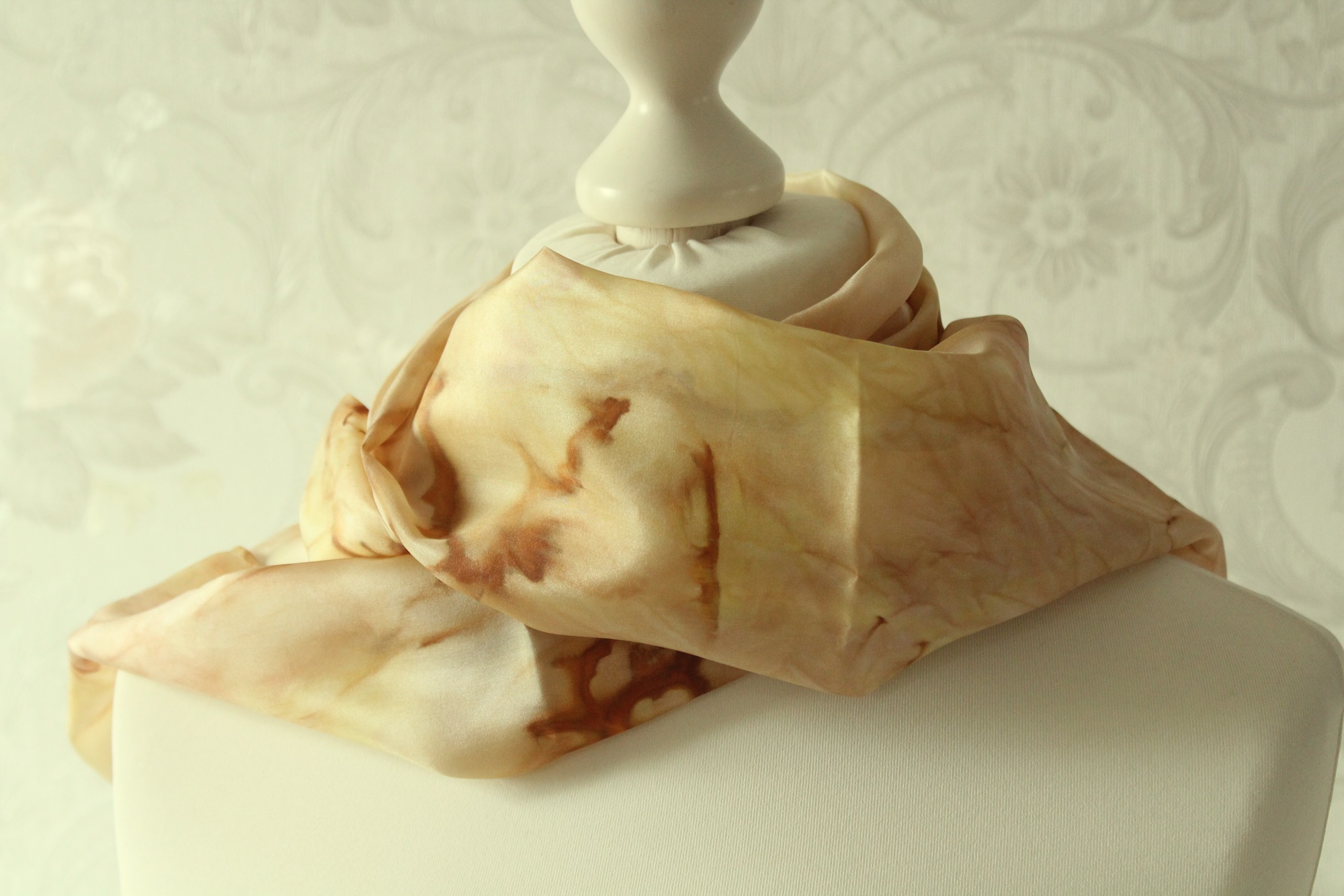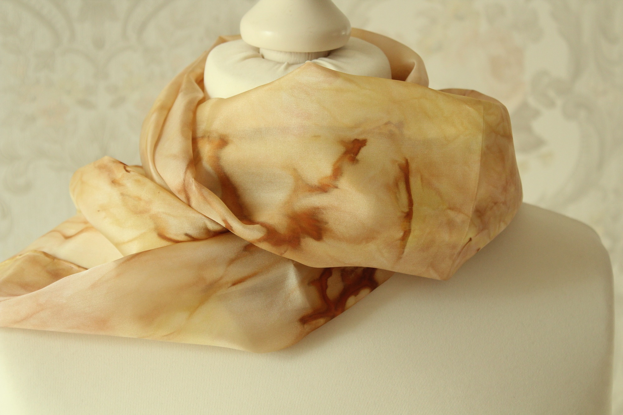 Das Satin Seidentuch Fantasie ist in verschiedenen beige braunen Farbtönen gestaltet. Es ist ein handbemaltes Einzelstück.