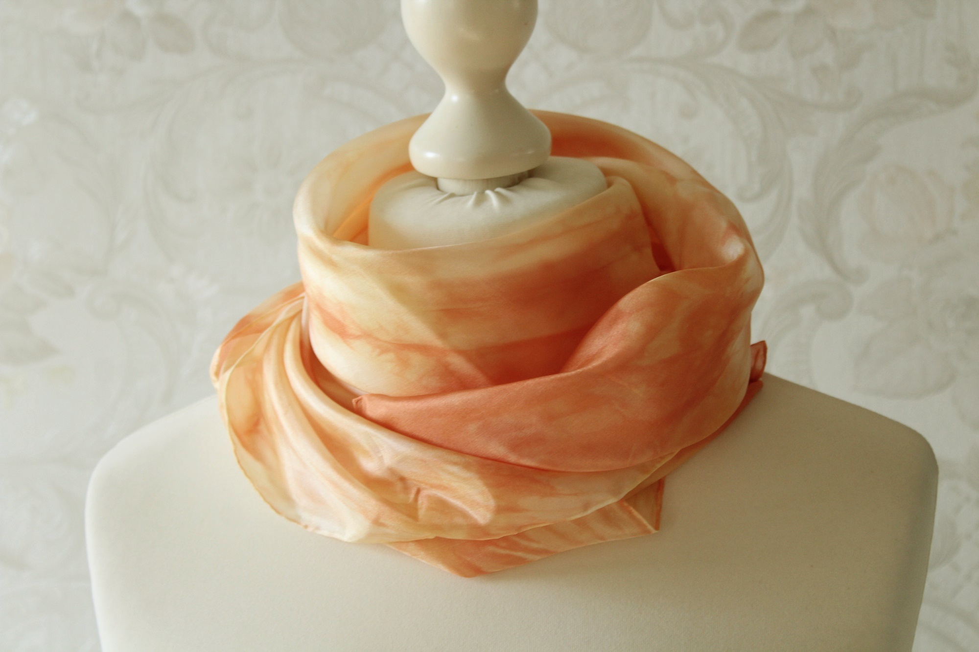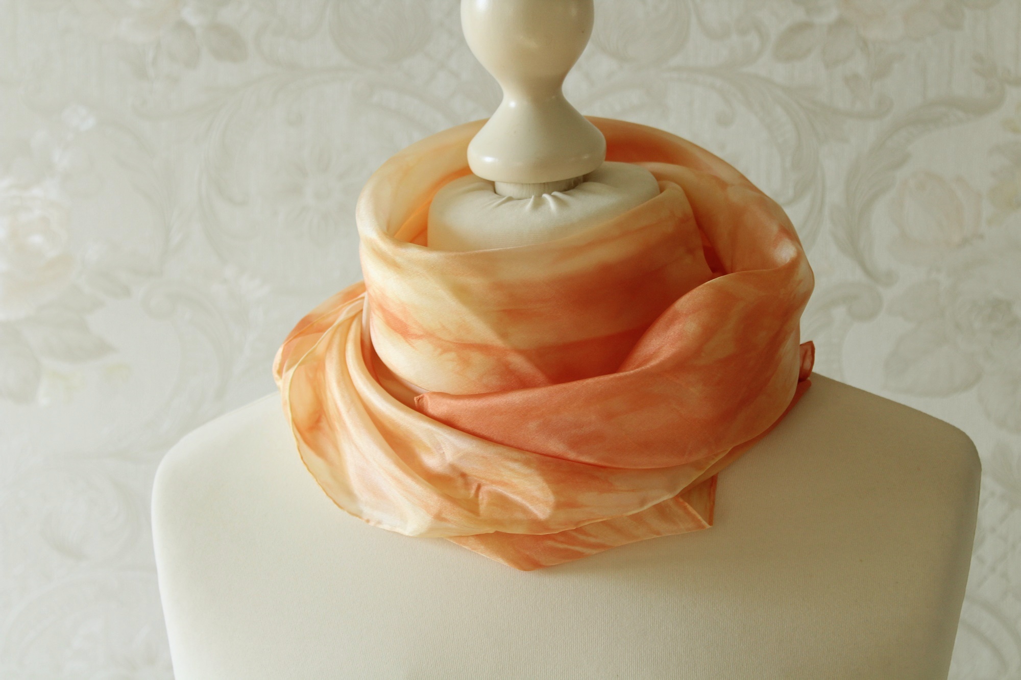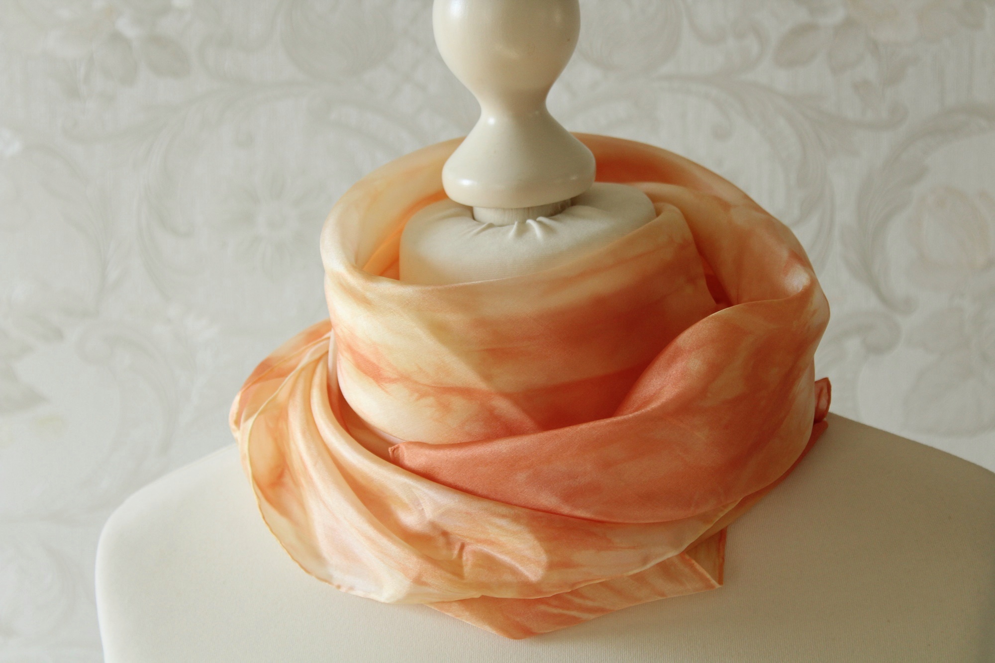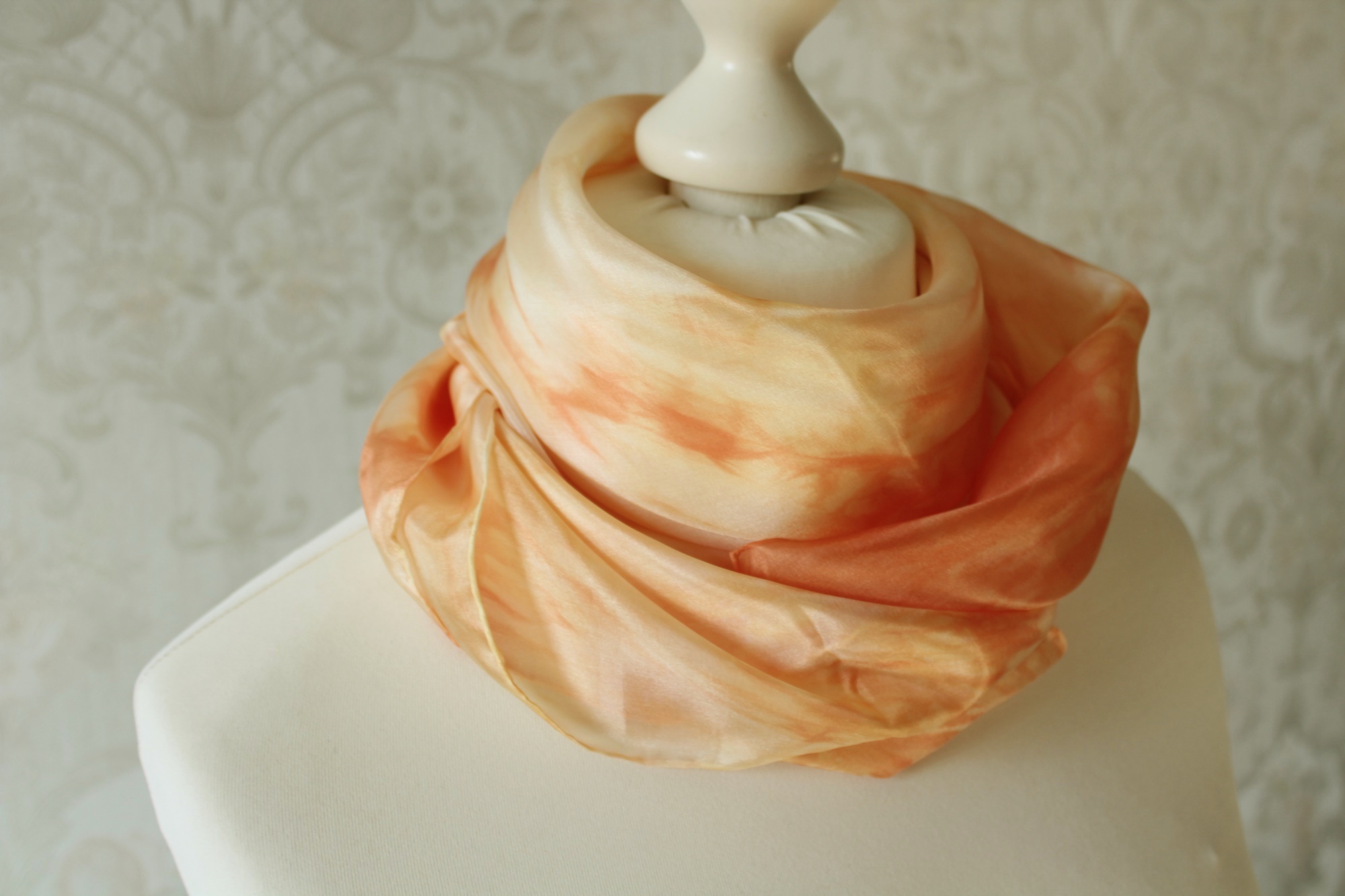 Seidentuch in orange gelben Tönen, in Handarbeit gefertigt. Seide ist ein ganz besonderer Stoff. In Sommer kühl, im Winter warm. Somit hat man mit diesem Seidentuch einen Begleiter das ganze Jahr über.
