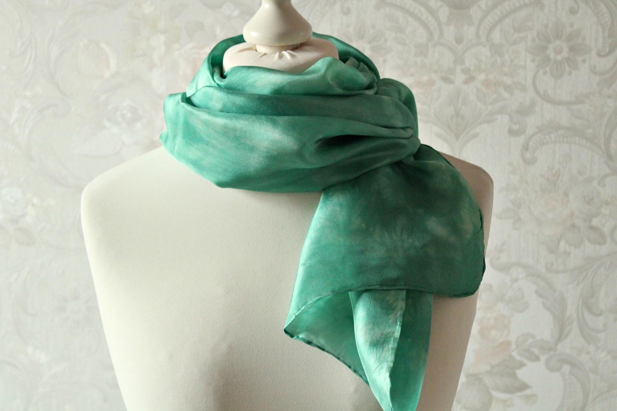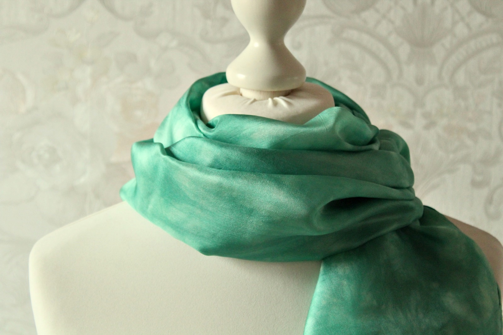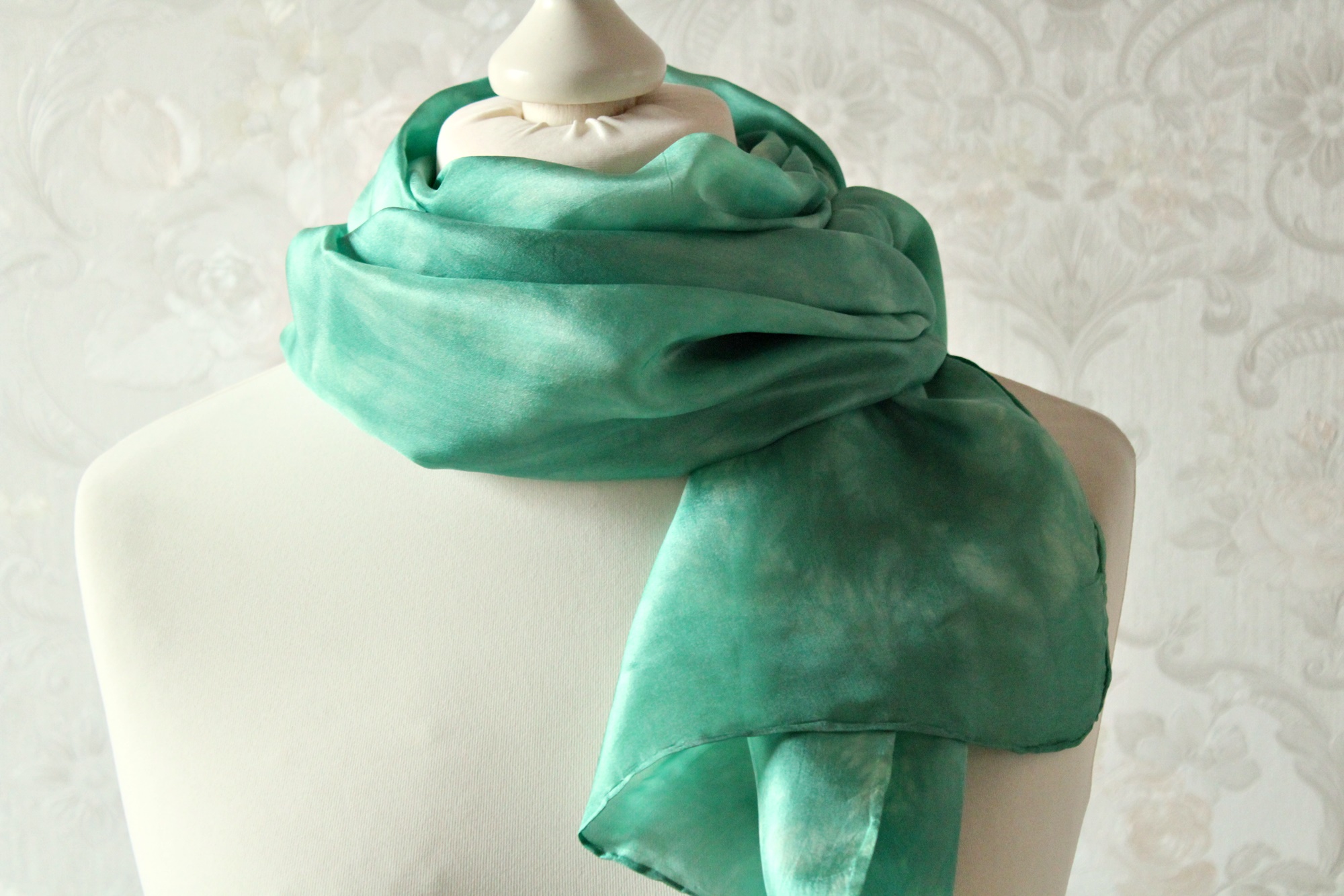 Seidenschal Fantasie in grünen Farbtönen, ein handbemaltes Einzelstück, ein besonderes Geschenk für Frauen und Mädchen. Bei diesem Schal flüstern also grüne Farben in verschiedenen Farbnuancen miteinander. Durch die drei Arbeitsschritte Bemalen der Seide, Abbinden und Färben entstehen diese Muster eher zufällig. Somit gibt es diesen Schal genauso nicht noch einmal.