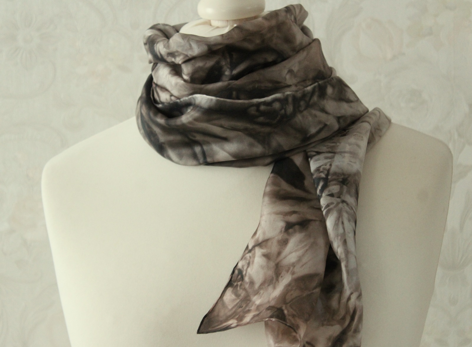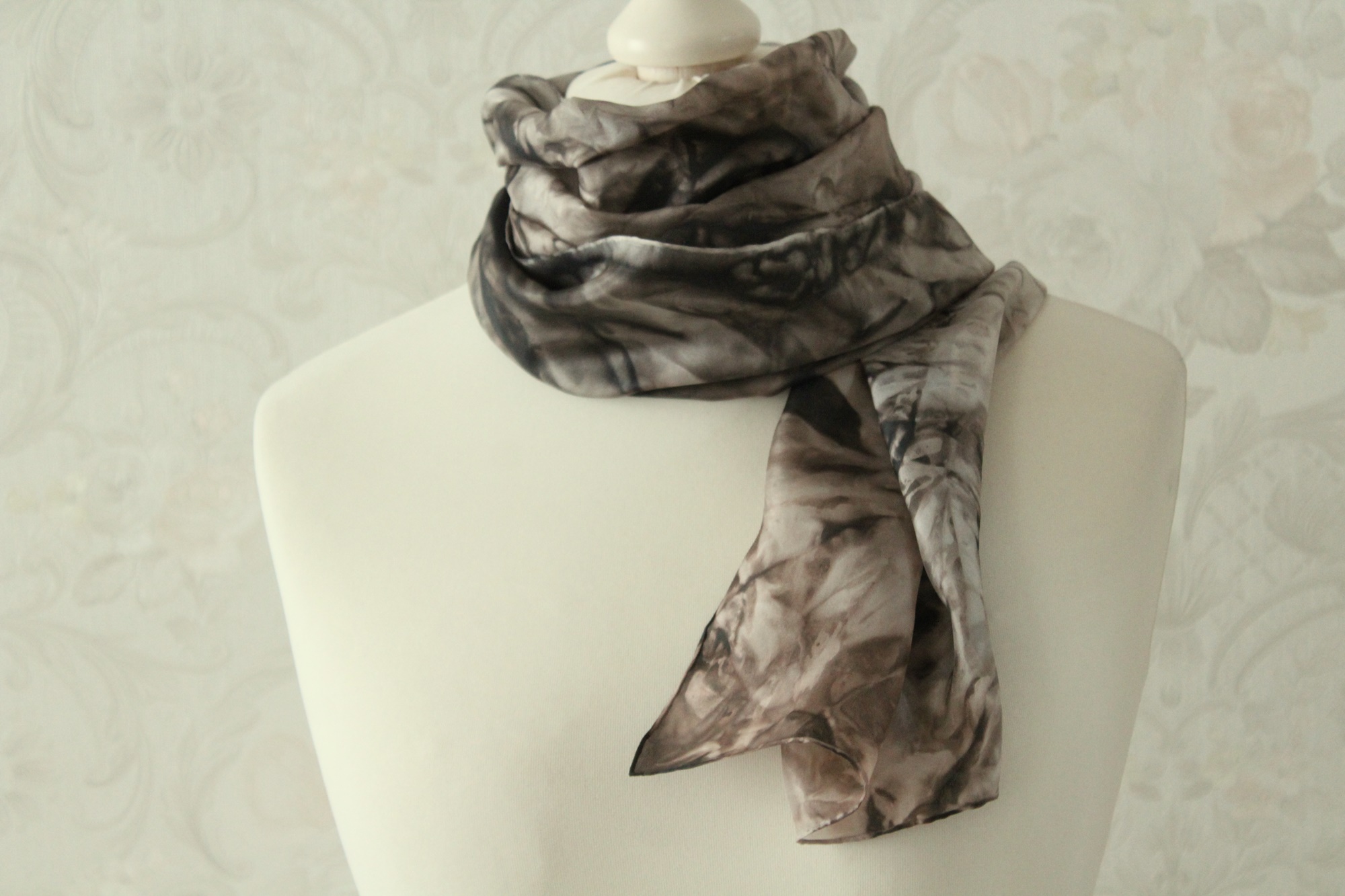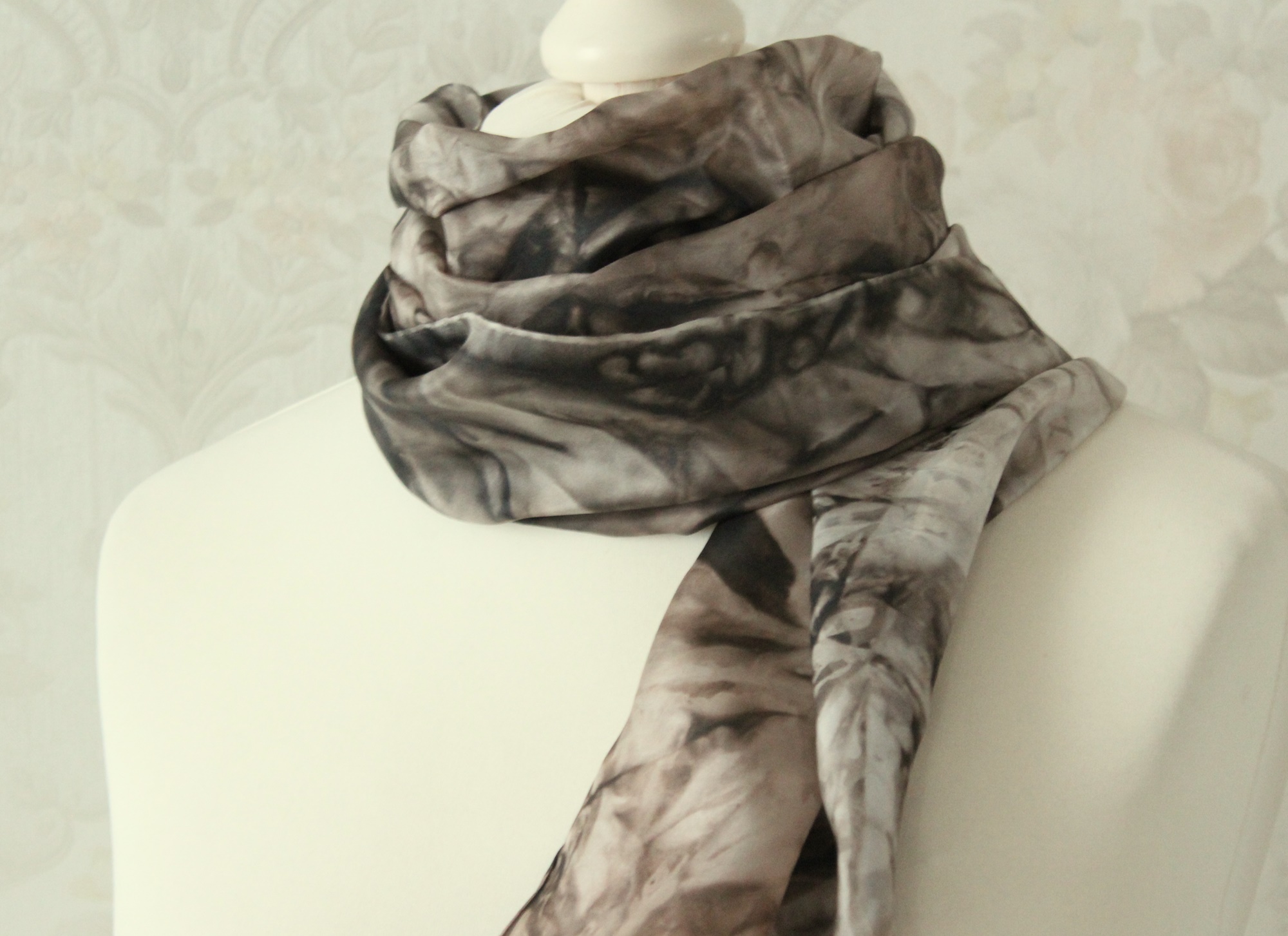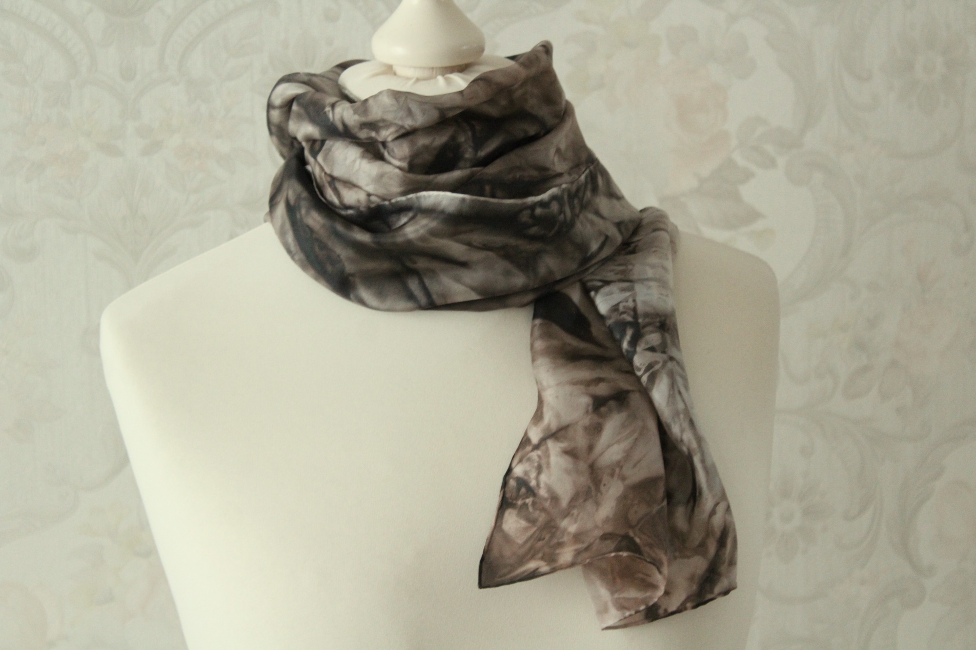 Seidenschal handbemalt in den Farben Schwarz und Braun, ein Schal aus Seide der besonders über einfarbigen hellen Shirts, Pullis oder Blusen ein Hingucker ist.