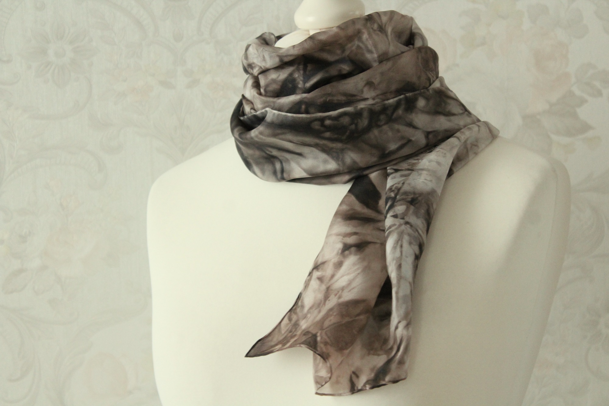 Pflege des Seidenschals: ich würde Handwäsche empfehlen, feucht bügeln oder auf das Bügeln verzichten, dann hat man eine leichte Crash Optik.