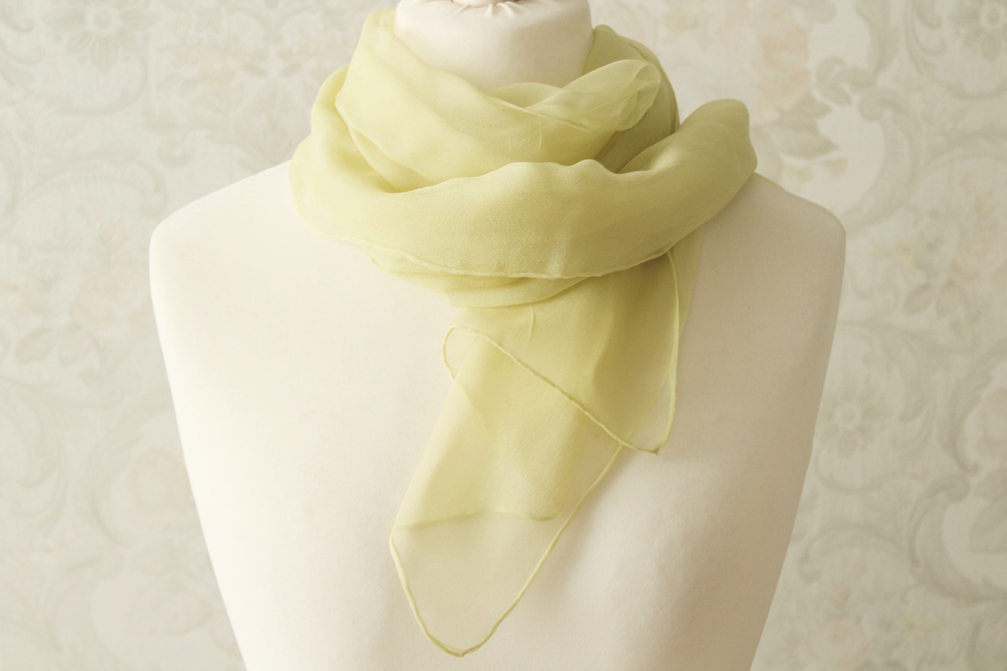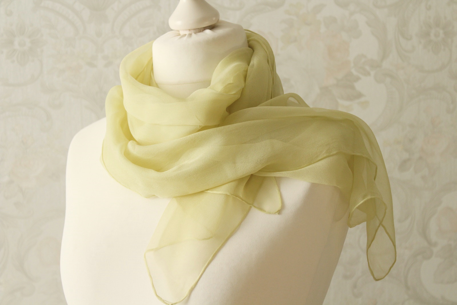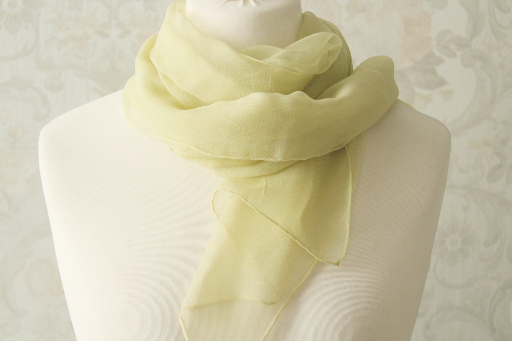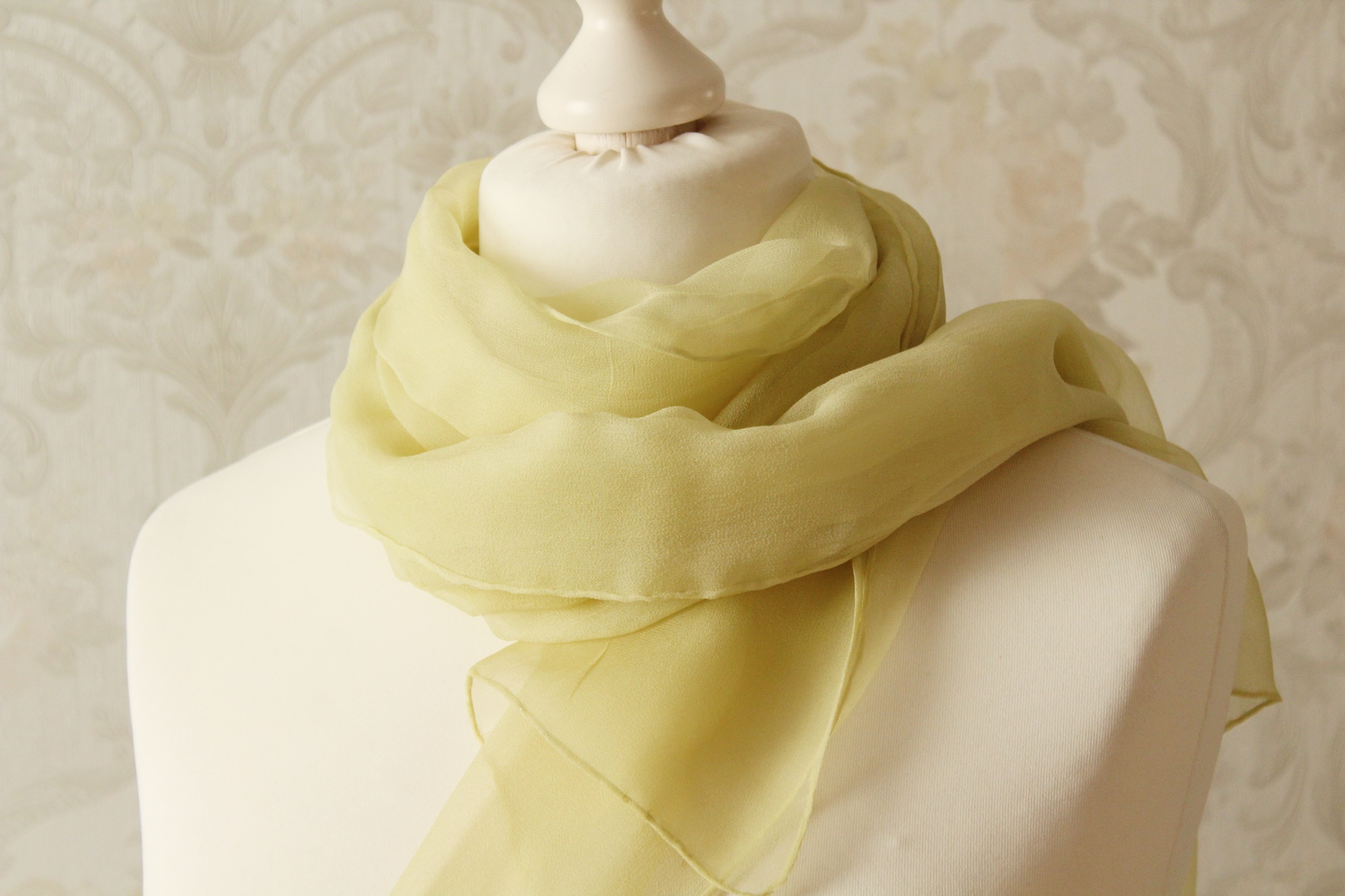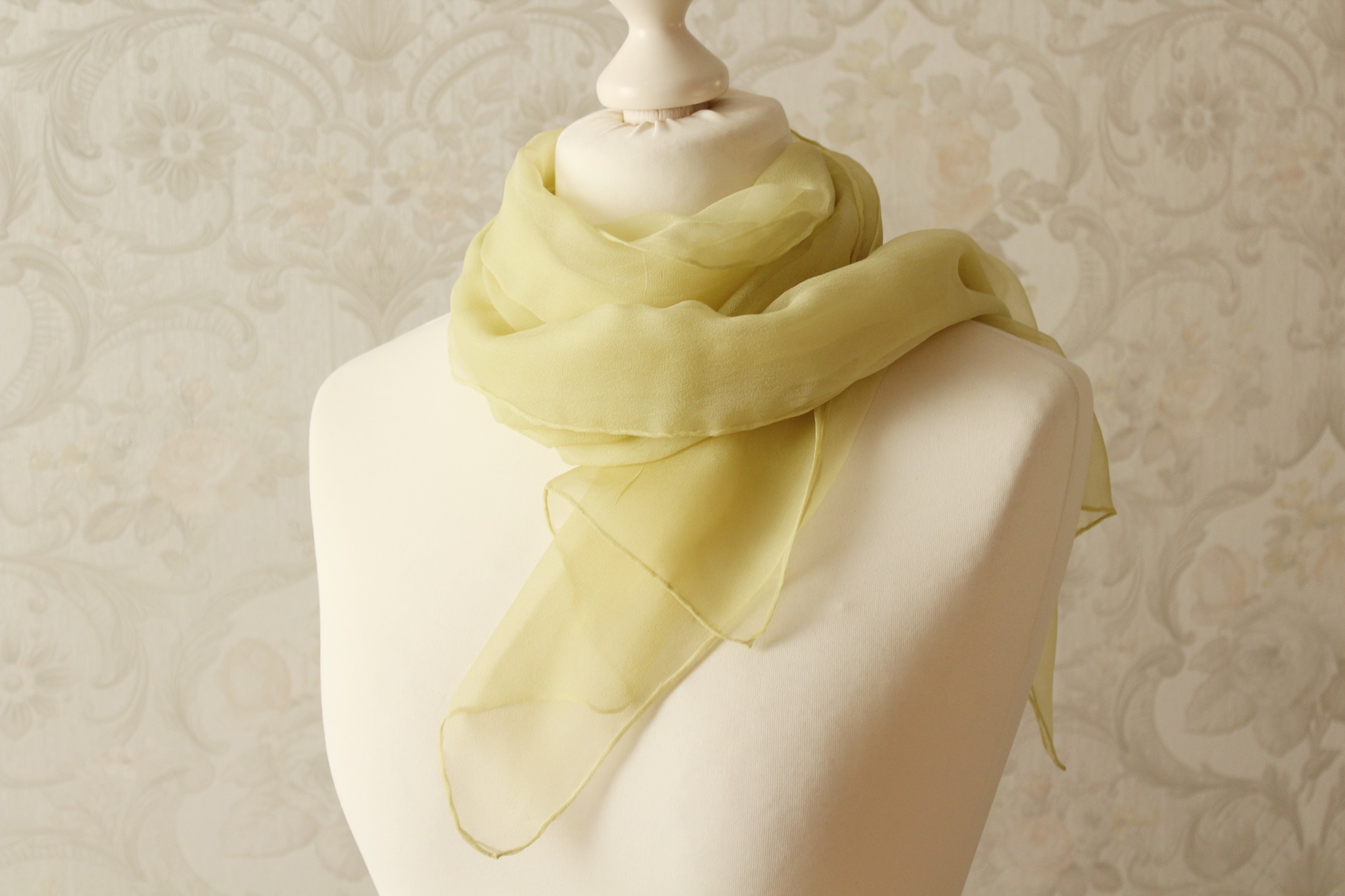 Diese Schals sind aus Seidenchiffon. Sie sind hauchzart und luftig, ein Tuch welches auch gut im Sommer getragen werden kann. Die Farbe ist freundlich, ich würde sie als grünlich beige bezeichnen und peppt jedes Outfit auf. Die Schals sind handcoloriert und ohne Muster.