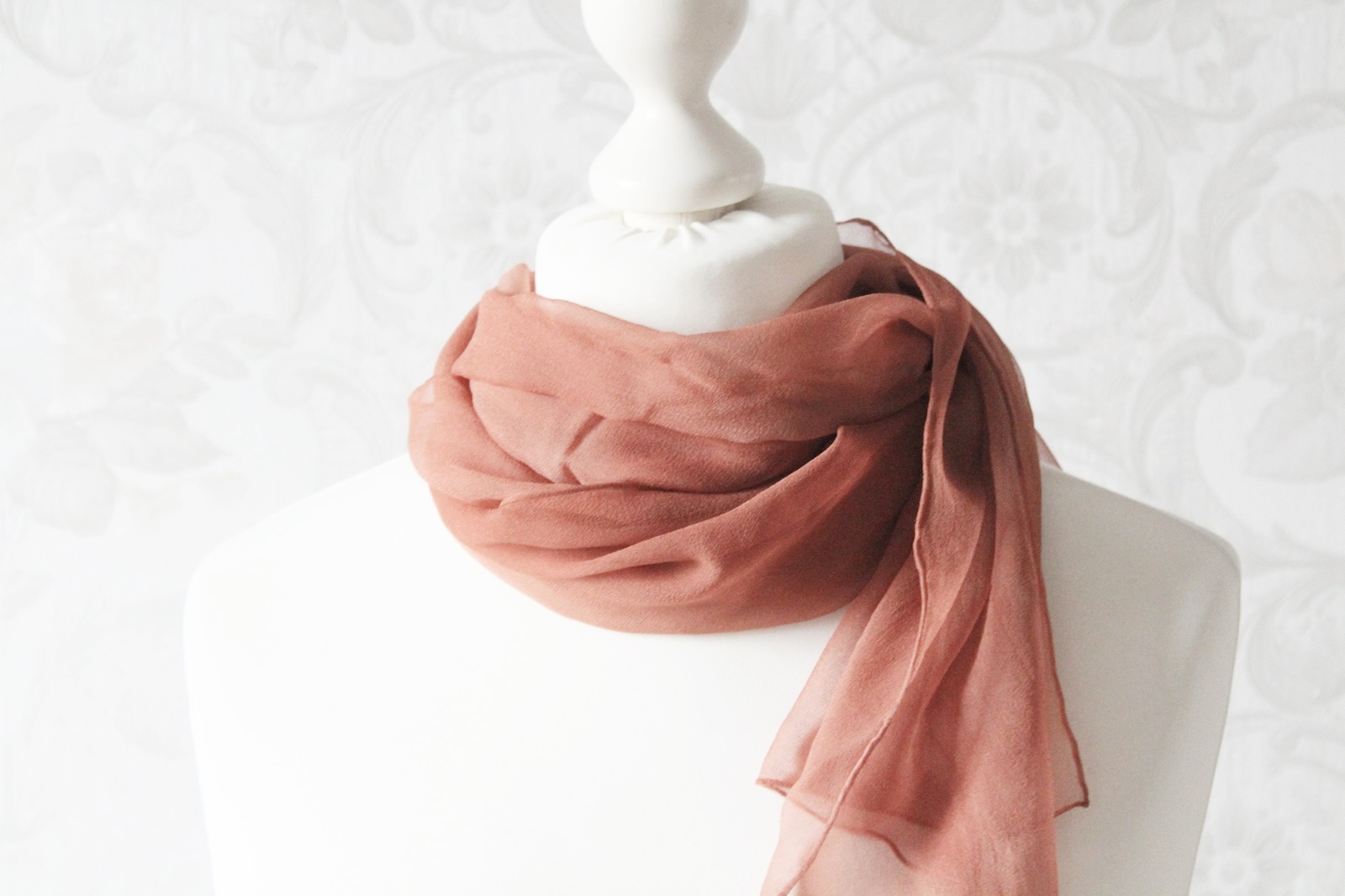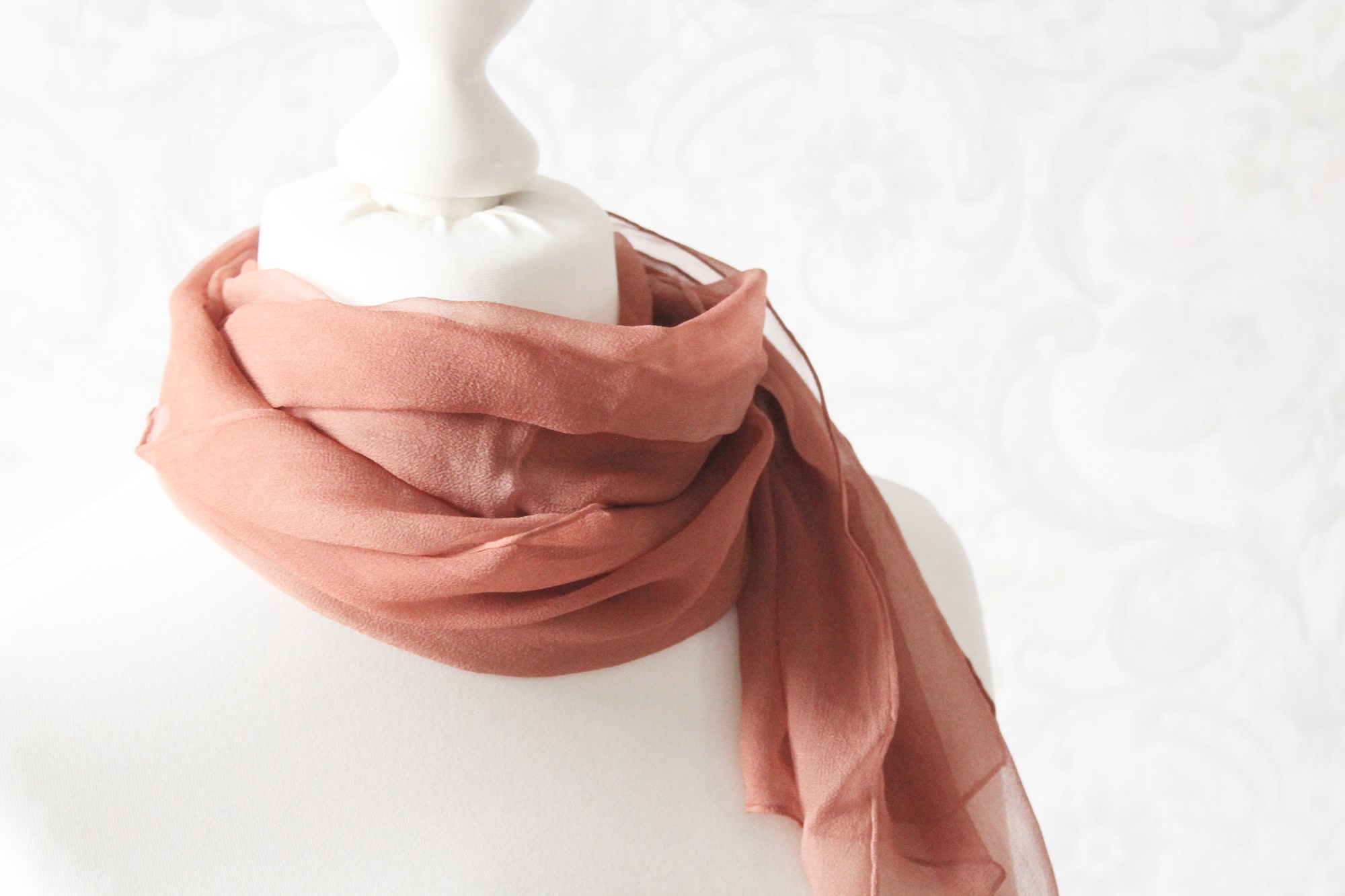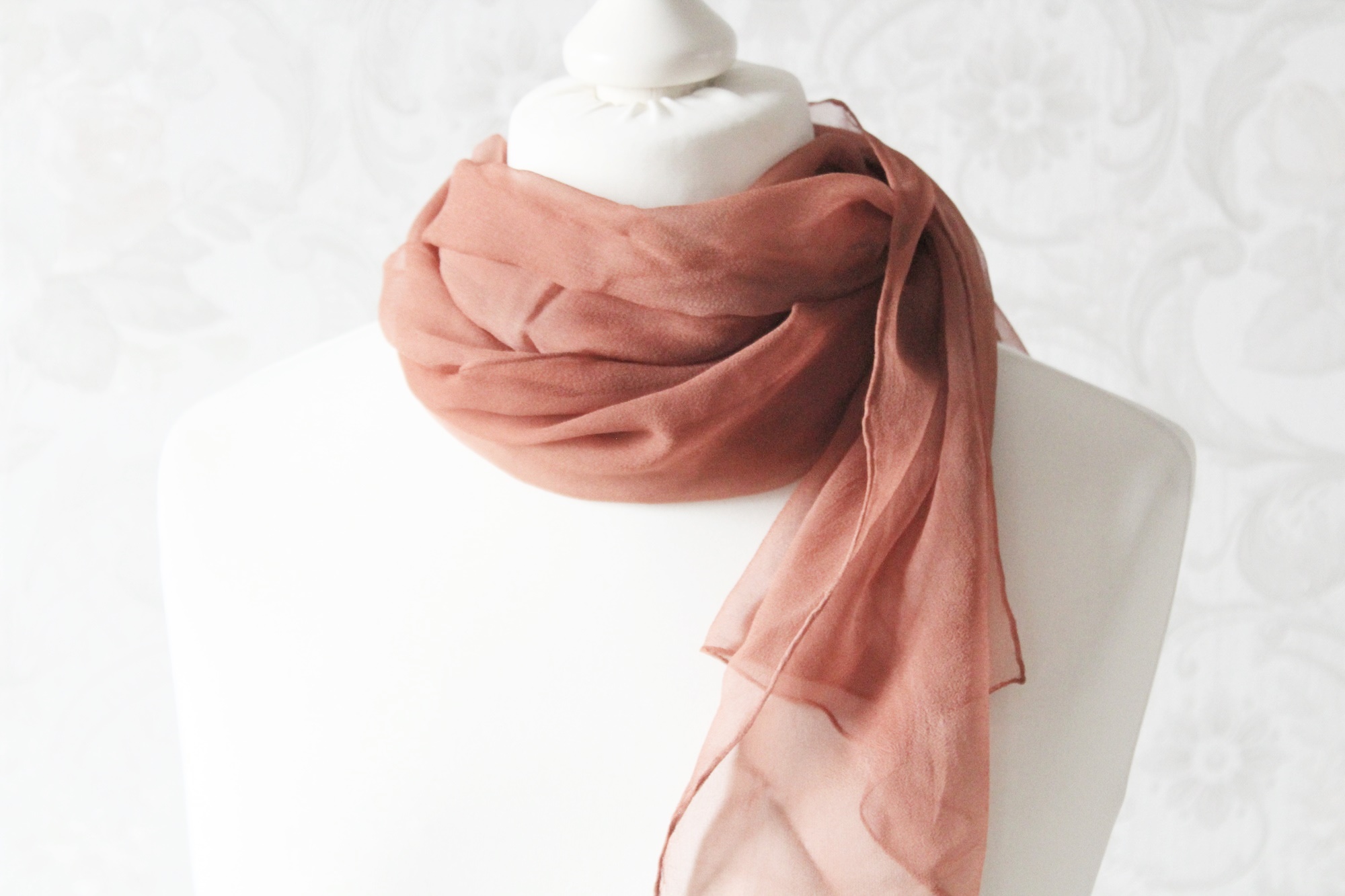 Dieser Schal ist aus Seidenchiffon und ca. 160 x 40 cm groß. Die Farbe ist ein helles Braun, welches schon etwas in Altrosa übergeht. Der Schal ist zart und luftig, ein Tuch welches gut im Sommer getragen werden kann. Aufgrund der Größe kann es ganz verschieden gebunden werden.