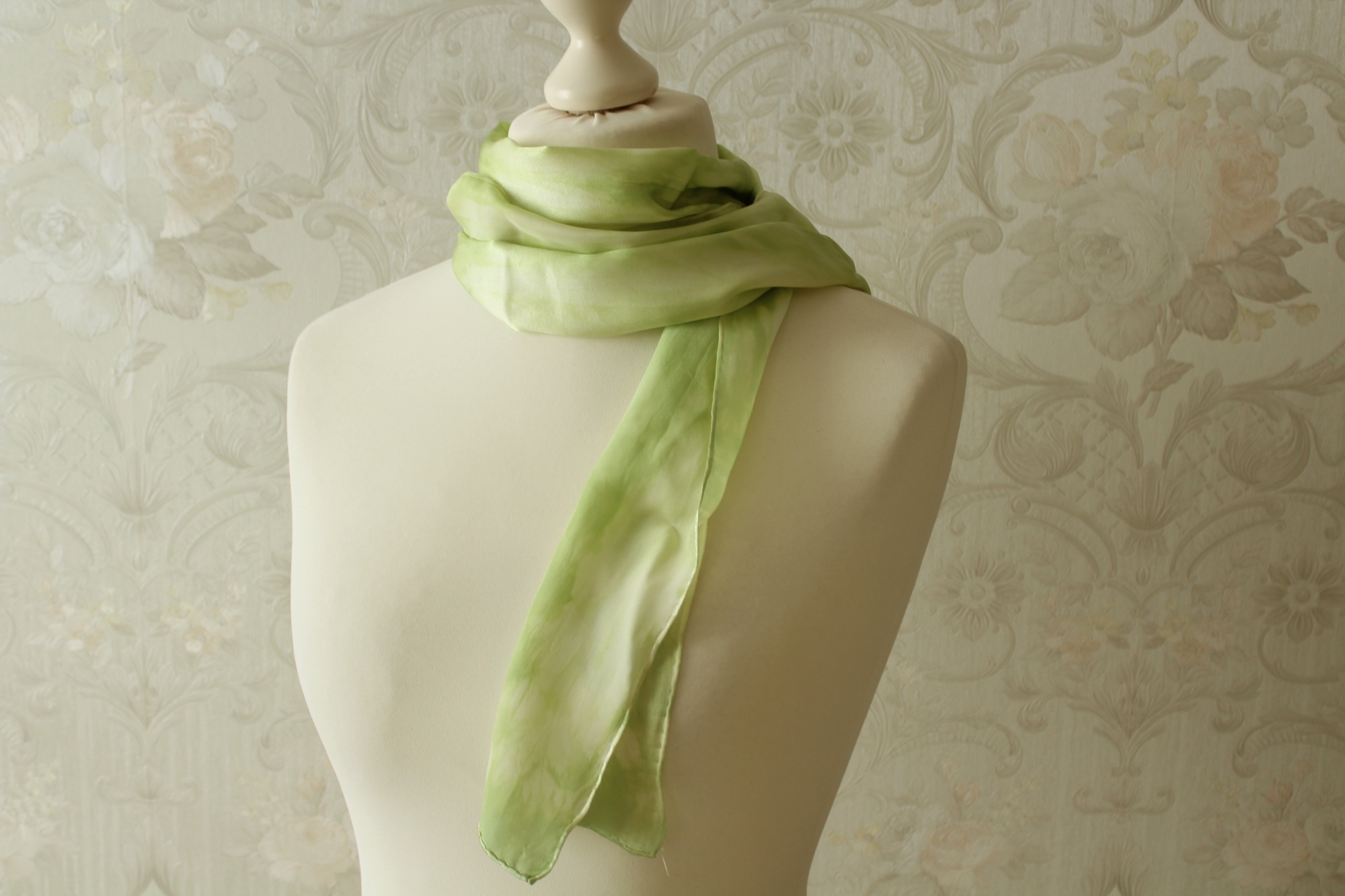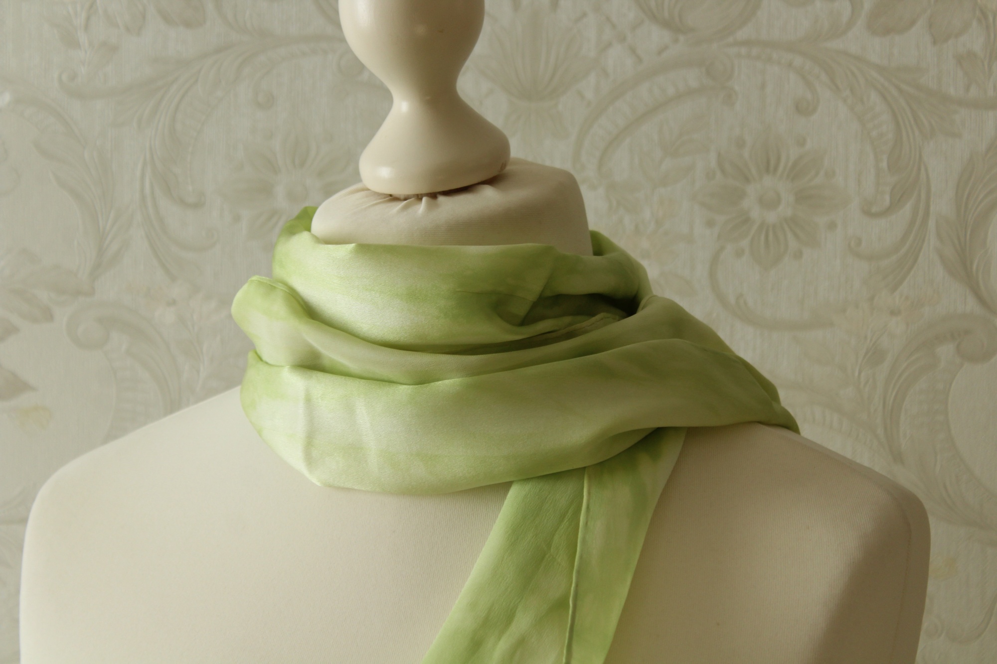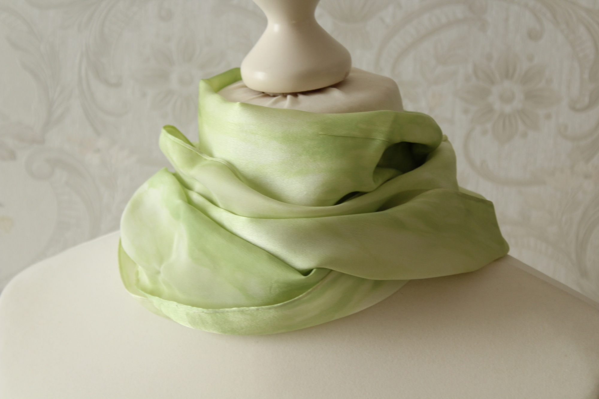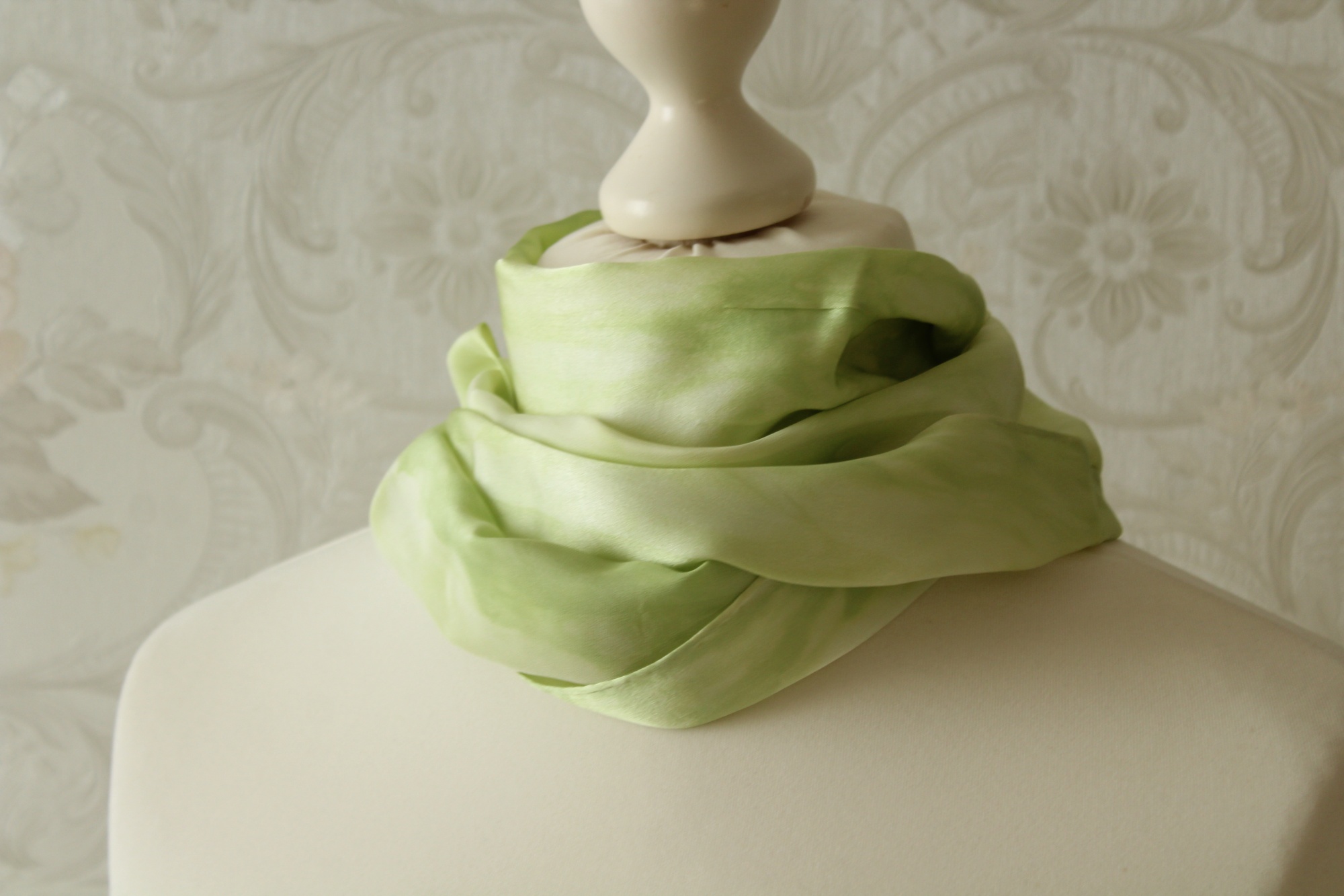 Bei diesem Schal (155 x 15 cm) flüstern also helle, frühlingsgrüne Töne miteinander. Durch die drei Arbeitsschritte Bemalen der Seide, Abbinden und Färben entstehen diese Muster eher zufällig. Somit gibt es diesen Schal genauso nicht noch einmal, jeder ist ein Einzelstück.