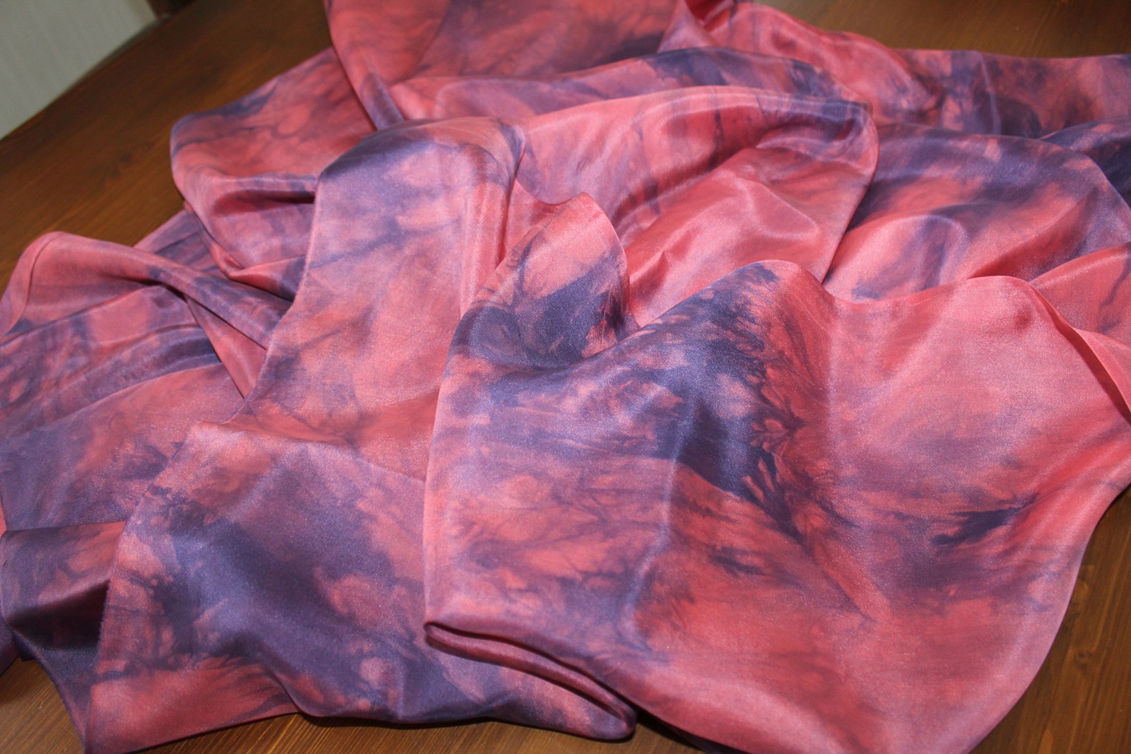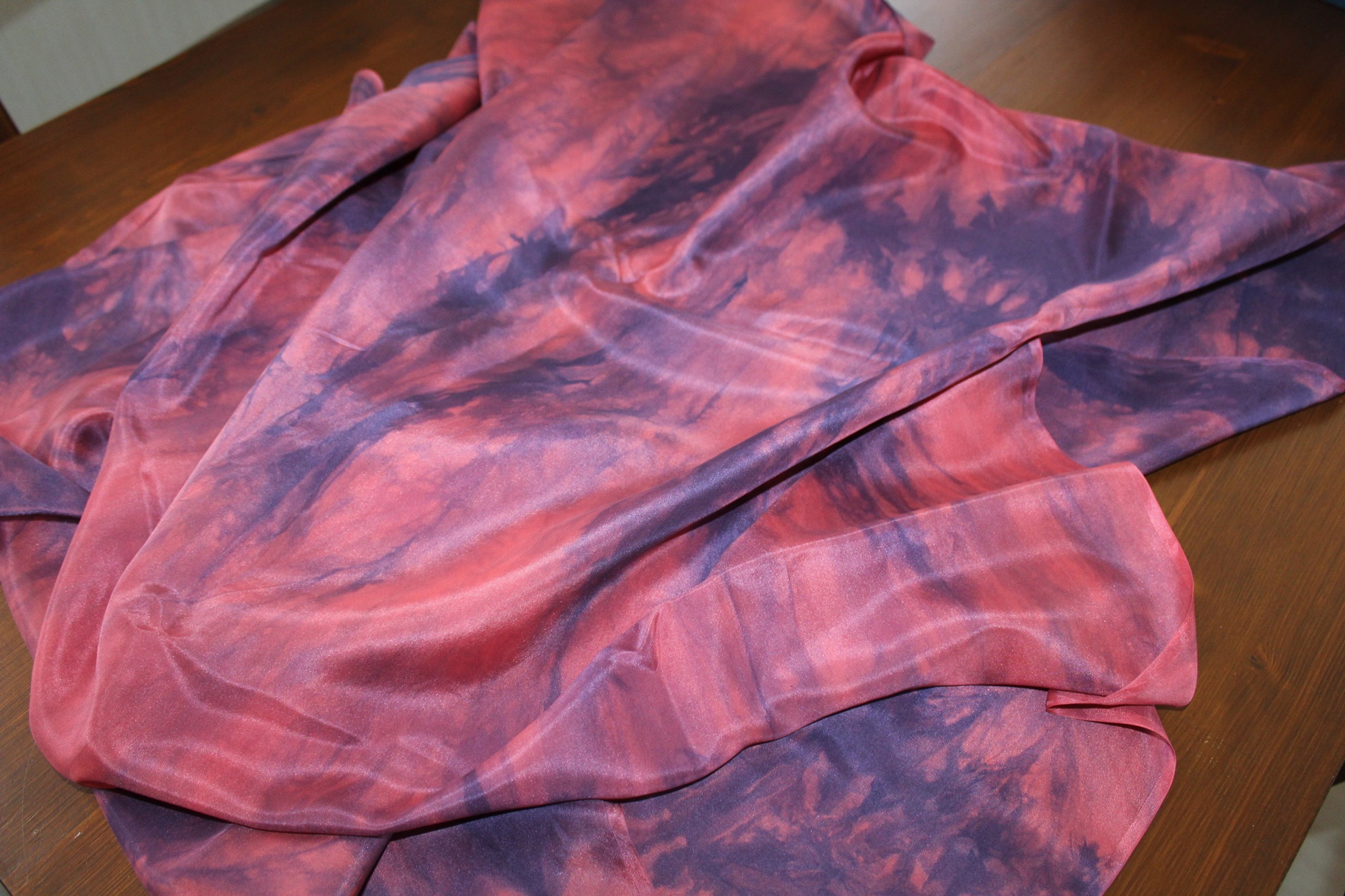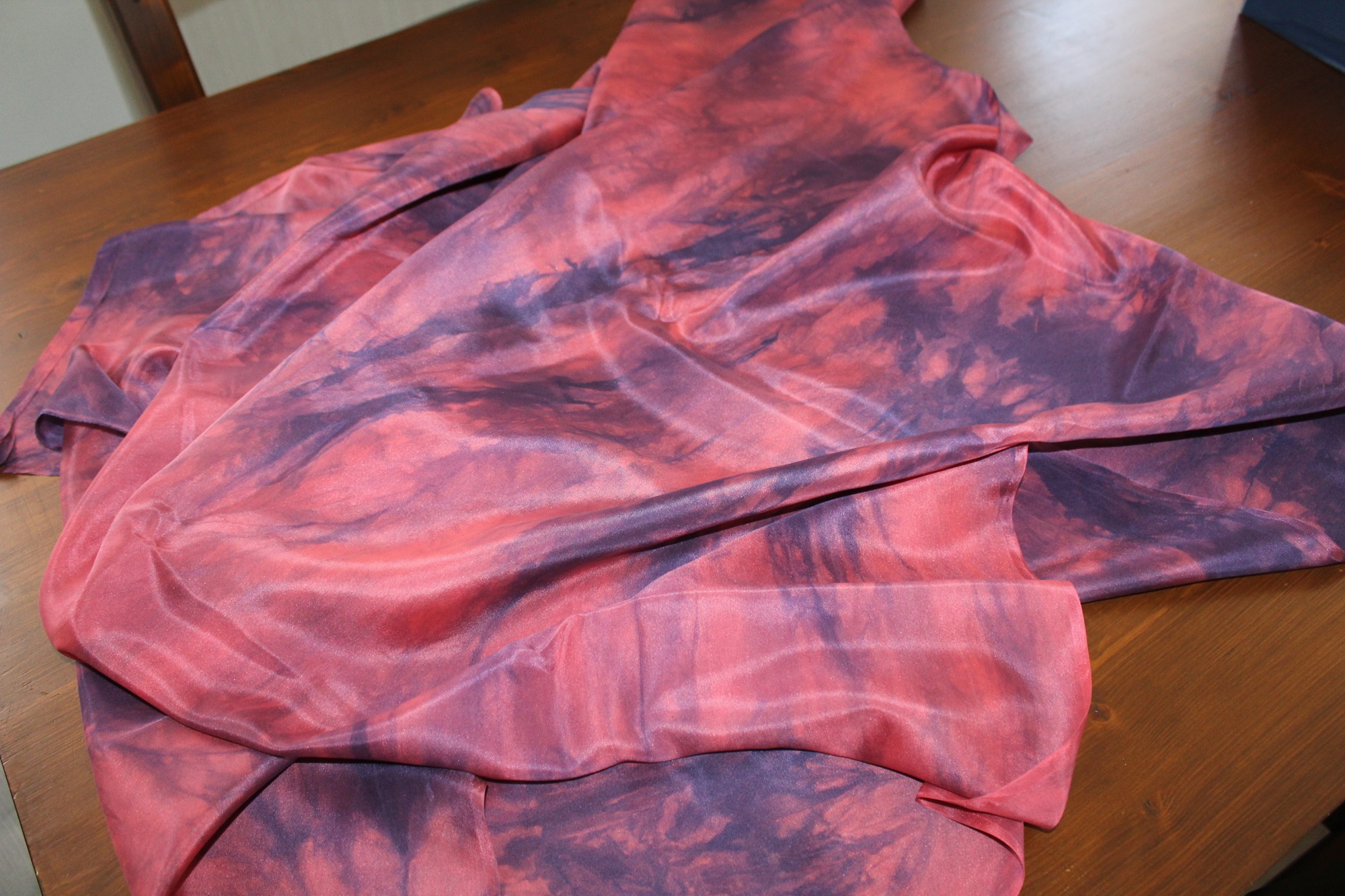 Stoff, handcolorierte Seide, ein besonderer Stoff zur kreativen Weiterverarbeitung. Die Farben hier sind ein helles Rot kombiniert mit einem blau lila Ton. Die Muster sind Farbverläufe. Diese entstehen beim Malen eher zufällig. Somit ist jedes Stück Stoff ein Unikat. Die Seidenart ist eine glatte Ponge Seide.