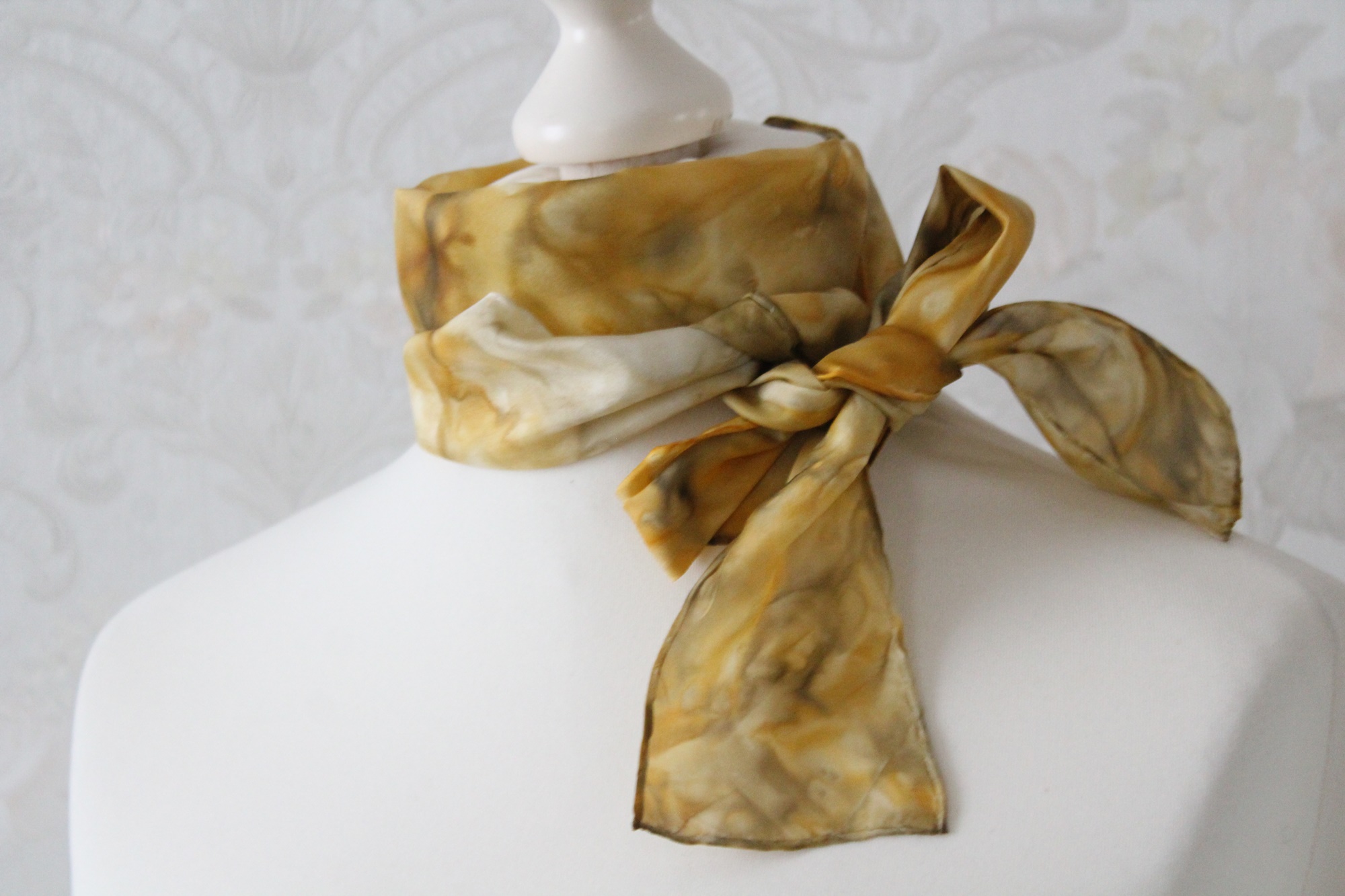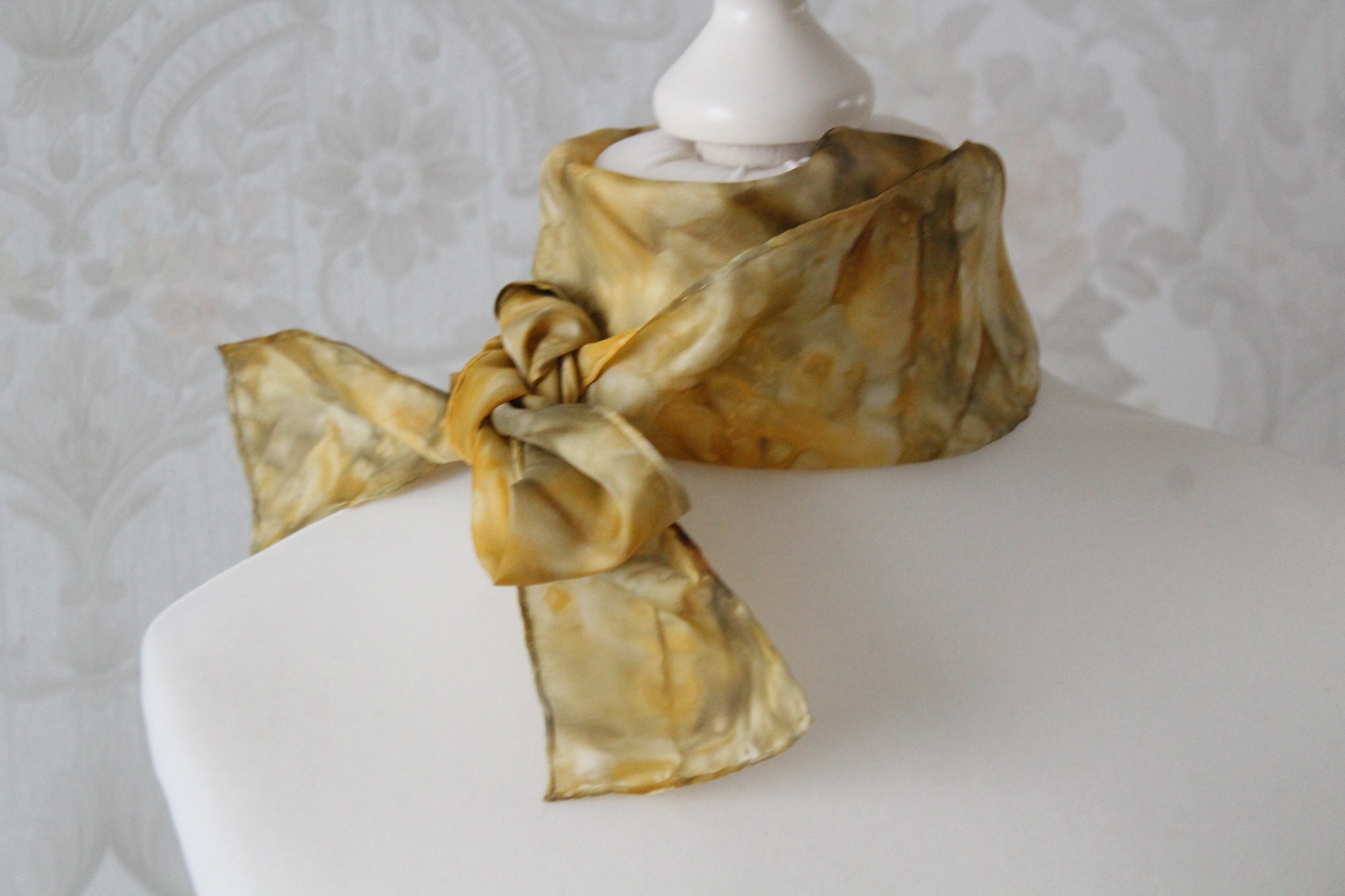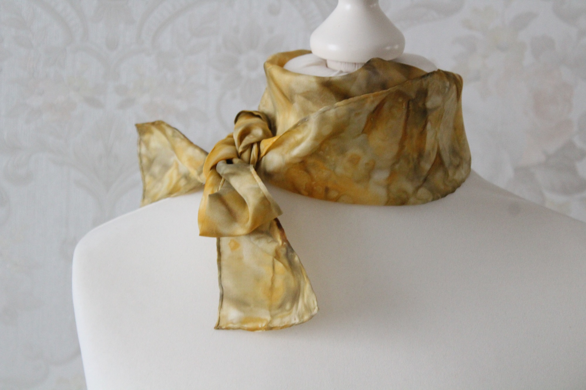 In verschiedenen beigen, braunen bis olivegrünen Farbtönen ist dieser sehr schmale Seidenschal gearbeitet. Das Besondere an diesem Schal ist, dass er nur 8 cm breit ist. Die Länge ist ca. 1,60 m. Der schmale Schal kann ganz verschieden getragen werden, an den Enden zusammengeknotet als Loop, lang herabhängend oder gebunden als Schleife. In das Haar gebunden peppt er jede Frisur auf. Er ist in Handarbeit gefertigt in einem hübschen Batik Muster, ein Einzelstück.