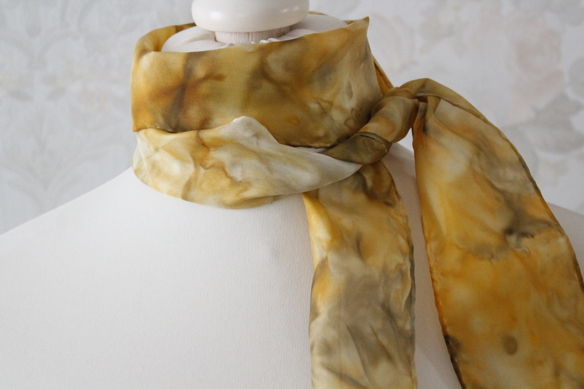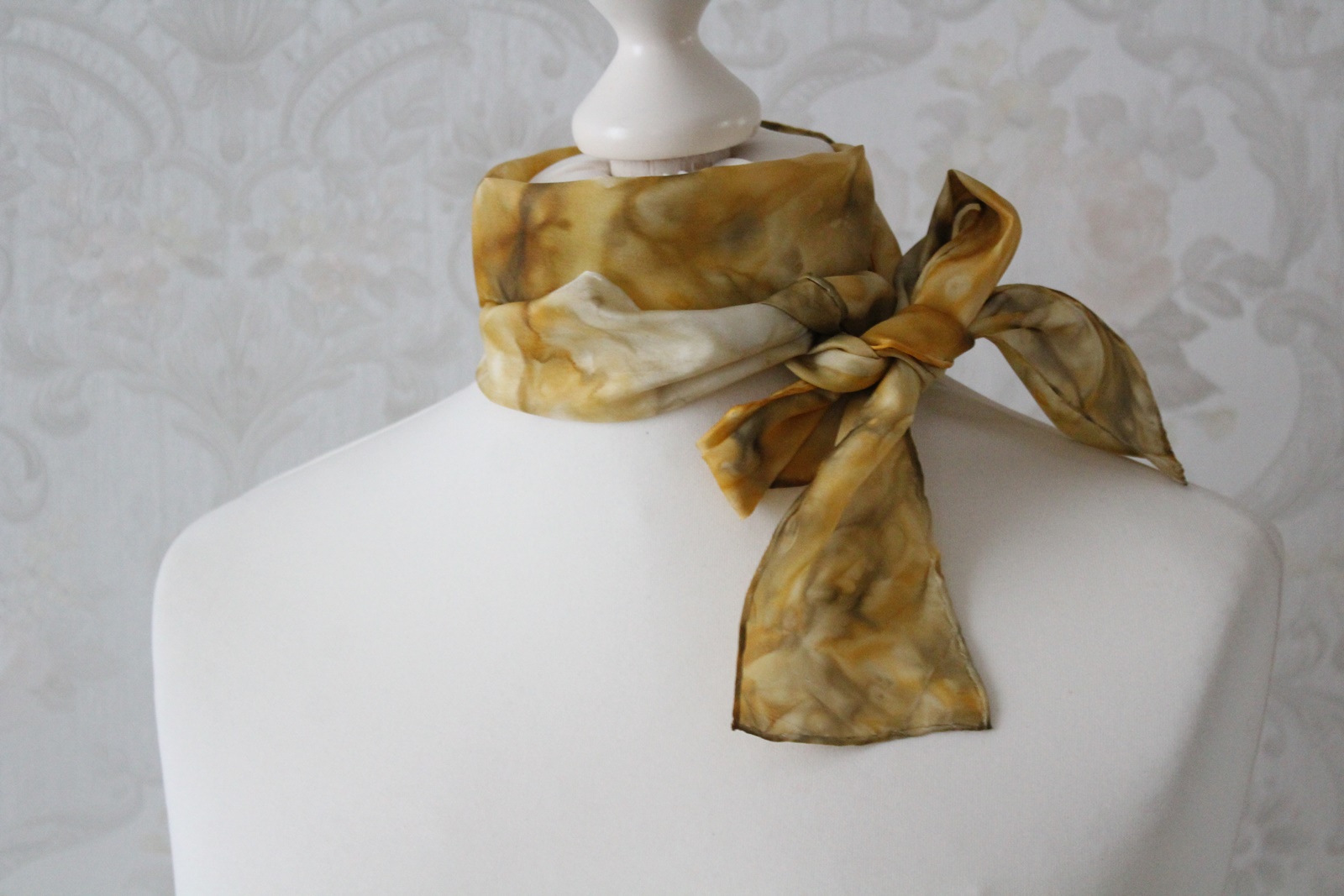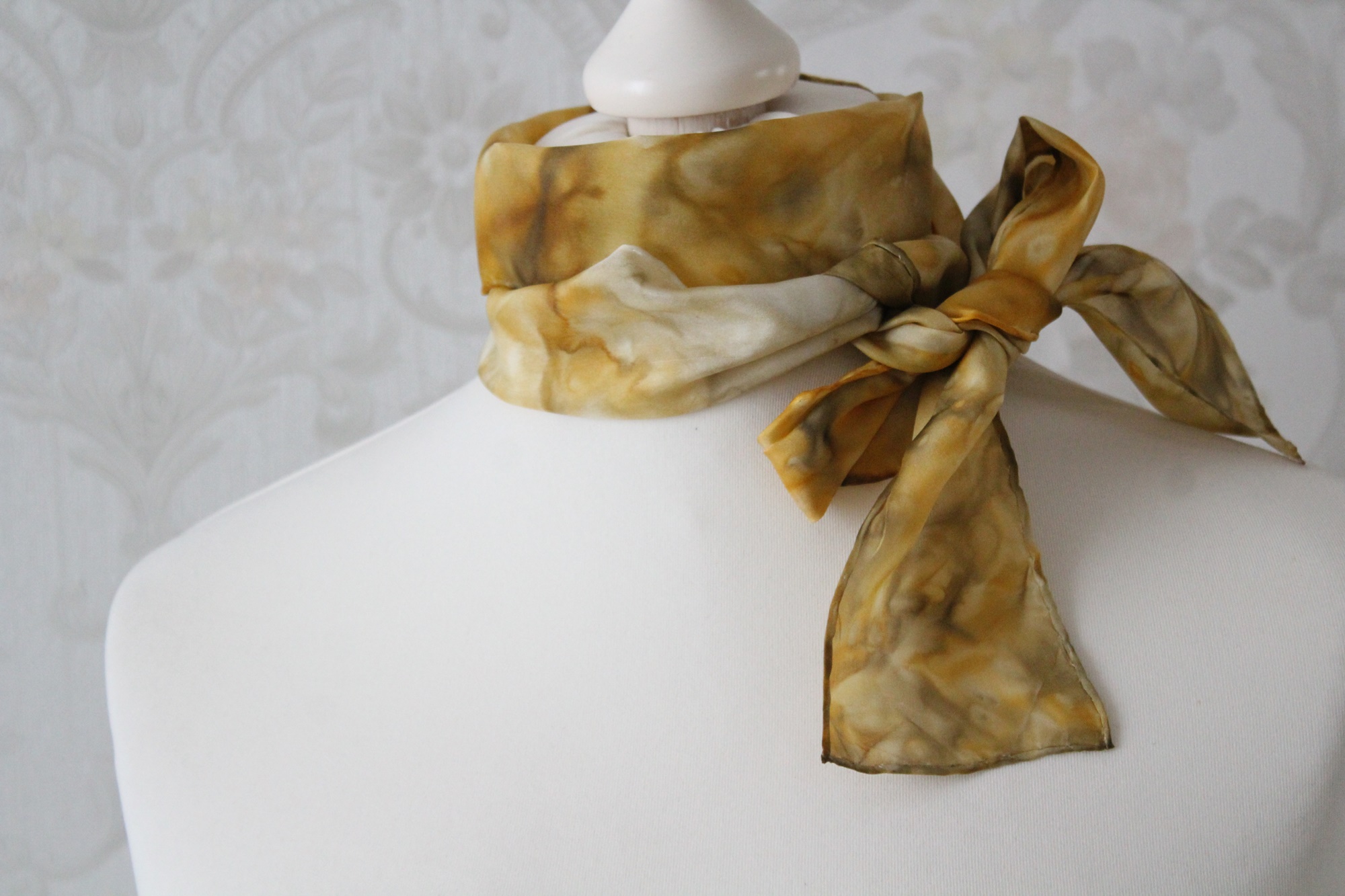 In verschiedenen beigen, braunen bis olivegrünen Farbtönen ist dieser sehr schmale Seidenschal gearbeitet. Das Besondere an diesem Schal ist, dass er nur 8 cm breit ist. Die Länge ist ca. 1,60 m. Der schmale Schal kann ganz verschieden getragen werden, an den Enden zusammengeknotet als Loop, lang herabhängend oder gebunden als Schleife. In das Haar gebunden peppt er jede Frisur auf. Er ist in Handarbeit gefertigt in einem hübschen Batik Muster, ein Einzelstück.