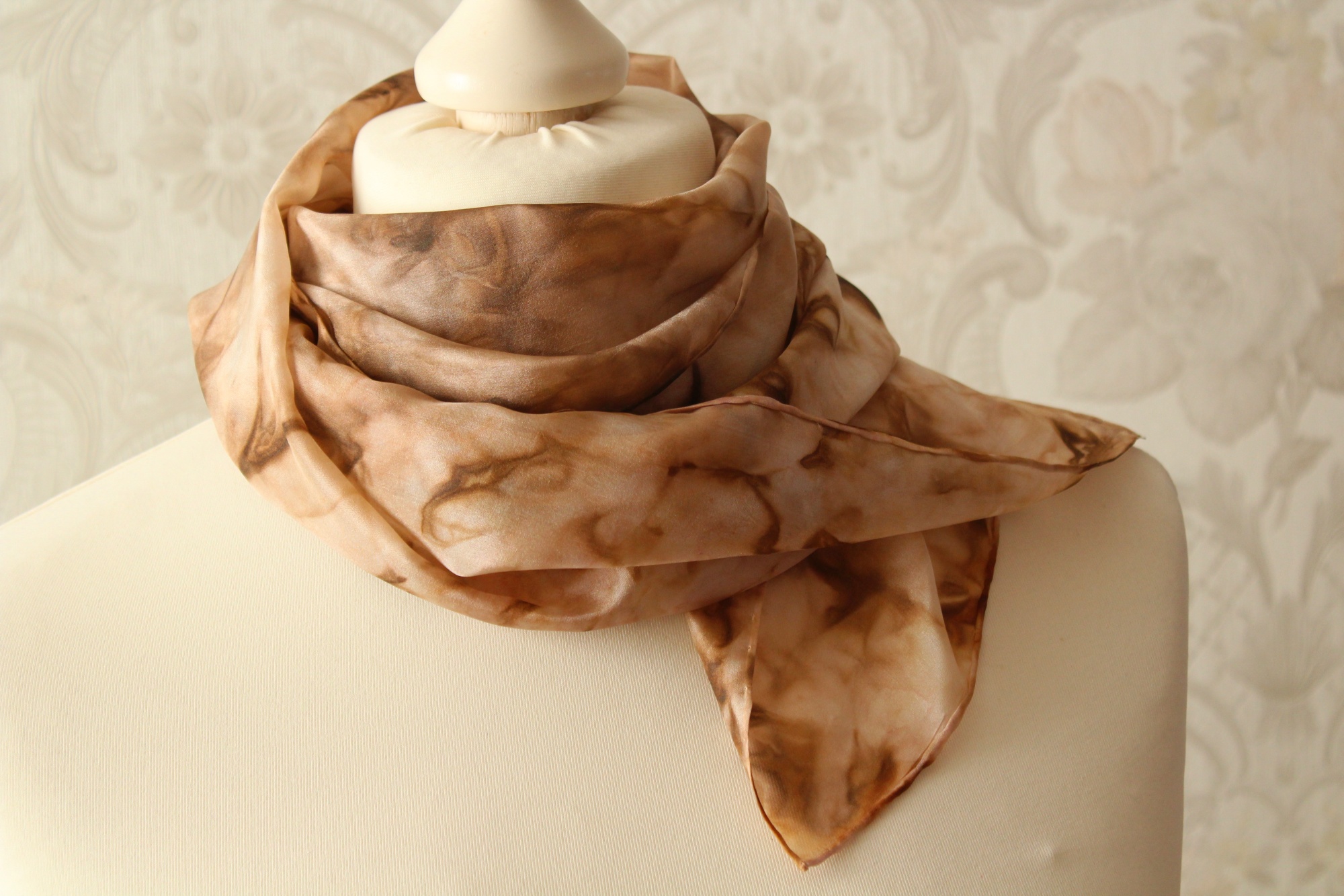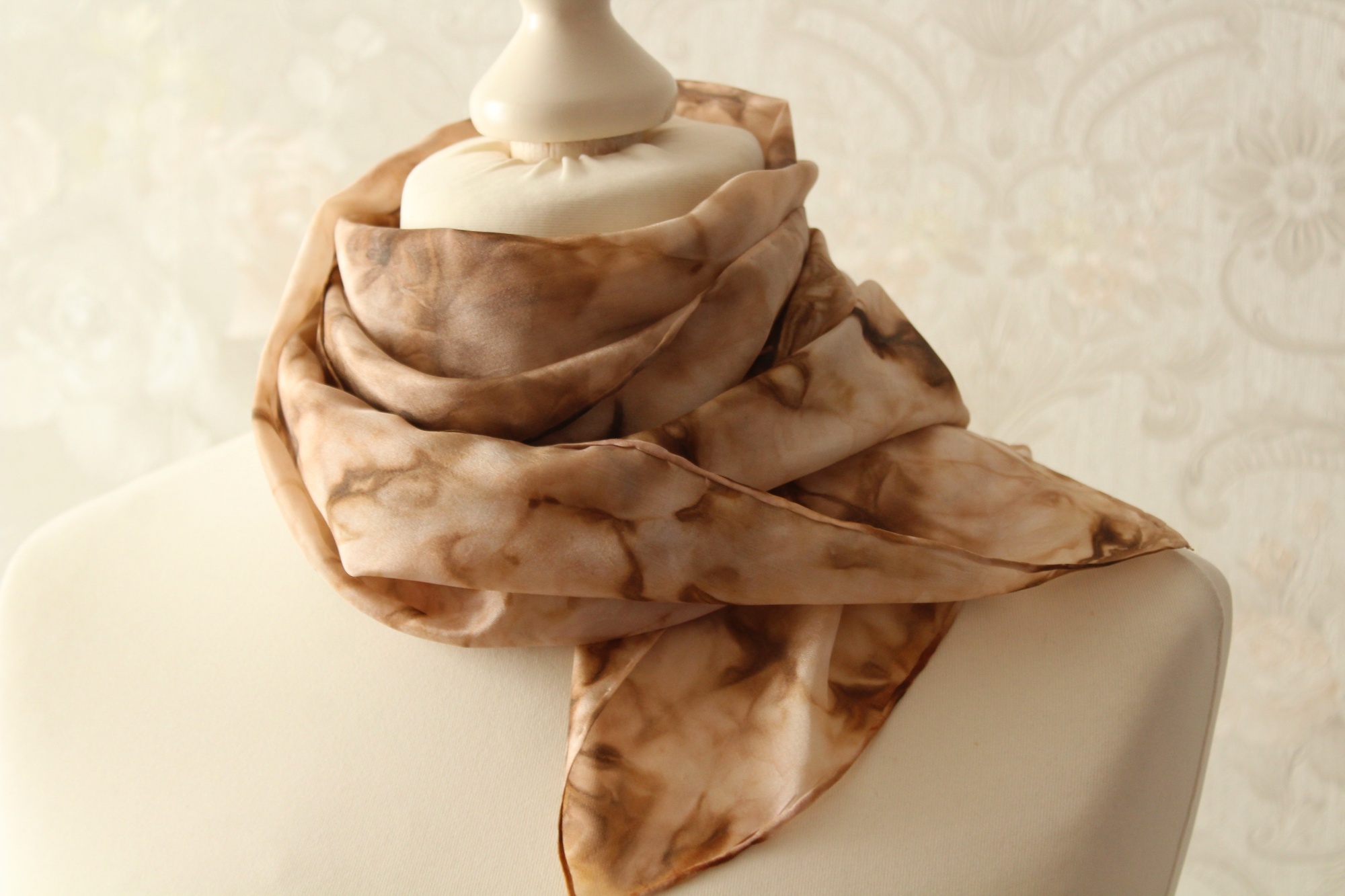 Brauner Schal aus Seide, ein Seidenschal in Handarbeit gefertigt, ein Stück aus der Farbgeflüster Reihe. Das Muster als Farbverläufe in verschiedenen Brauntönen ist selbst entworfen bzw. entsteht beim Malen eher zufällig. Somit gibt es diesen Schal genau so nicht noch einmal. Jeder für sich ist ein Einzelstück. Er ist ca. 150 x 45 cm groß.