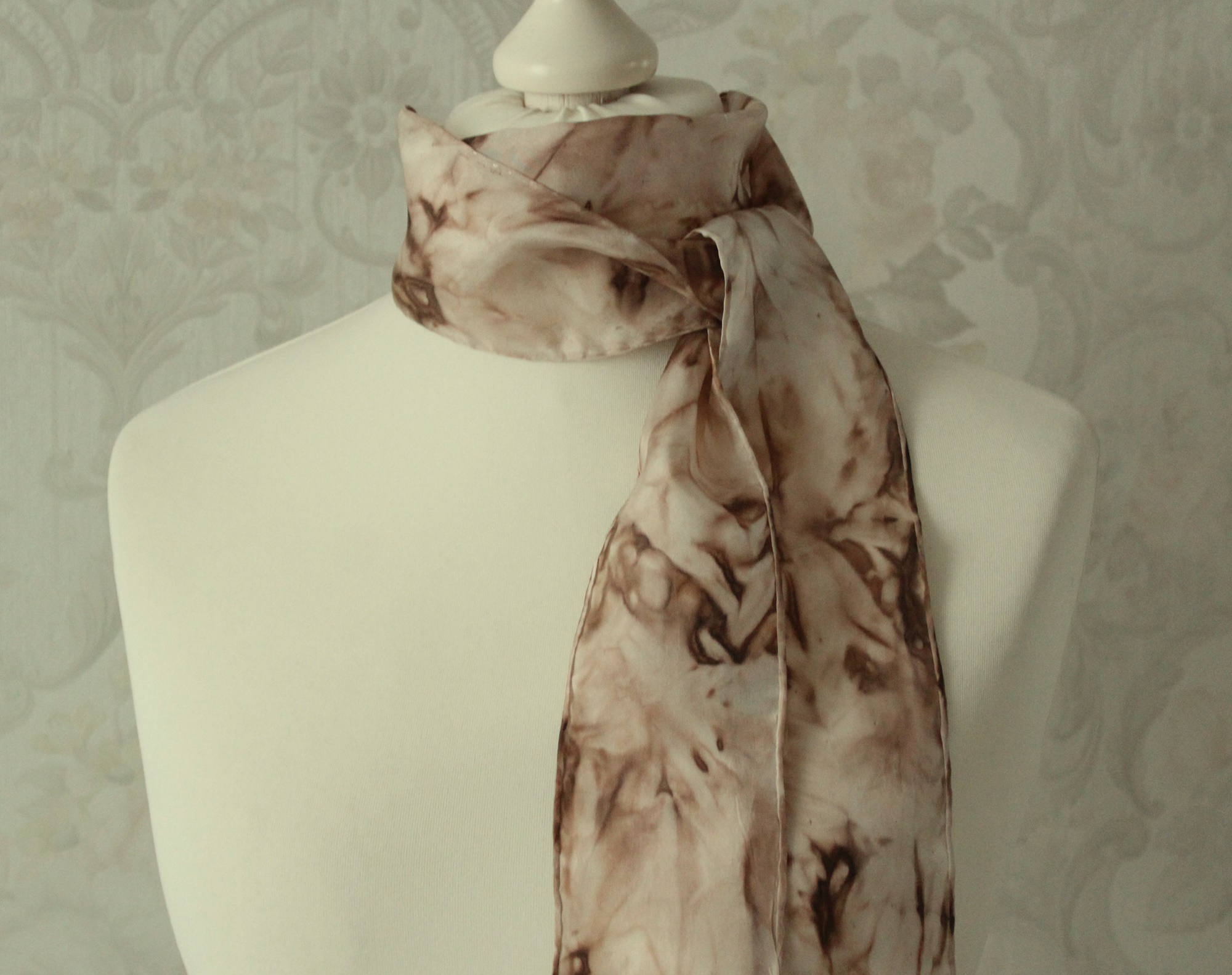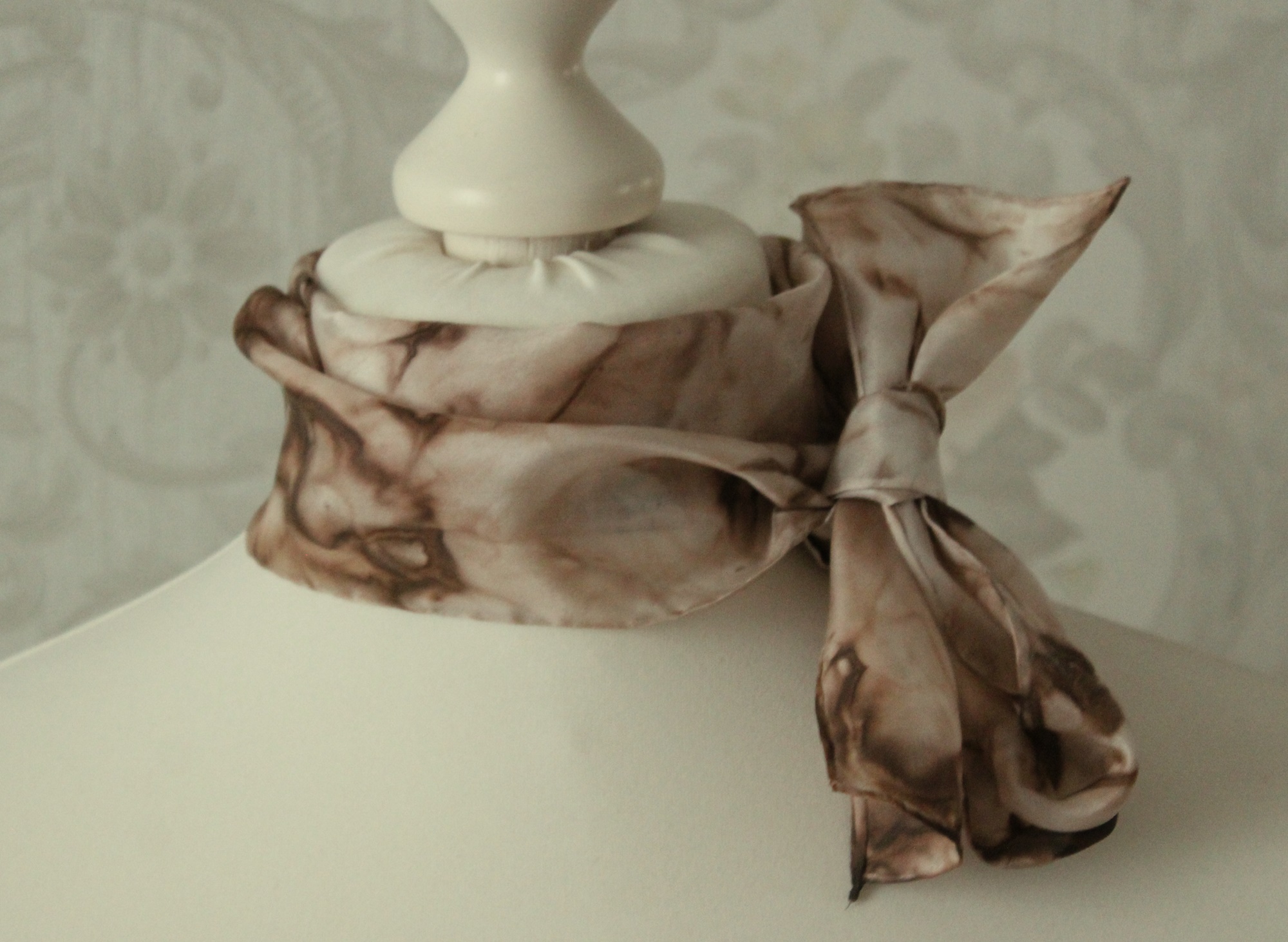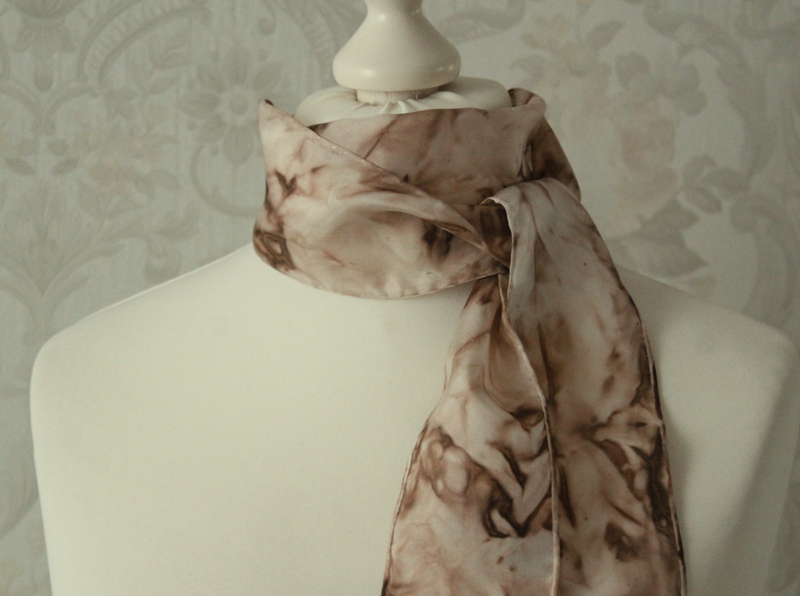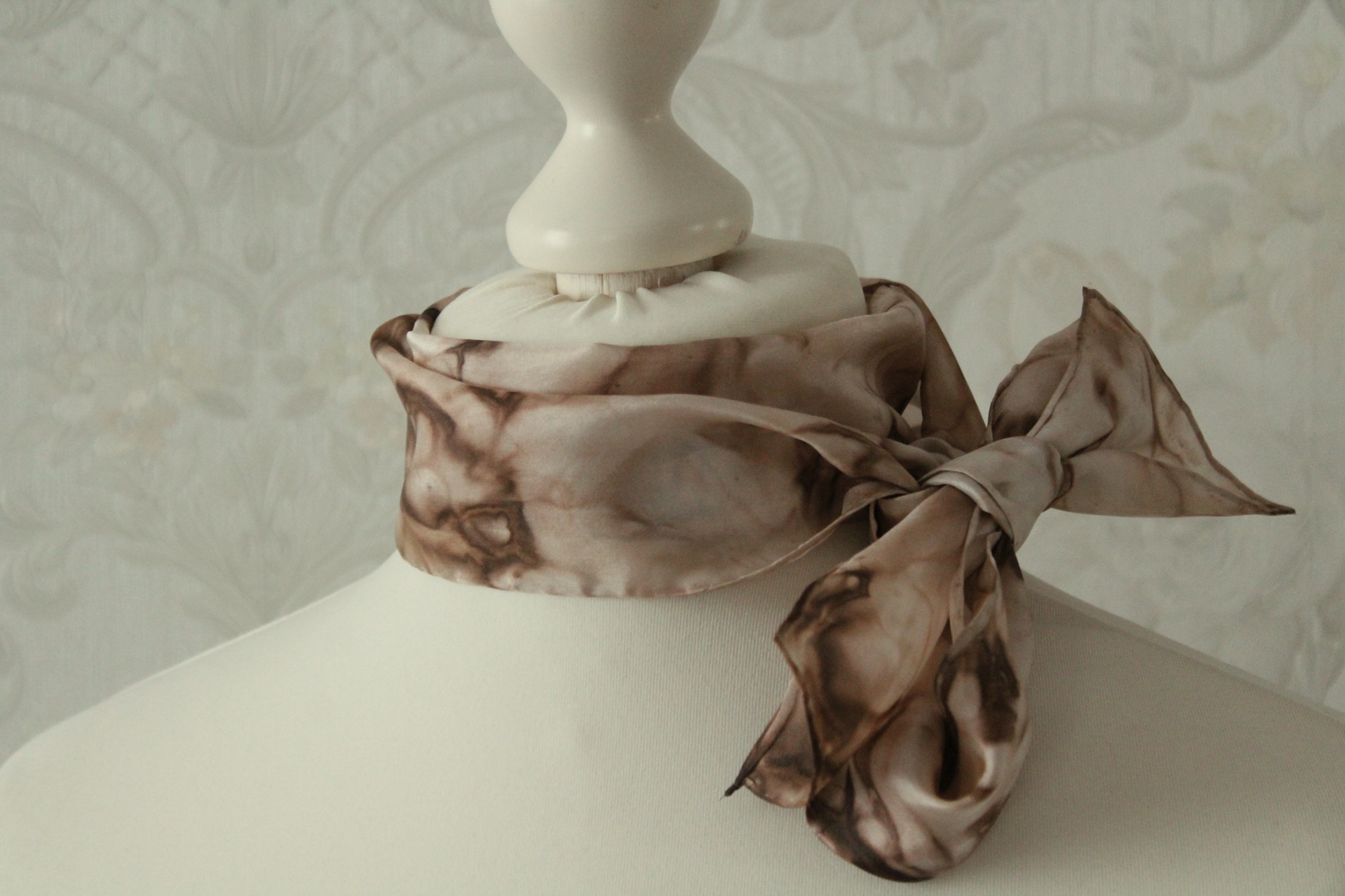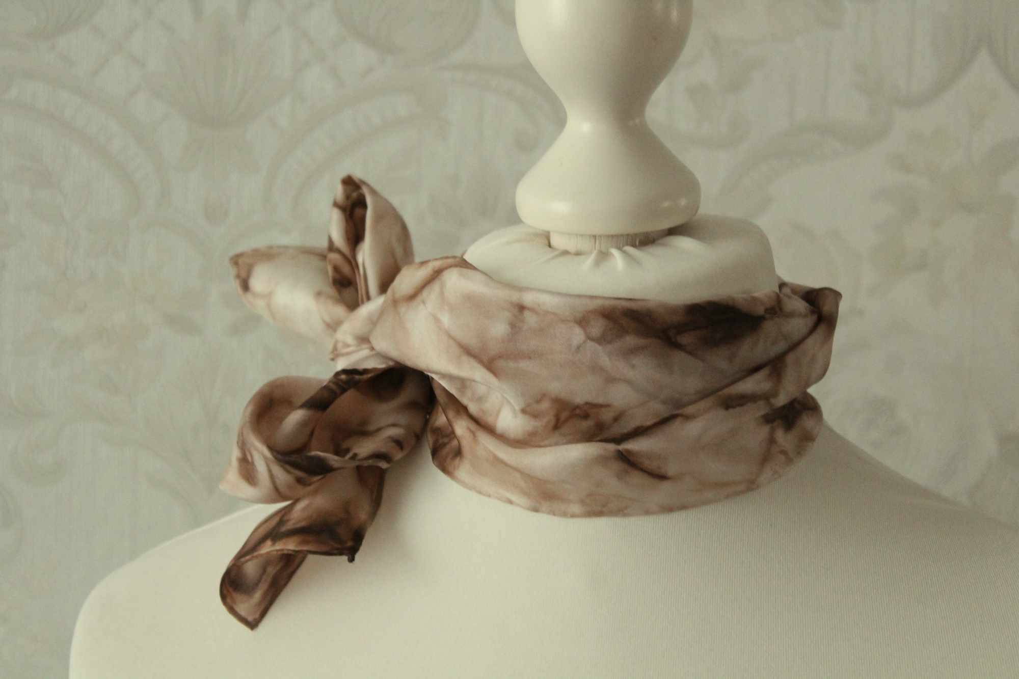 In verschiedenen braunen Farbtönen ist dieser sehr schmale Seidenschal gearbeitet. Das Besondere an diesem Schal ist, dass er nur 8 cm breit ist. Die Länge ist ca. 1,60 m. Der schmale Schal kann ganz verschieden getragen werden, an den Enden zusammengeknotet als Loop, lang herabhängend oder gebunden als Schleife. In das Haar gebunden peppt er jede Frisur auf. Er ist in Handarbeit gefertigt in einem hübschen Batik Muster.