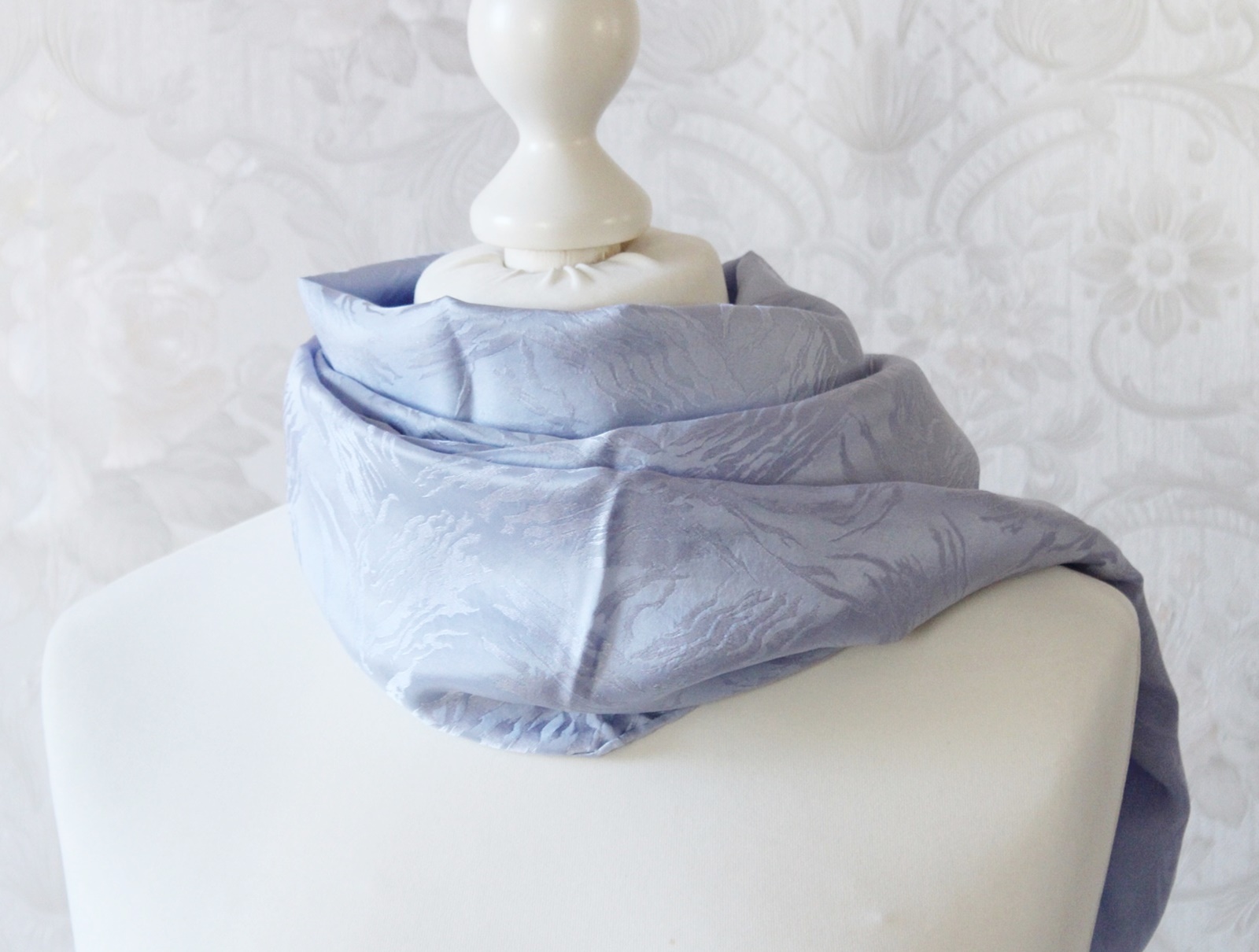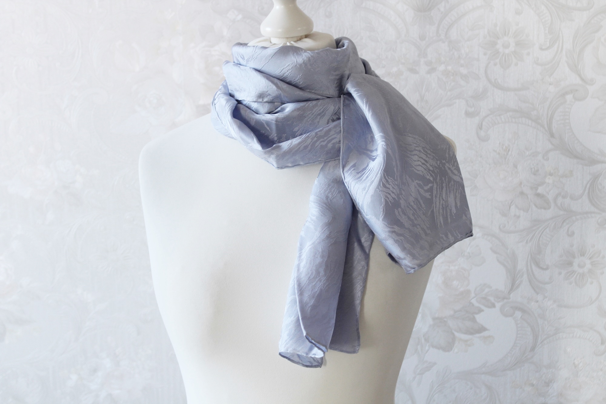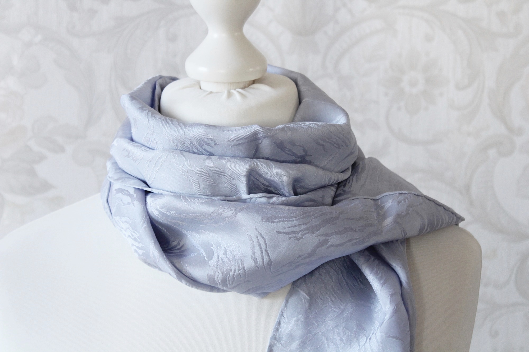 Der hellblaue Schal ist ein von Hand coloriertes Seidentuch. Die Seide ist leicht und doch stabil und hat zudem ein Jaquard Muster. D.h. in der Seide sind kleine Muster eingewebt. Die Farbe ist neutral und passt zu vielen Outfits. Je nach Lichteinfall schimmert der Schal mal etwas blauer und dann wieder silbrig. Der Seidenschal ist ansonsten ohne Muster, er ist ein Einzelstück. Somit ist er auch ein ganz besonderes Geschenk für Frauen. Egal ob zum Geburtstag, Muttertag, Ostern oder Weihnachten, oder einfach mal um Danke zu sagen.