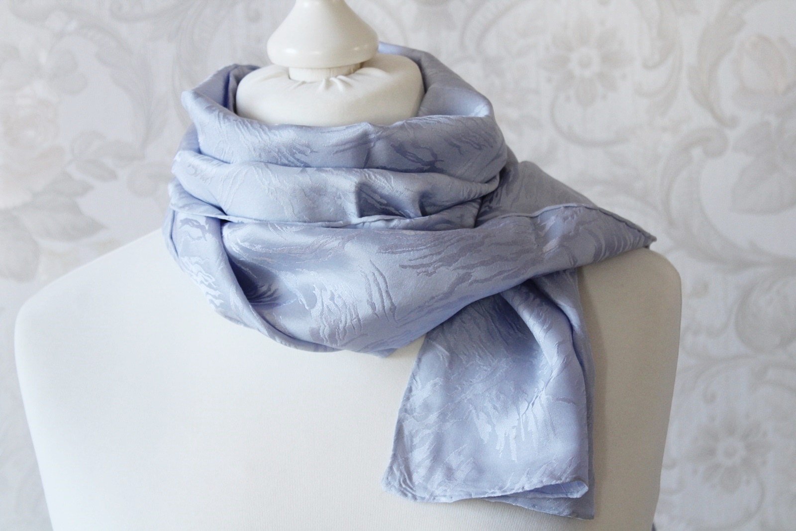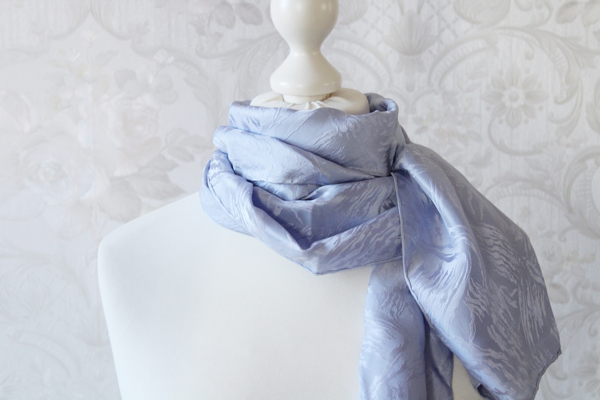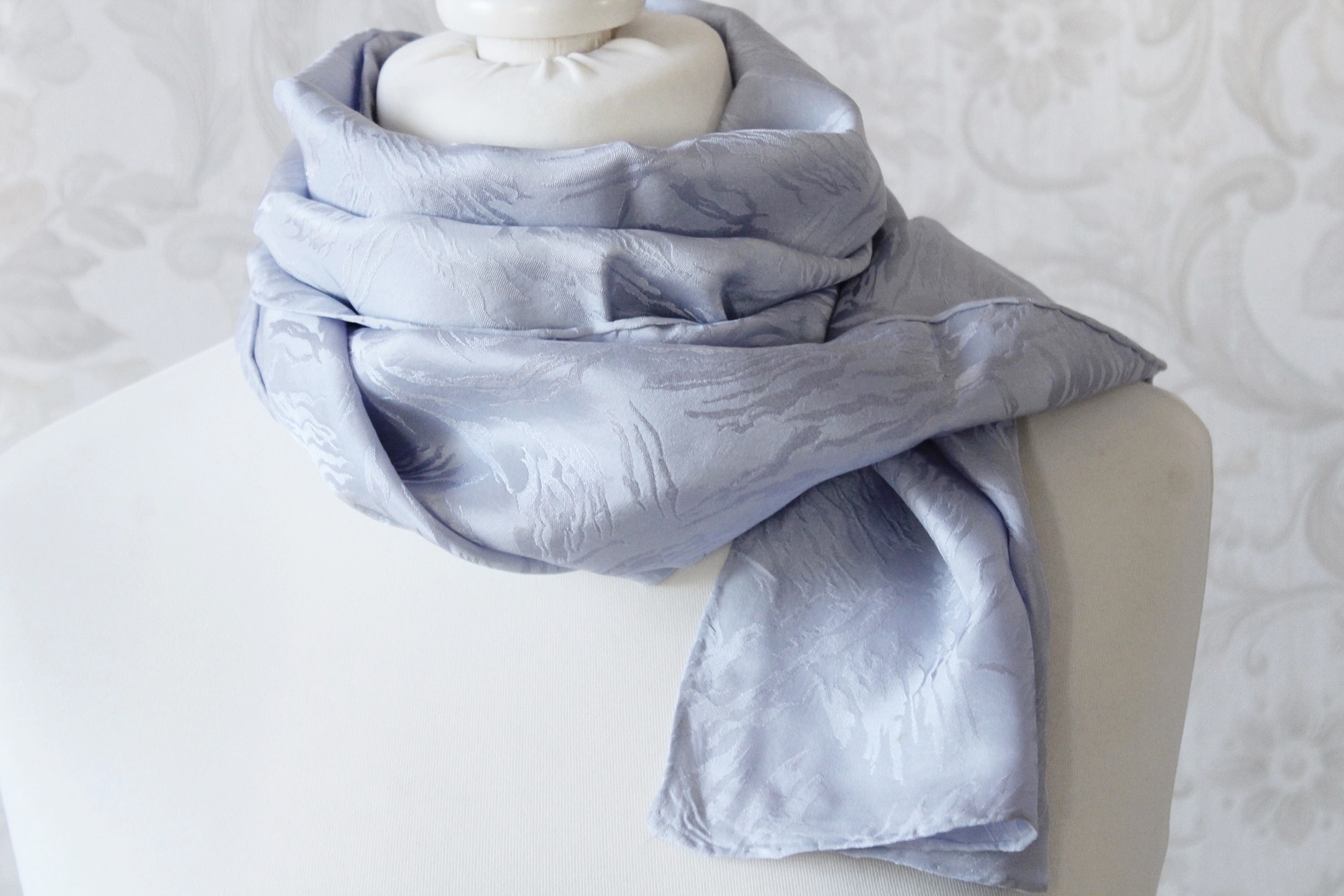 Der hellblaue Schal ist ein von Hand coloriertes Seidentuch. Die Seide ist leicht und doch stabil und hat zudem ein Jaquard Muster. D.h. in der Seide sind kleine Muster eingewebt. Die Farbe ist neutral und passt zu vielen Outfits. Je nach Lichteinfall schimmert der Schal mal etwas blauer und dann wieder silbrig. Der Seidenschal ist ansonsten ohne Muster, er ist ein Einzelstück. Somit ist er auch ein ganz besonderes Geschenk für Frauen. Egal ob zum Geburtstag, Muttertag, Ostern oder Weihnachten, oder einfach mal um Danke zu sagen.