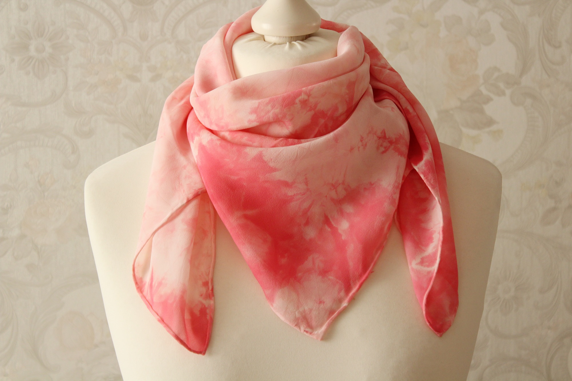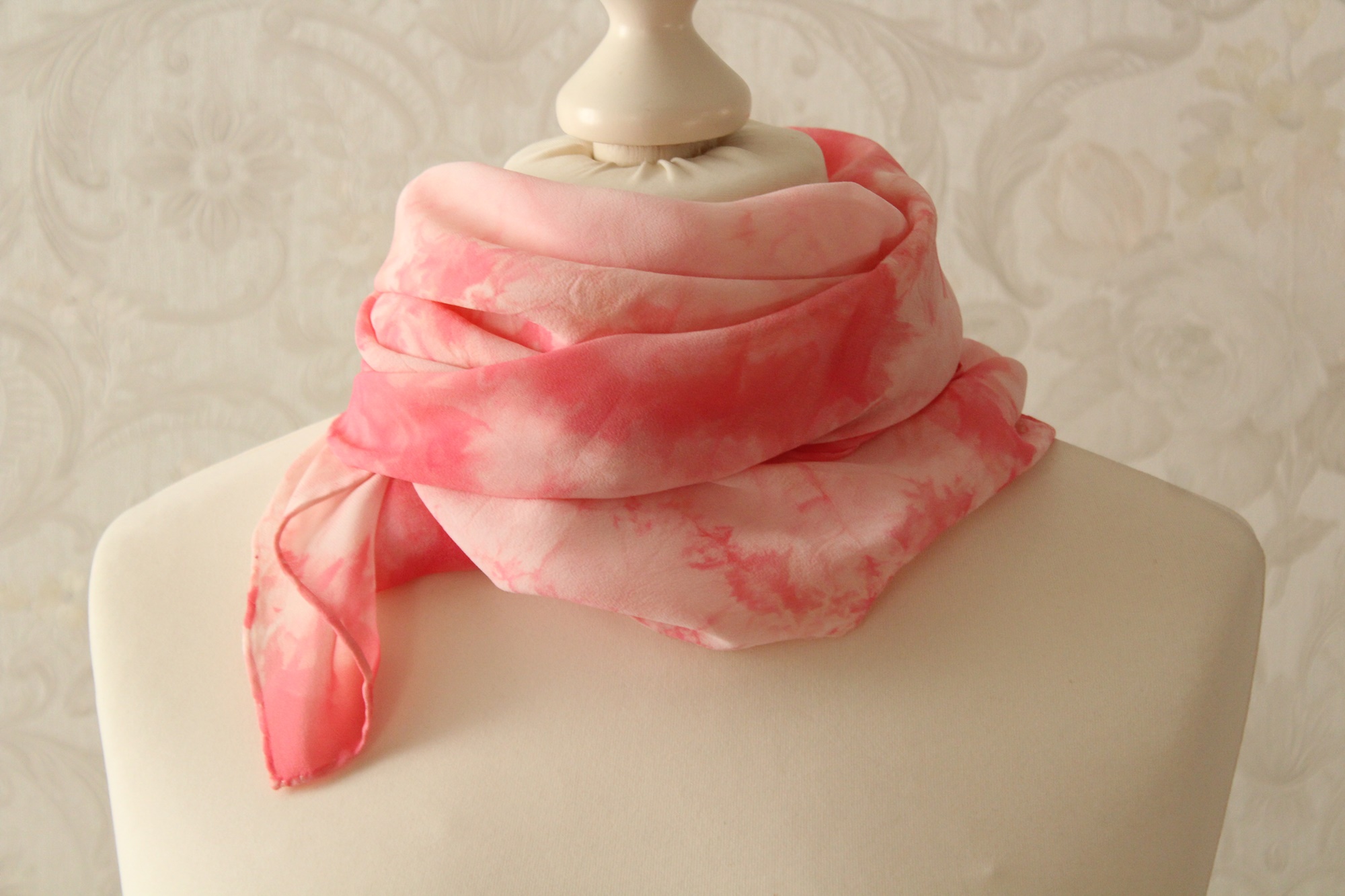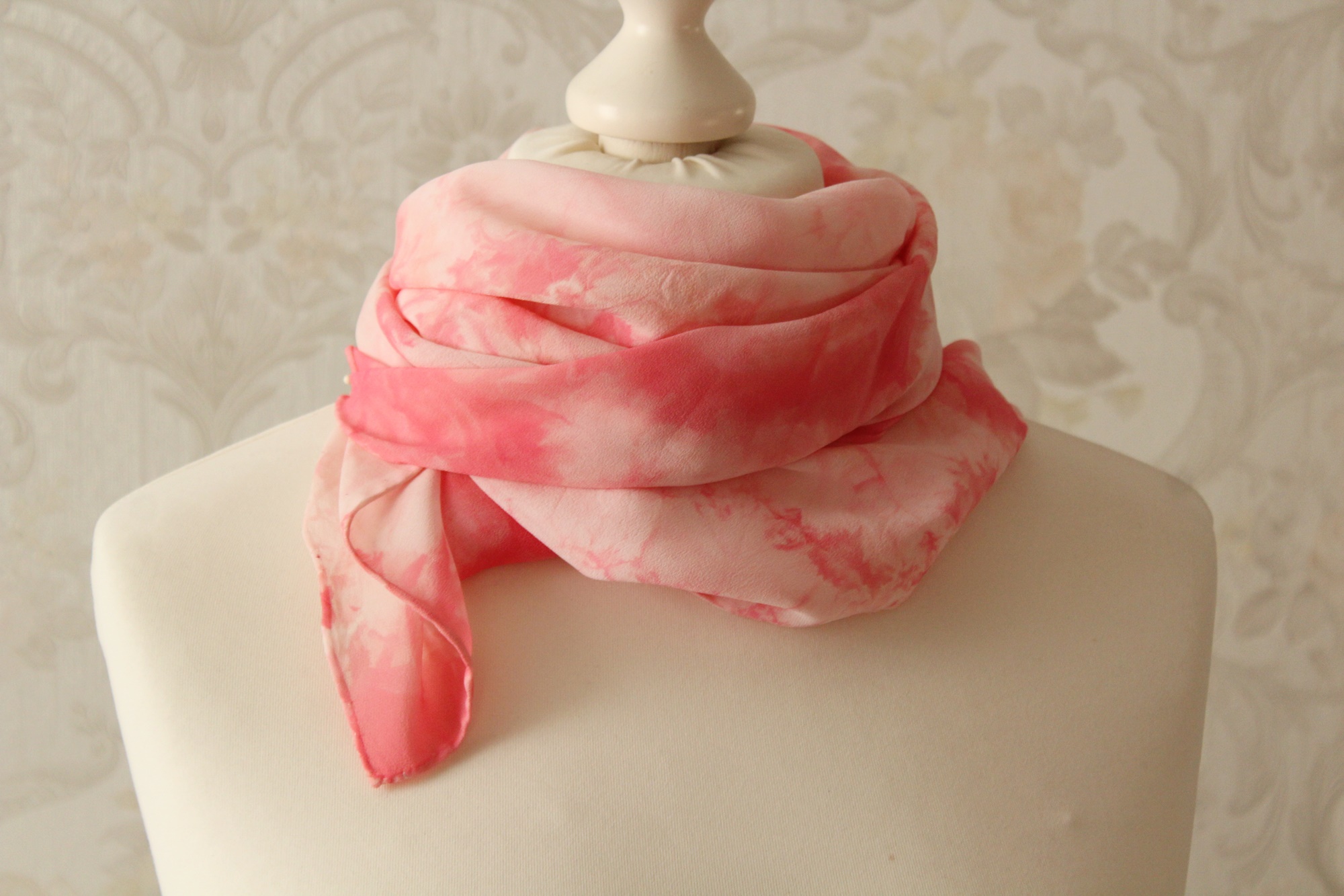 Chiffon Seidentuch in rosa weißem Farbton, Handarbeit aus Thüringen. Wie wenn sich bei einer Melodie laute und leise Töne abwechseln, sind es hier helle und dunklere Farben. Die Muster aus interessanten Farbverläufen entstehen durch verschiedenen Techniken der Seidenmalerei.