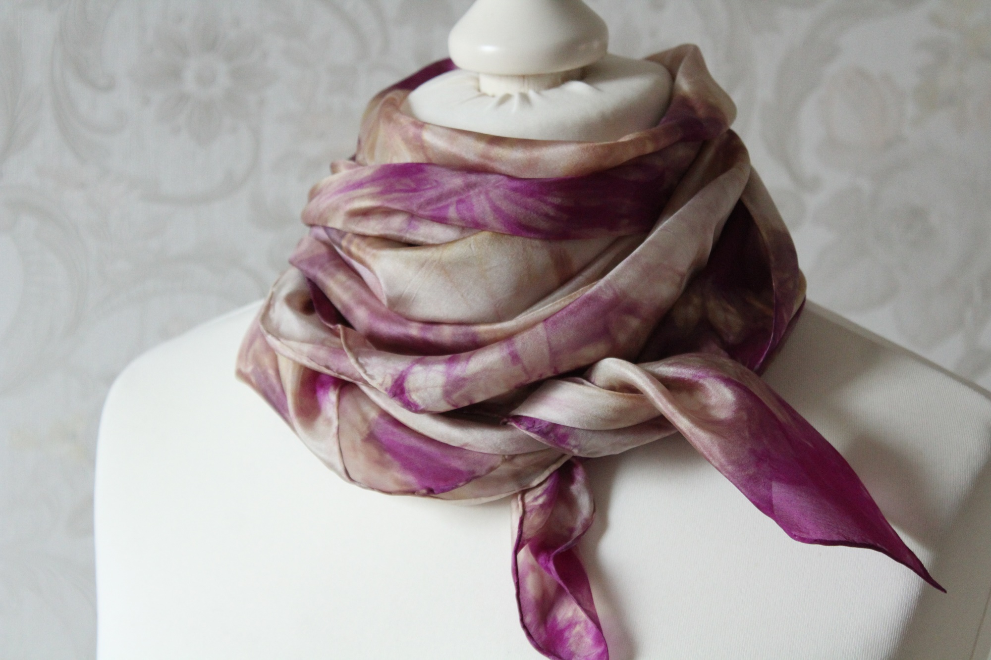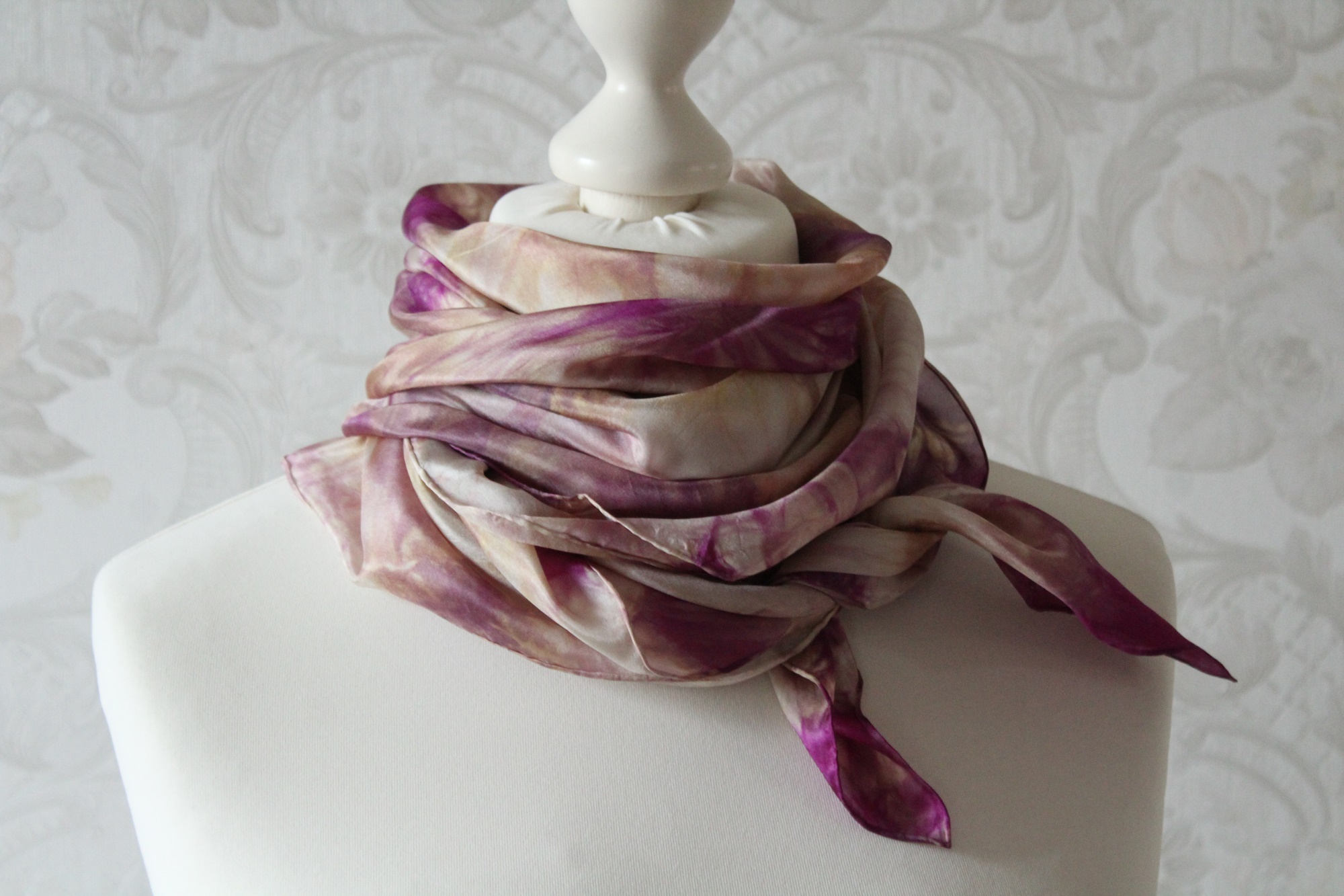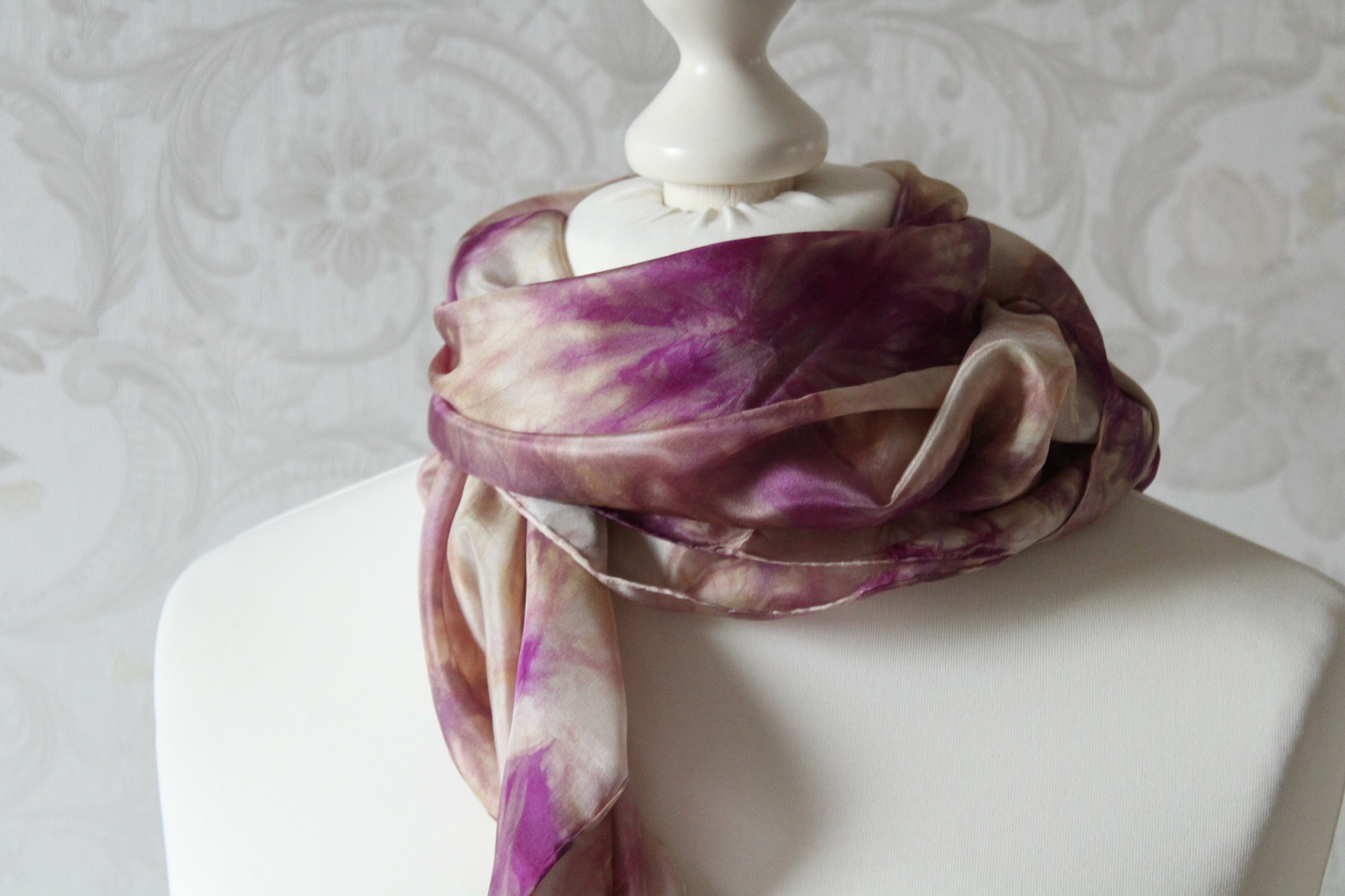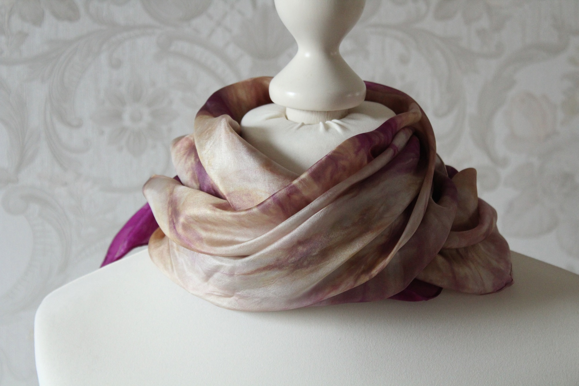 Das Seidentuch ist ein echter Hingucker und passt zu fast allen Outfits. Aufgrund seiner Größe läßt es sich auch ganz verschieden tragen. Ob gewickelt als Loop, als Halstuch die Enden etwas herabhängend oder im Sommer an kühleren Tagen über die Schulter gelegt wie eine Stola, das Tuch ist ein echter Allrounder. Je nachdem, wie Sie es drehen haben sie mal mehr, mal weniger Lila.