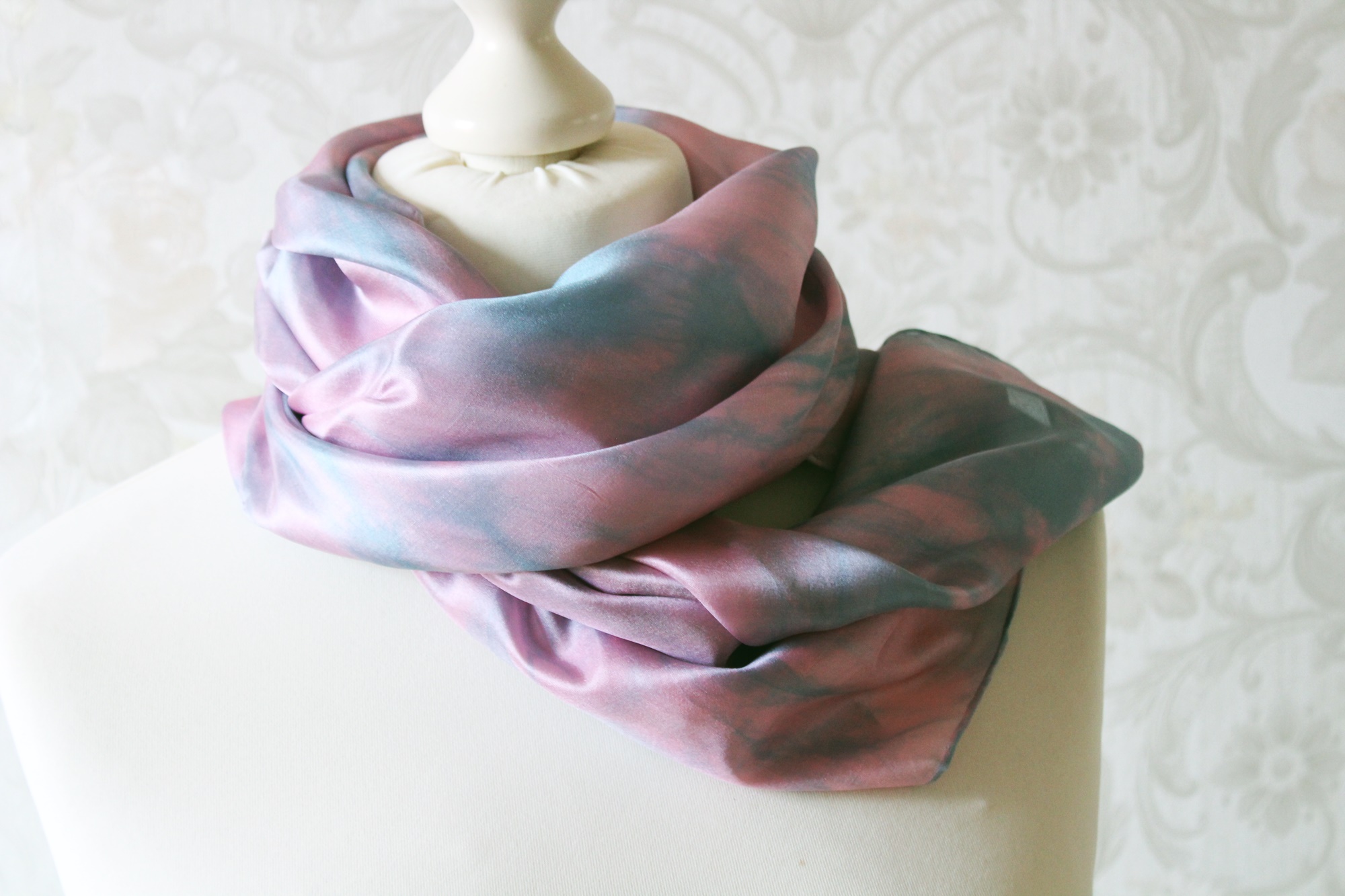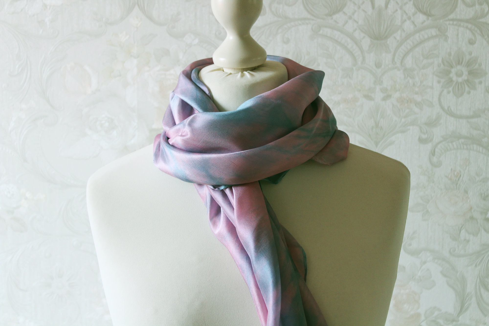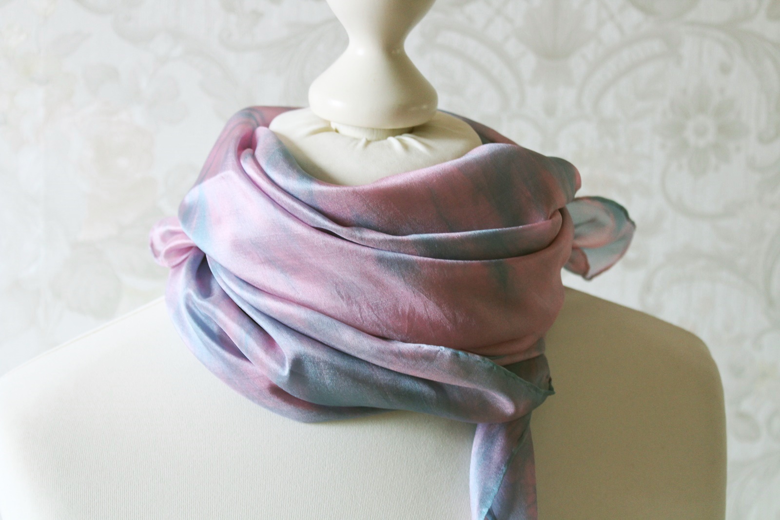 Das Tuch ist waschbar, Handwäsche wird empfohlen. Feucht bügeln. Wenn man es nicht bügelt hat man eine leichte Crash Optik. Ich habe den auch schon einmal vorgewaschen, damit keine überschüssigen Farbreste der Seide anhaften.