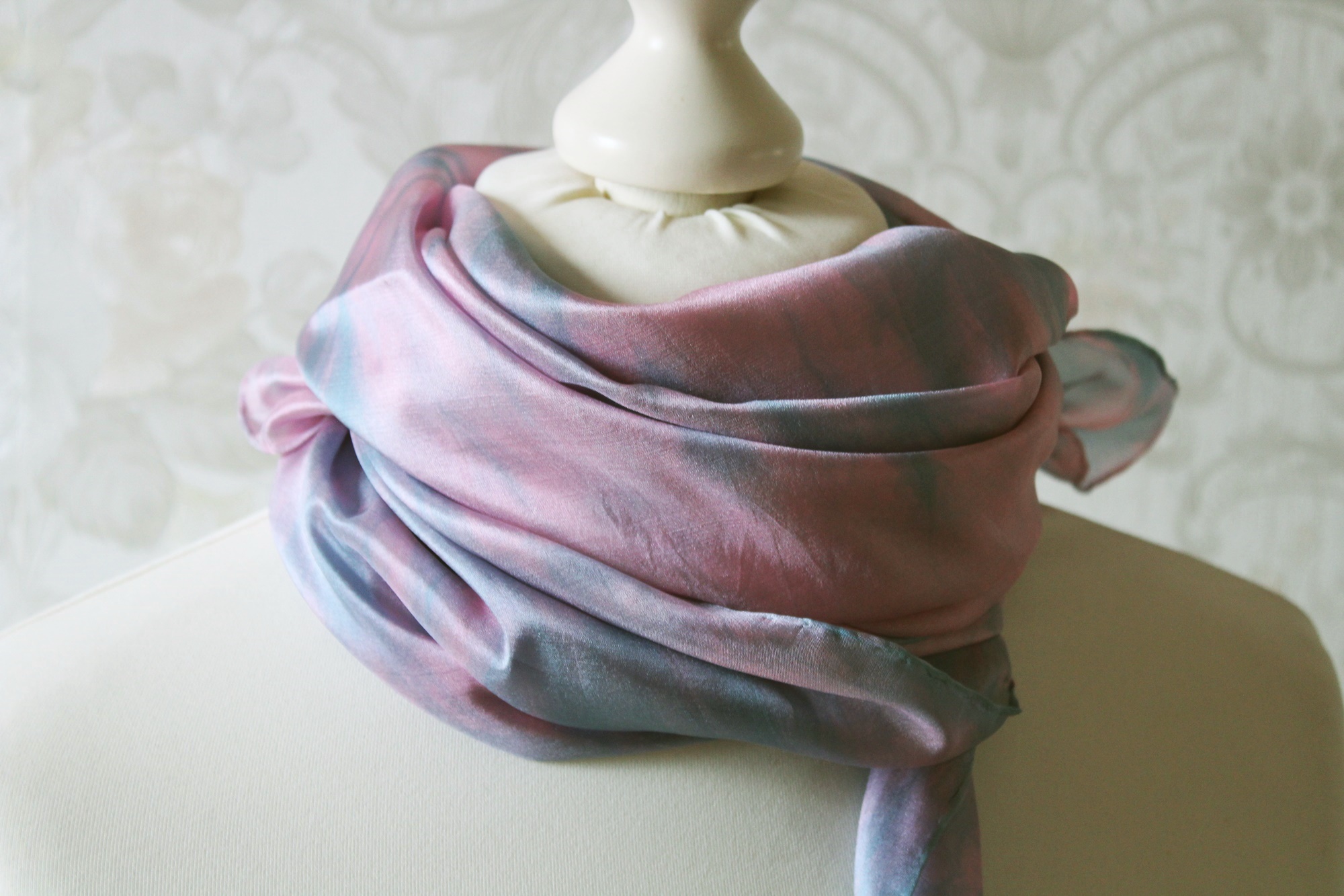 Seidentuch Fantasie in dezent rosa und türkisen Farbverläufen, ein handbemaltes Tuch aus Seide.