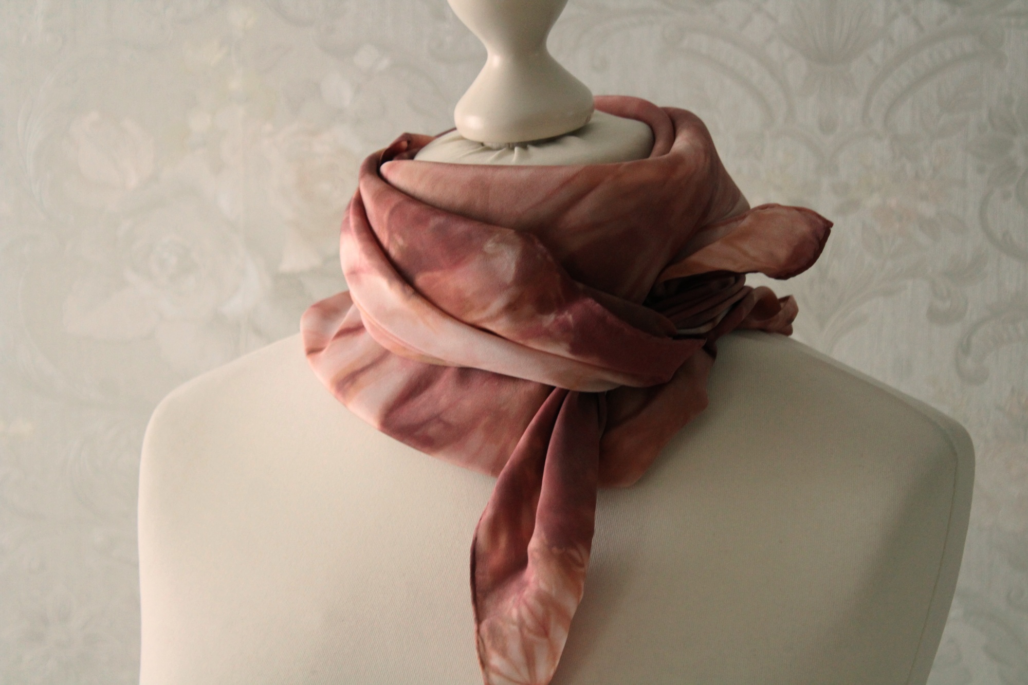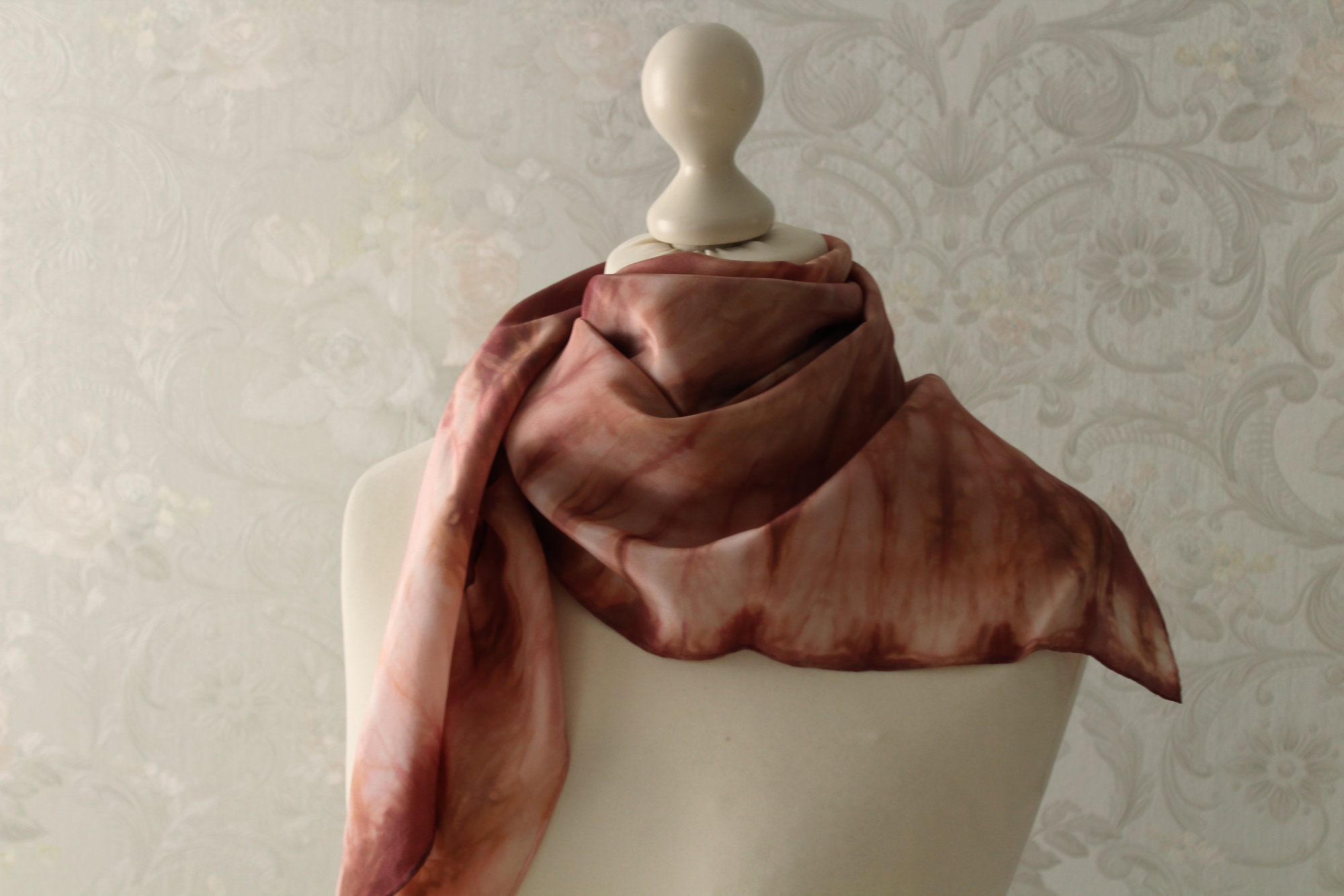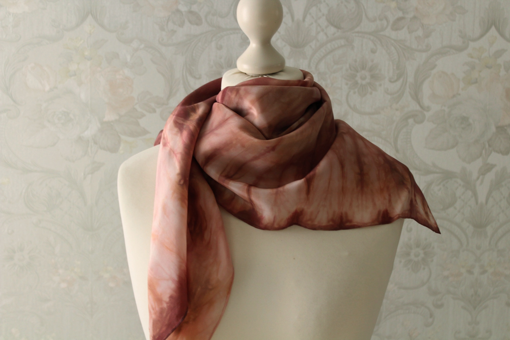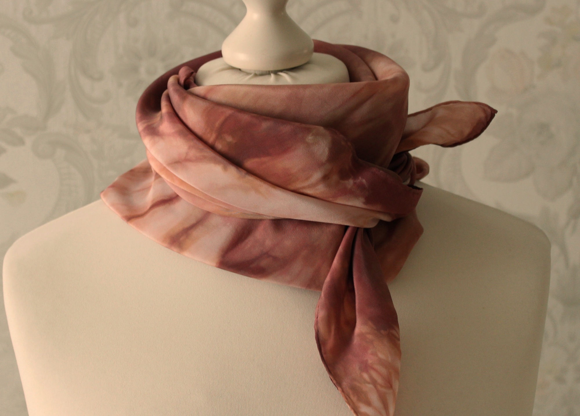 Das Seidentuch ist ca. 85 x 85 cm groß. Es kann verschieden gebunden getragen werden.
