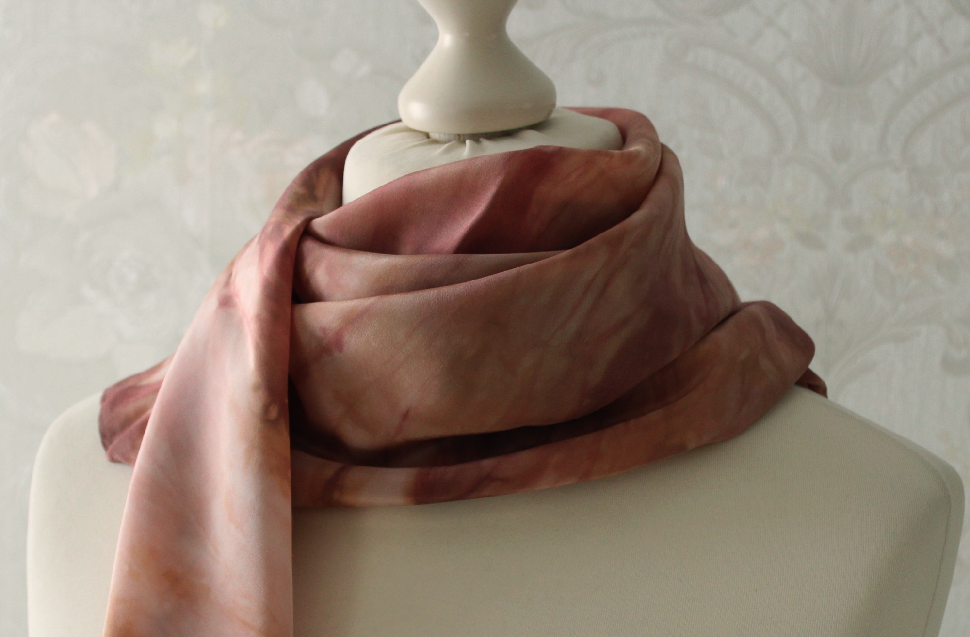Das Seidentuch ist waschbar, Handwäsche wird empfohlen. Feucht bügeln. Wenn man es nicht bügelt hat man eine leichte Crash Optik.